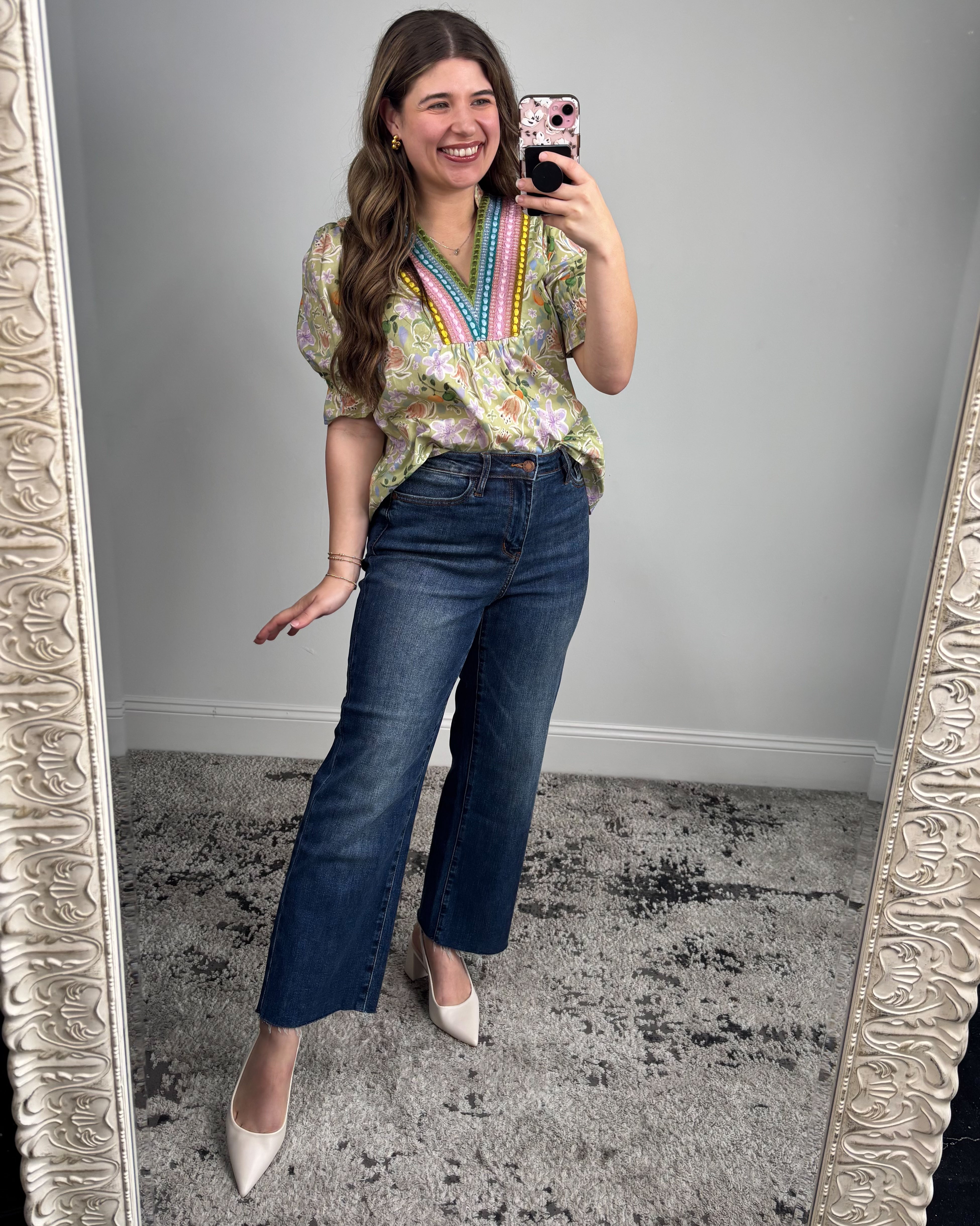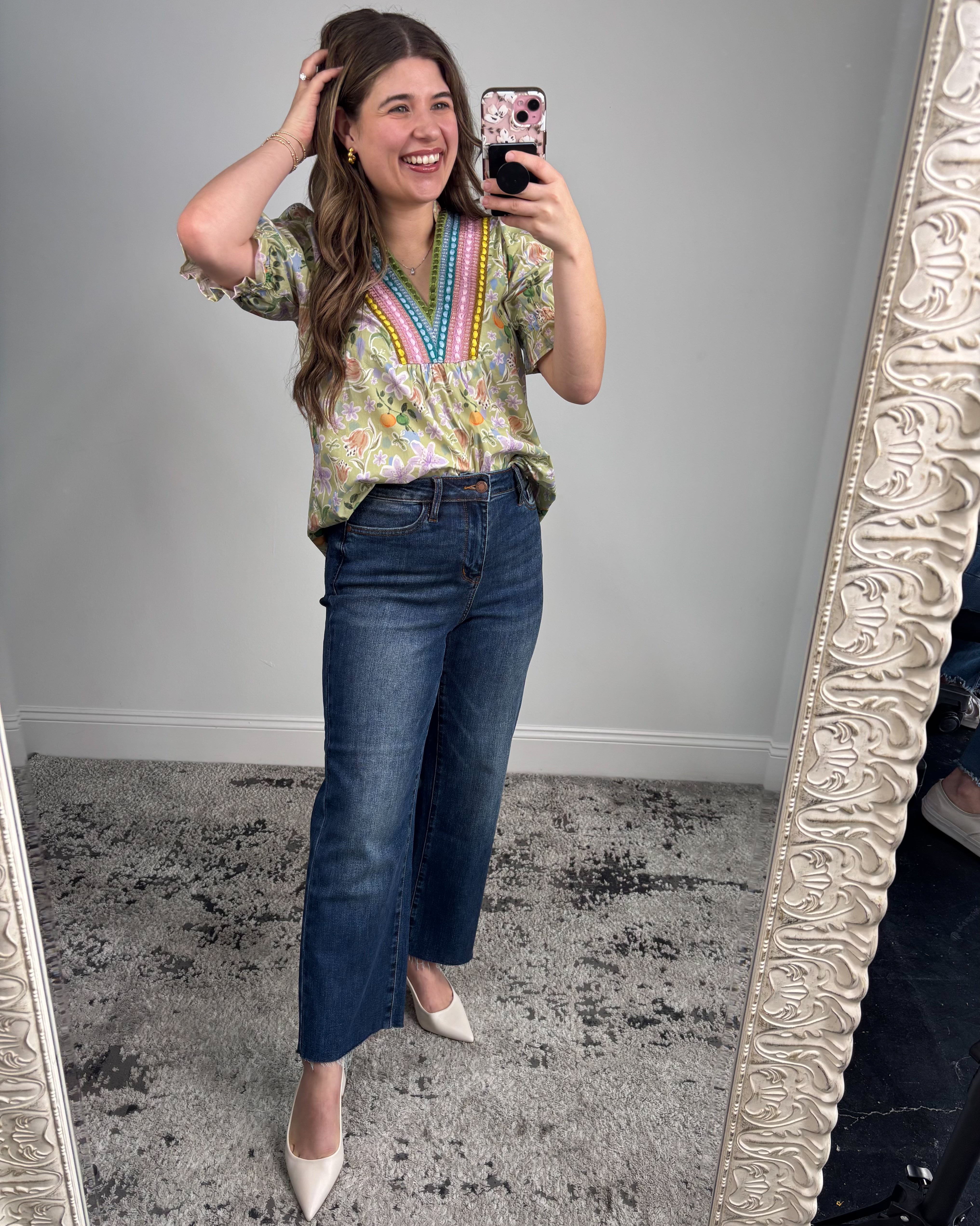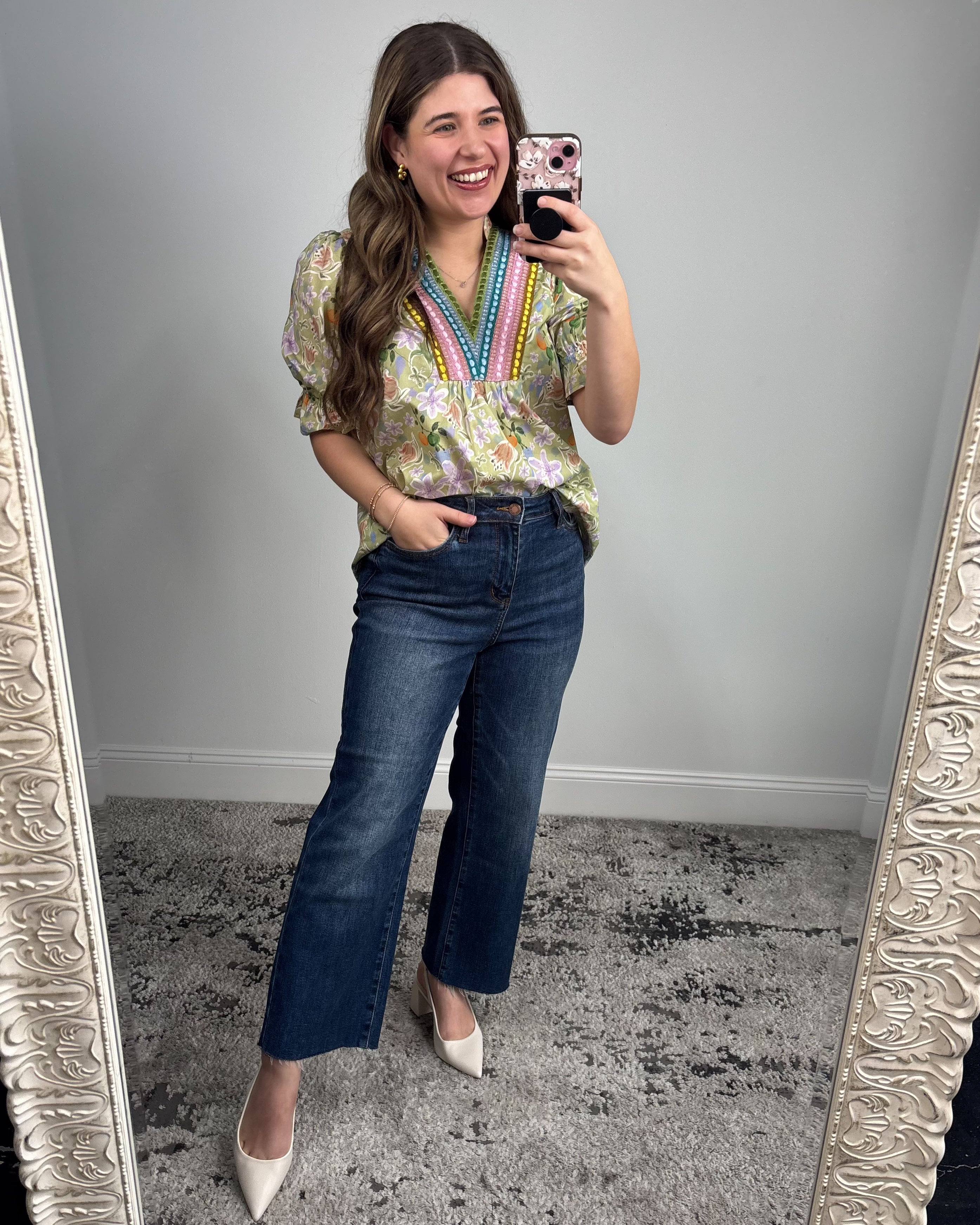 What truly sets this top apart is the beautifully detailed V-neck trim 💕 The multicolored woven detailing adds texture, dimension, and a subtle pop of color that draws the eye upward in the most flattering way. Paired with the gently gathered bodice, it creates a flowy silhouette that feels relaxed but still polished.