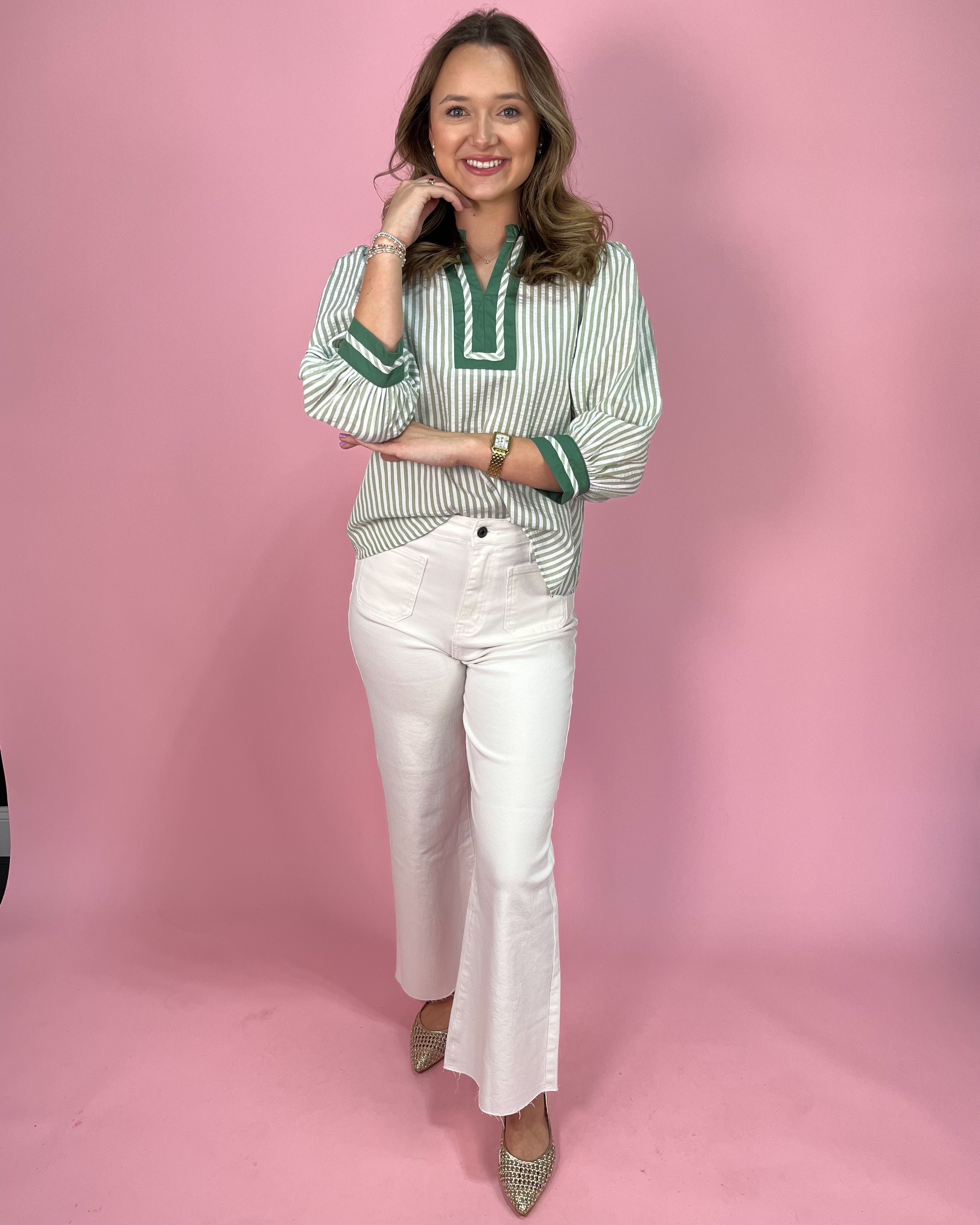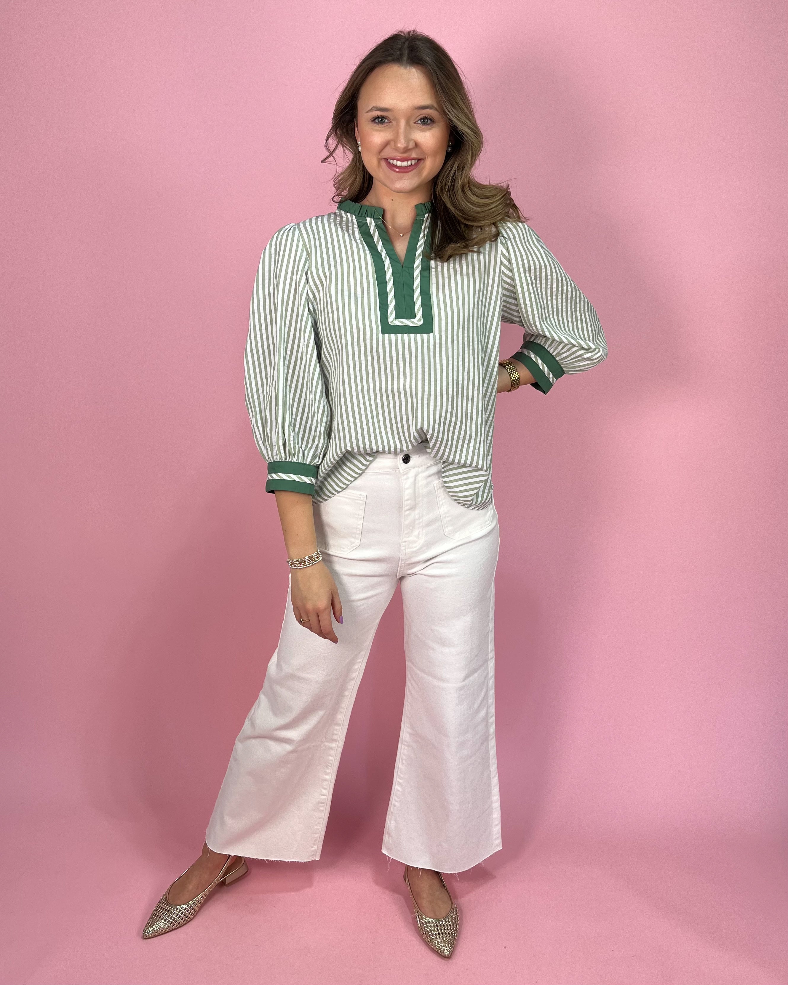 Fresh, classic, and effortlessly polished — this green and ivory stripe beauty is giving coastal charm with a tailored twist. The soft vertical stripes elongate the silhouette, while the rich green contrast trim adds that elevated boutique touch that makes it feel extra special.