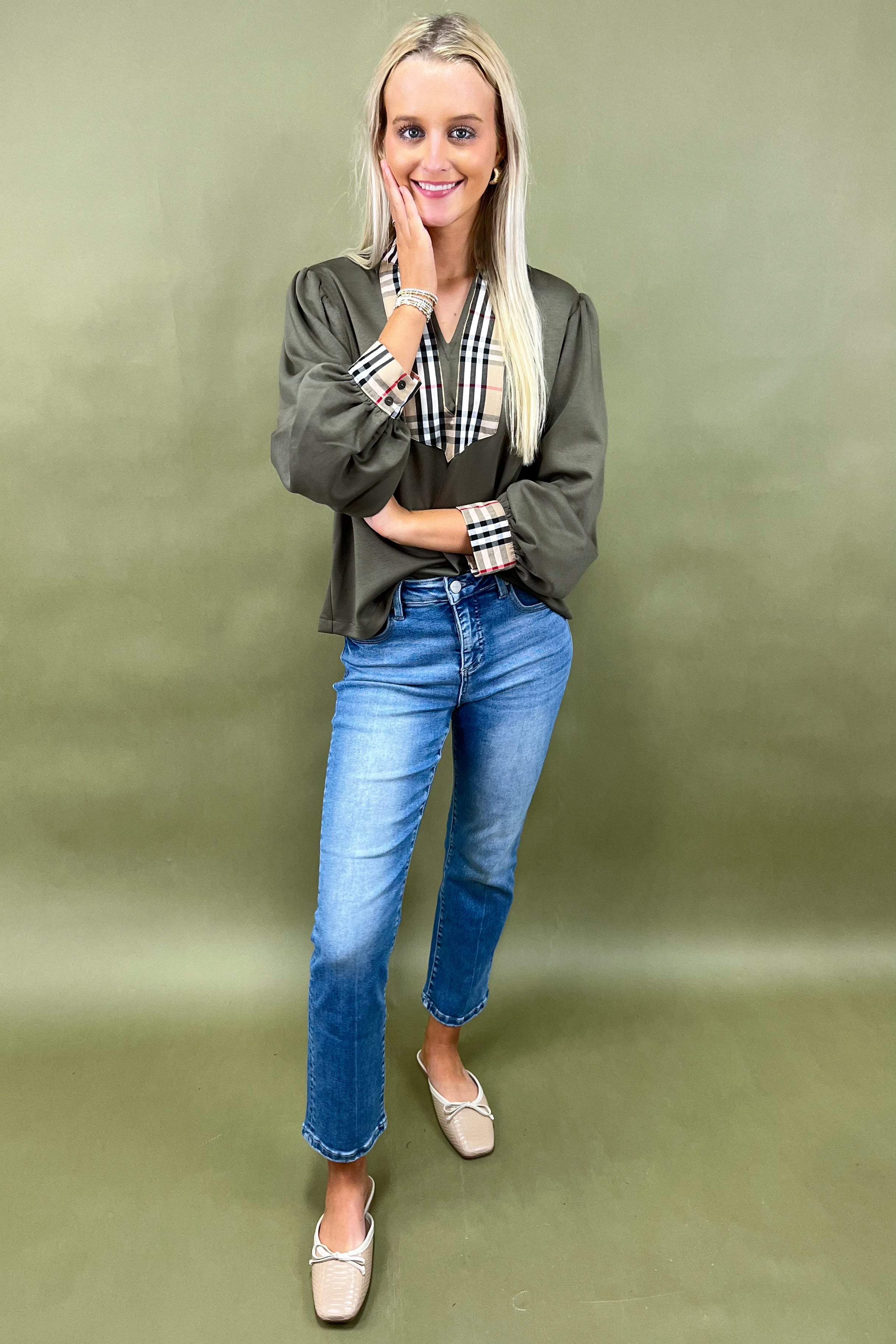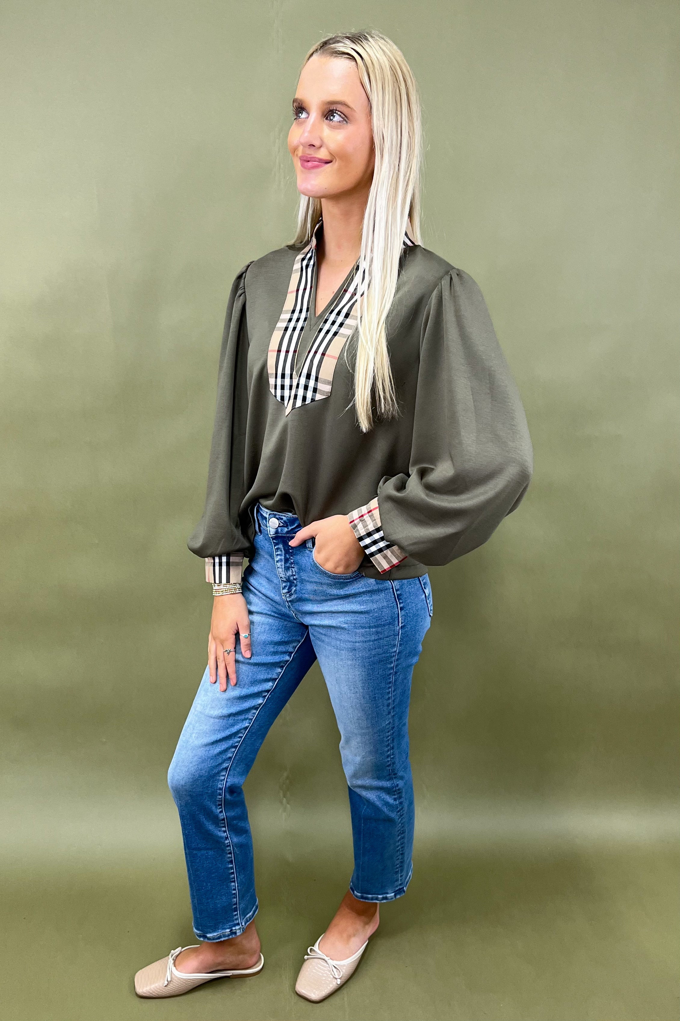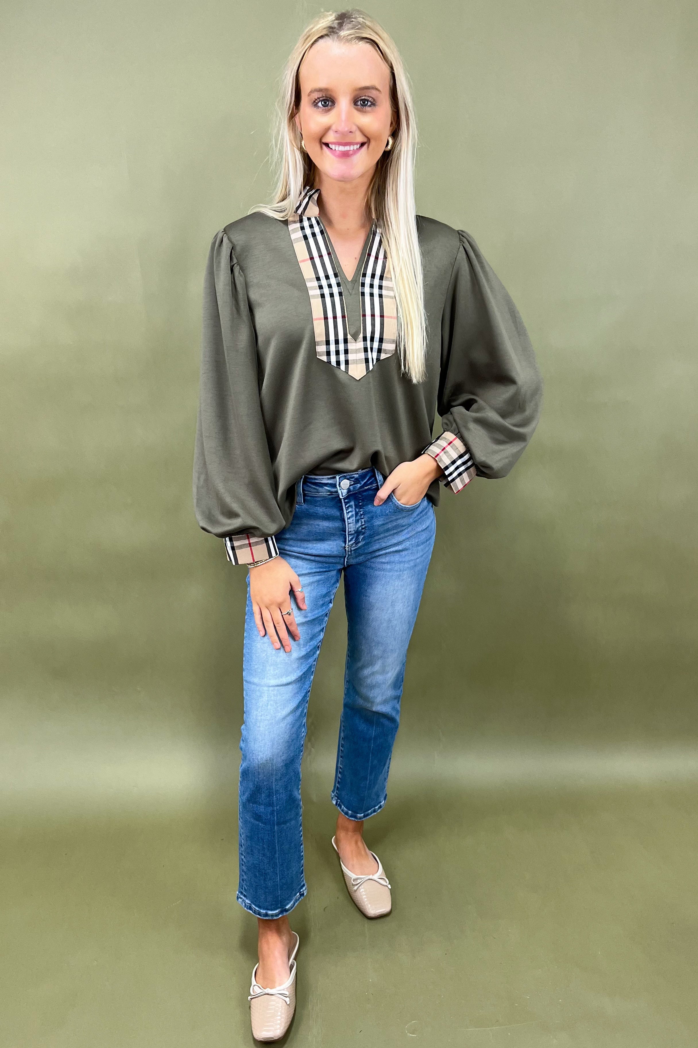 This isn’t your average blouse — it’s the piece you’ll reach for when you want to look like you spent time on your outfit (even if you didn’t). With its tailored plaid contrast details, luxe olive hue, and puff-sleeve silhouette, this top is serving timeless charm with a modern twist. Whether you’re heading to brunch, the office, or just running errands in style, this one’s got your back — and your best angles. 😍