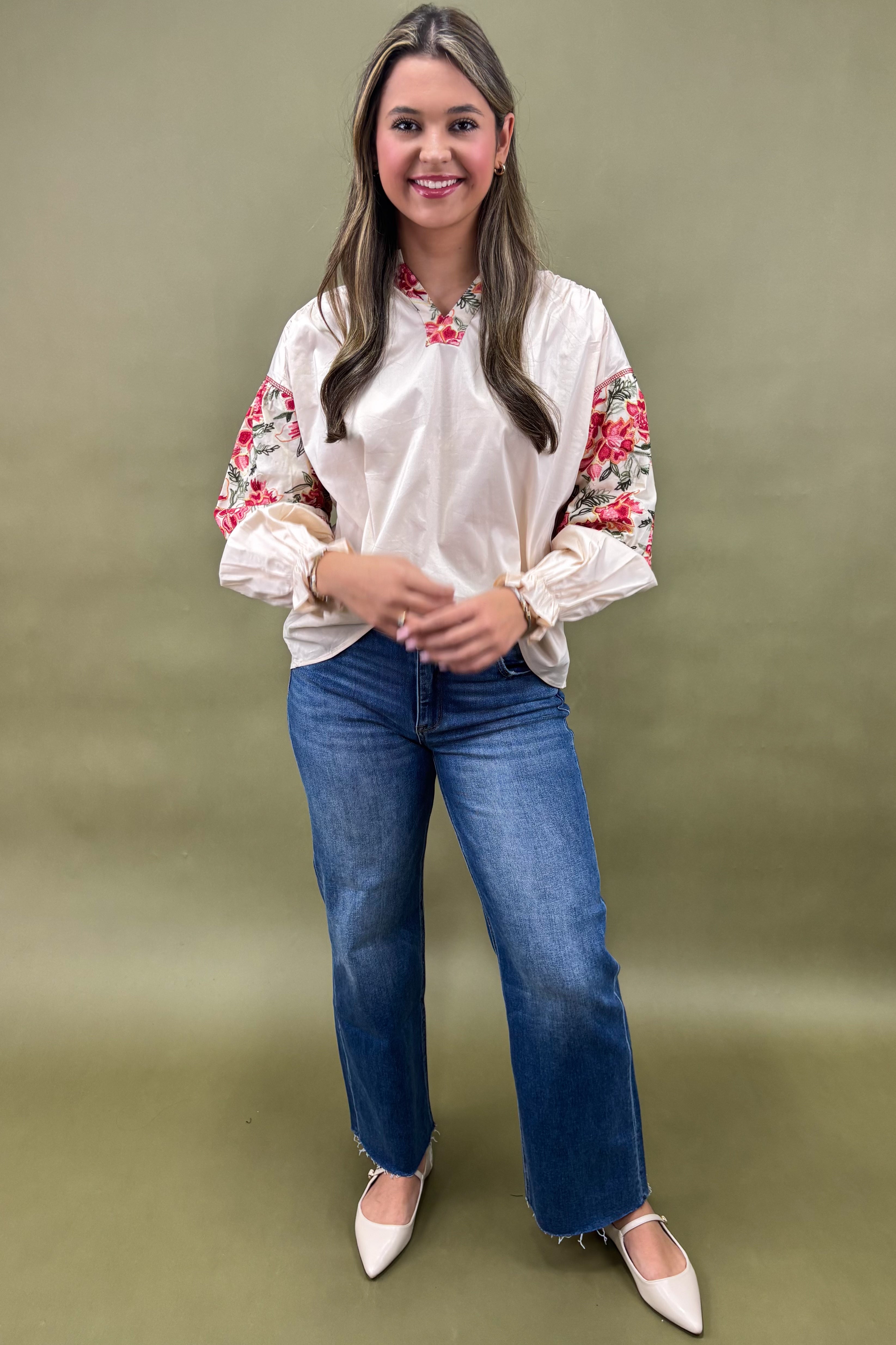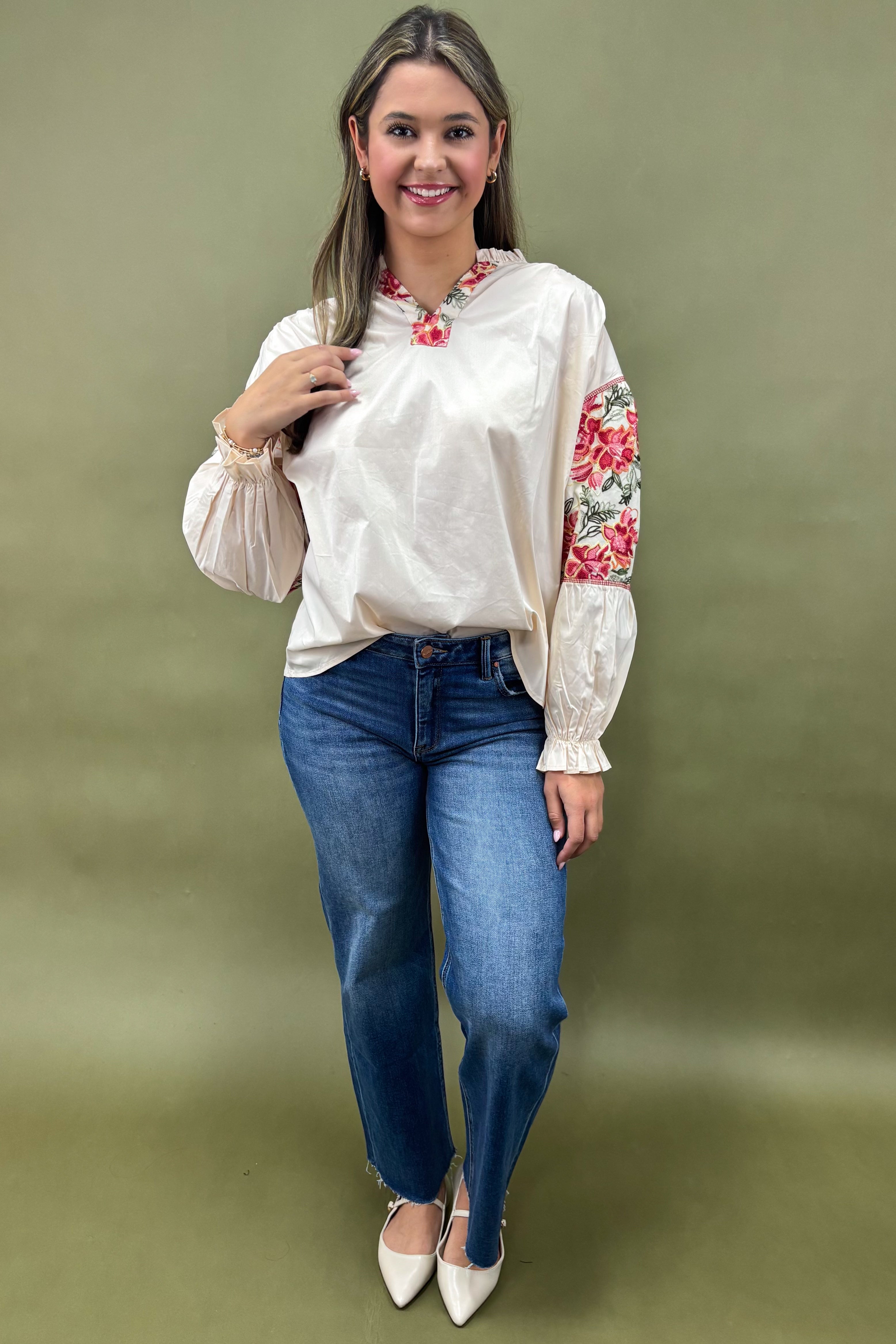 The neckline features a split-V design framed by vibrant floral embroidery, instantly drawing the eye upward and adding a touch of artisanal craftsmanship. The embroidery continues down the voluminous sleeves, giving this top a unique, statement-making quality while still keeping it soft and wearable. The sleeves are finished with elasticized cuffs and gentle ruffle detailing, creating a balanced silhouette that feels both playful and polished.