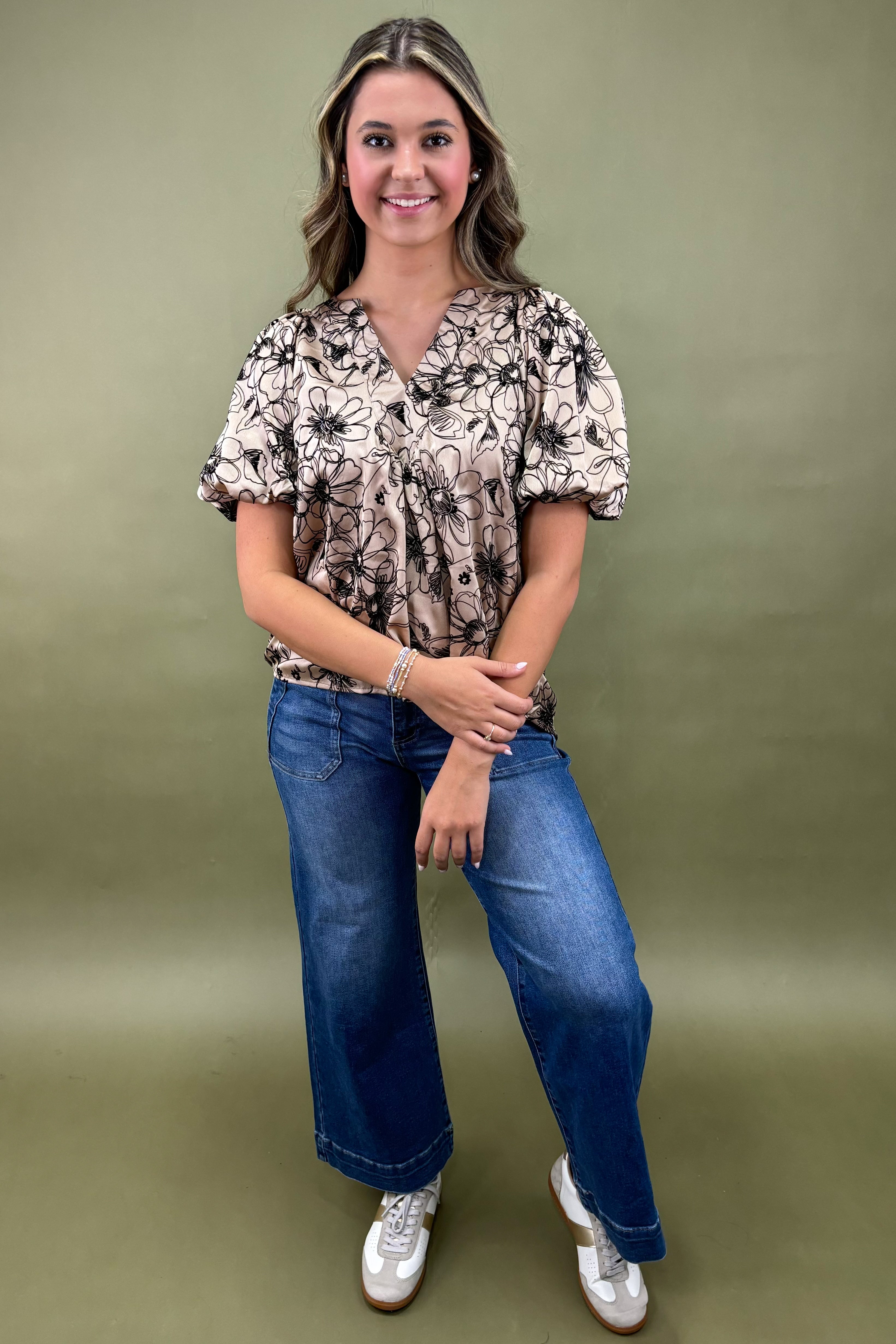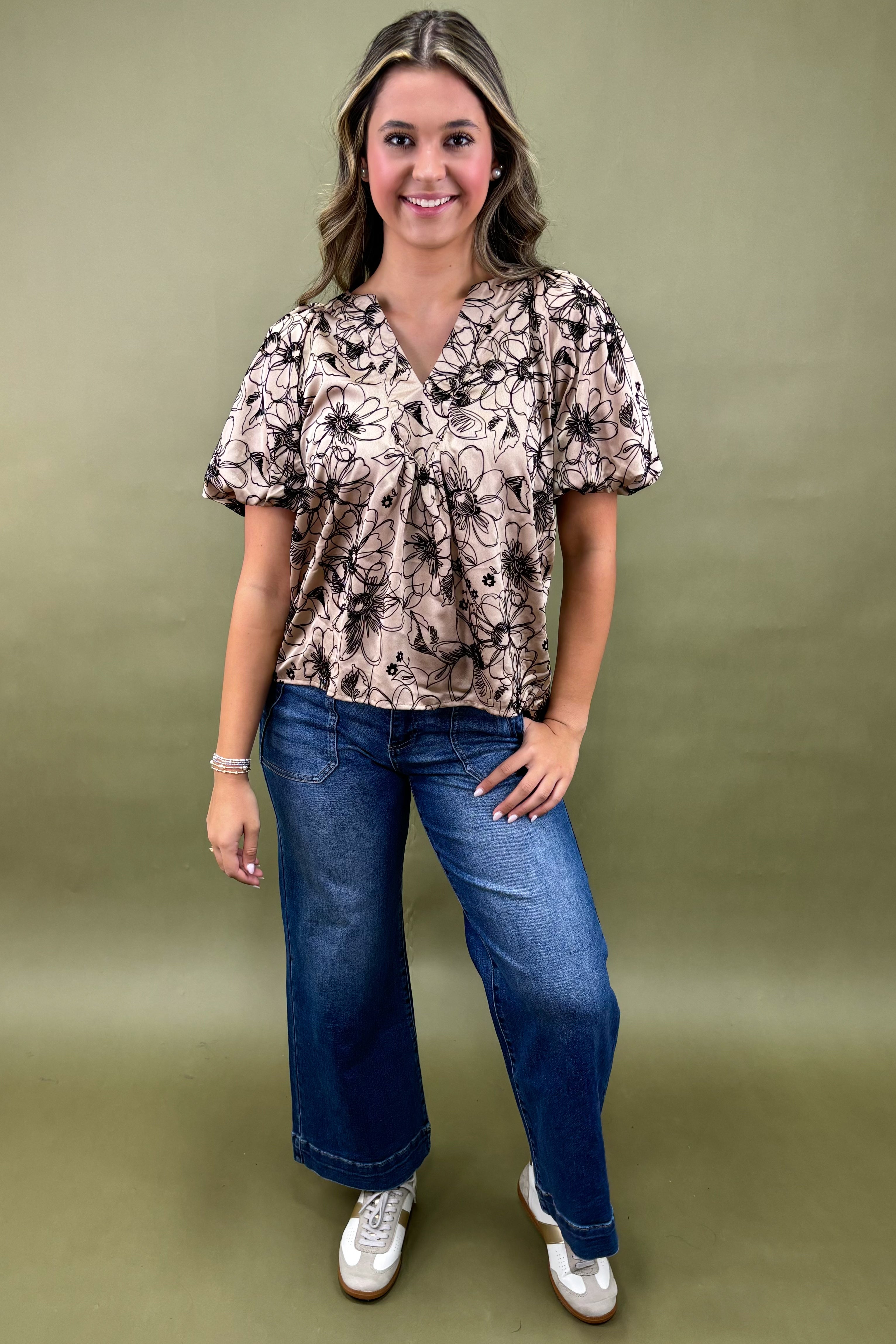 This top is made for versatility. Whether you’re heading to a special dinner, a night out, or even pairing it with chic office wear, the Prosecco & Petals Puff Sleeve Top adapts beautifully. Dress it up with a sleek pencil skirt and heels for a polished, evening-ready outfit. Style it with distressed denim and ankle boots for a cool, modern contrast. Or lean into its romantic vibes with wide-leg trousers and statement earrings for an elevated, fashion-forward ensemble.