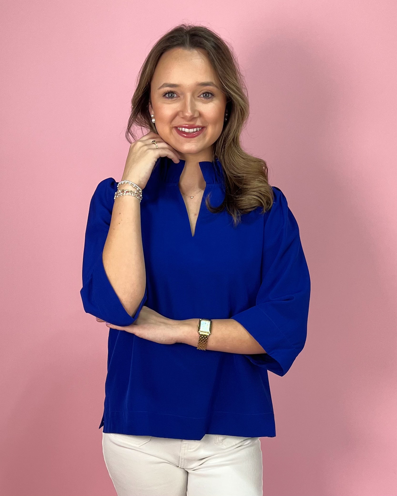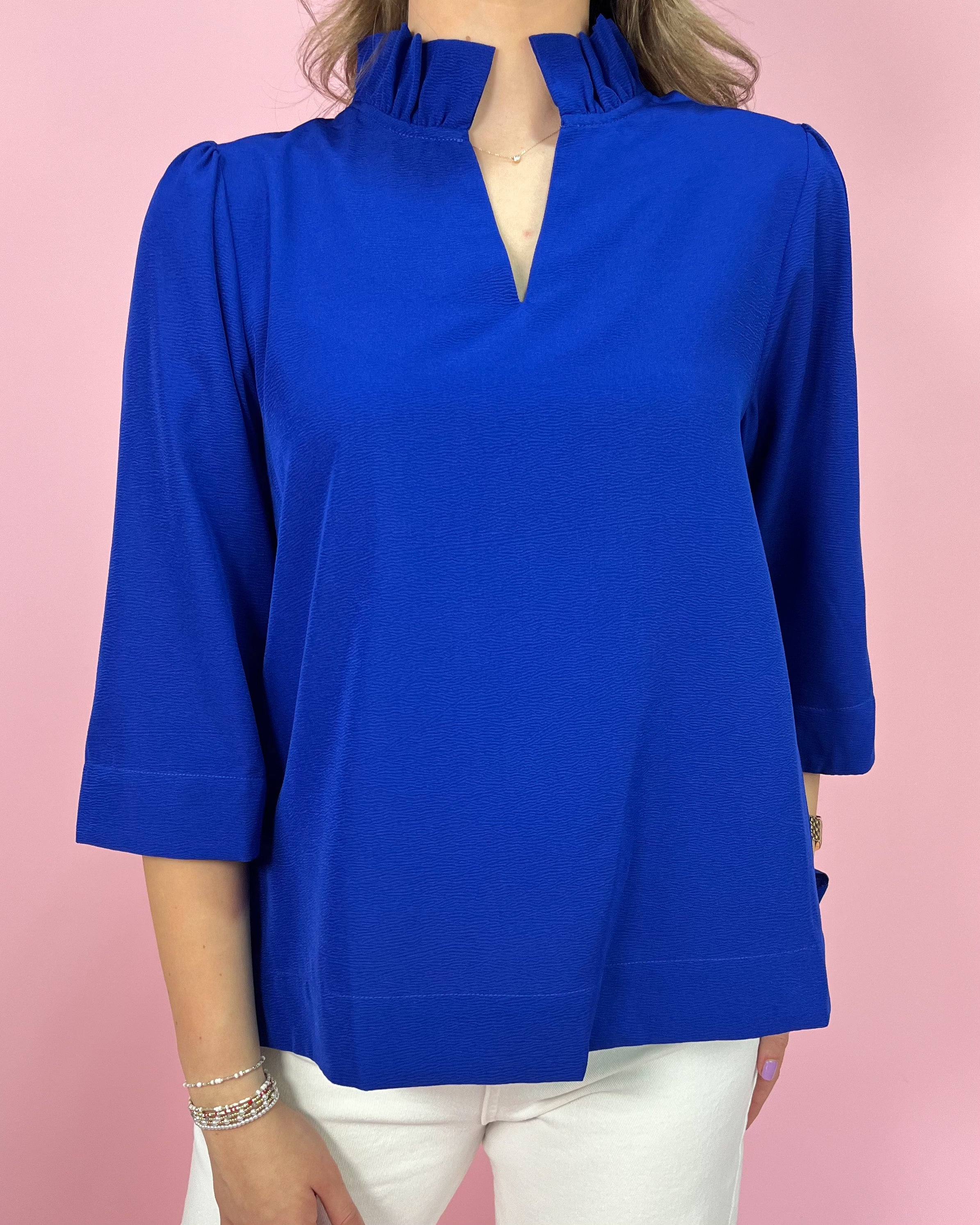 Bold, confident, and effortlessly polished — this royal blue blouse is made to stand out. The rich saturated color paired with the soft textured fabric gives it dimension and movement, while the ruffled mock neckline adds just the right amount of feminine detail.