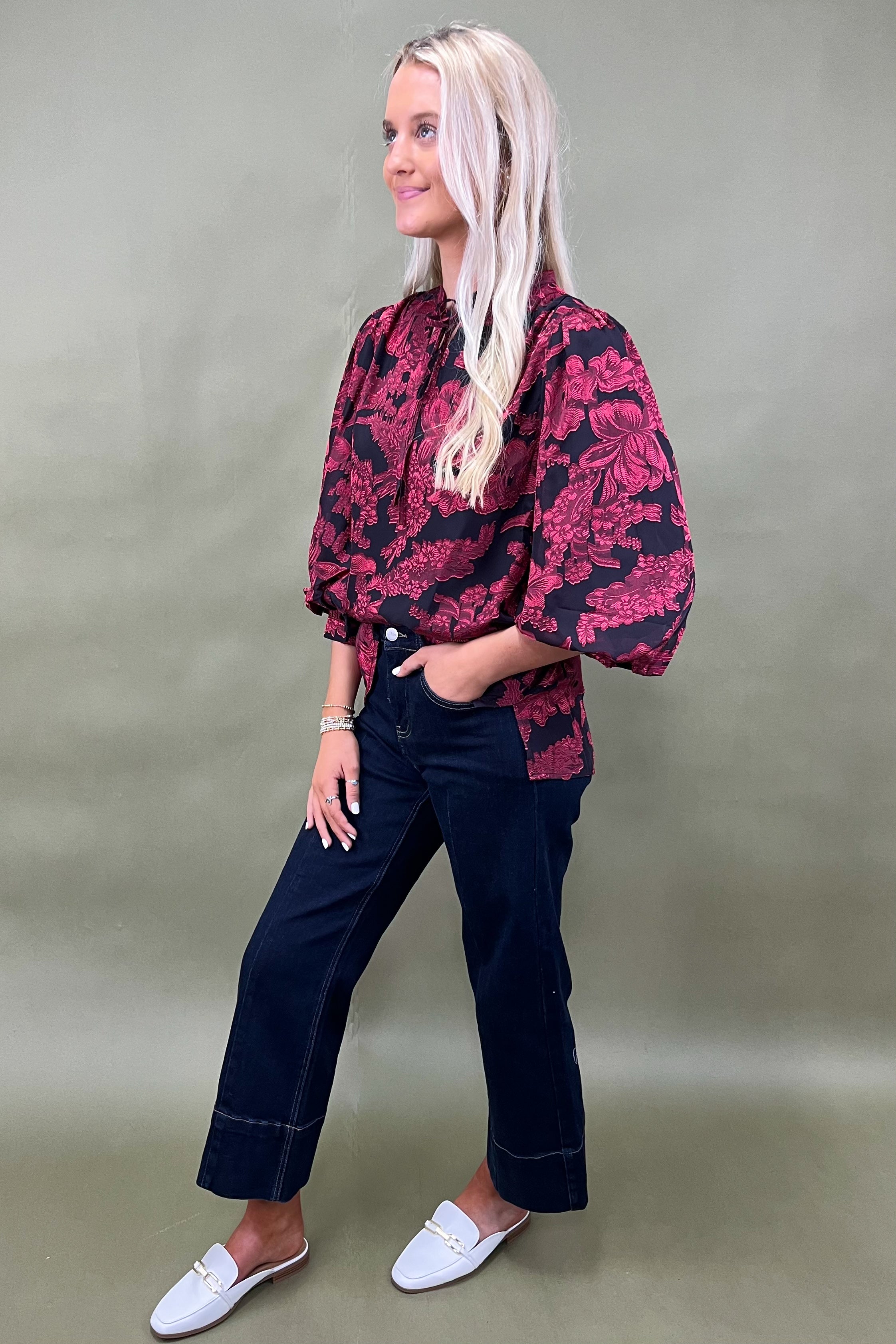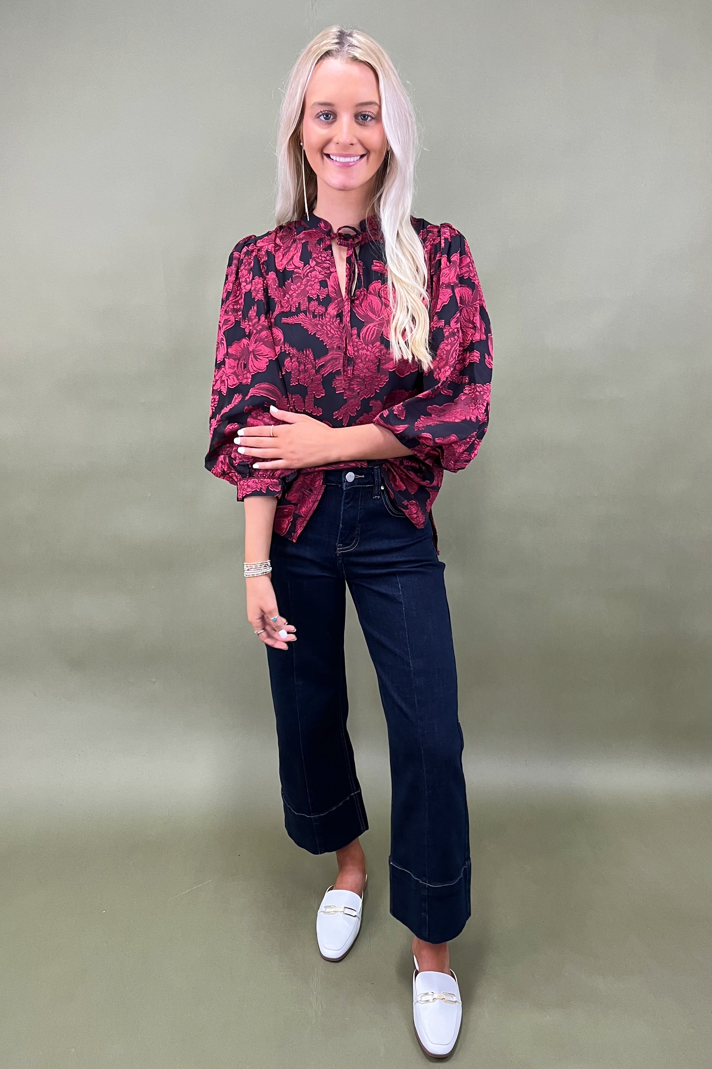Romance, but make it wearable. đ Our Ruby Reverie Tie-Front Top is that magical blend of sultry sophistication and everyday chicâthe kind of piece that makes you feel instantly put together the second you slip it on. Designed with a deep black base kissed with lush ruby-red florals in a raised, jacquard-style texture, this top is pure drama in the best way possible. Whether youâre heading to a candlelit dinner, a holiday soirĂ©e, or just want to add a little flair to your jeans-and-heels combo, this top is the showstopper your closet has been waiting for. âš