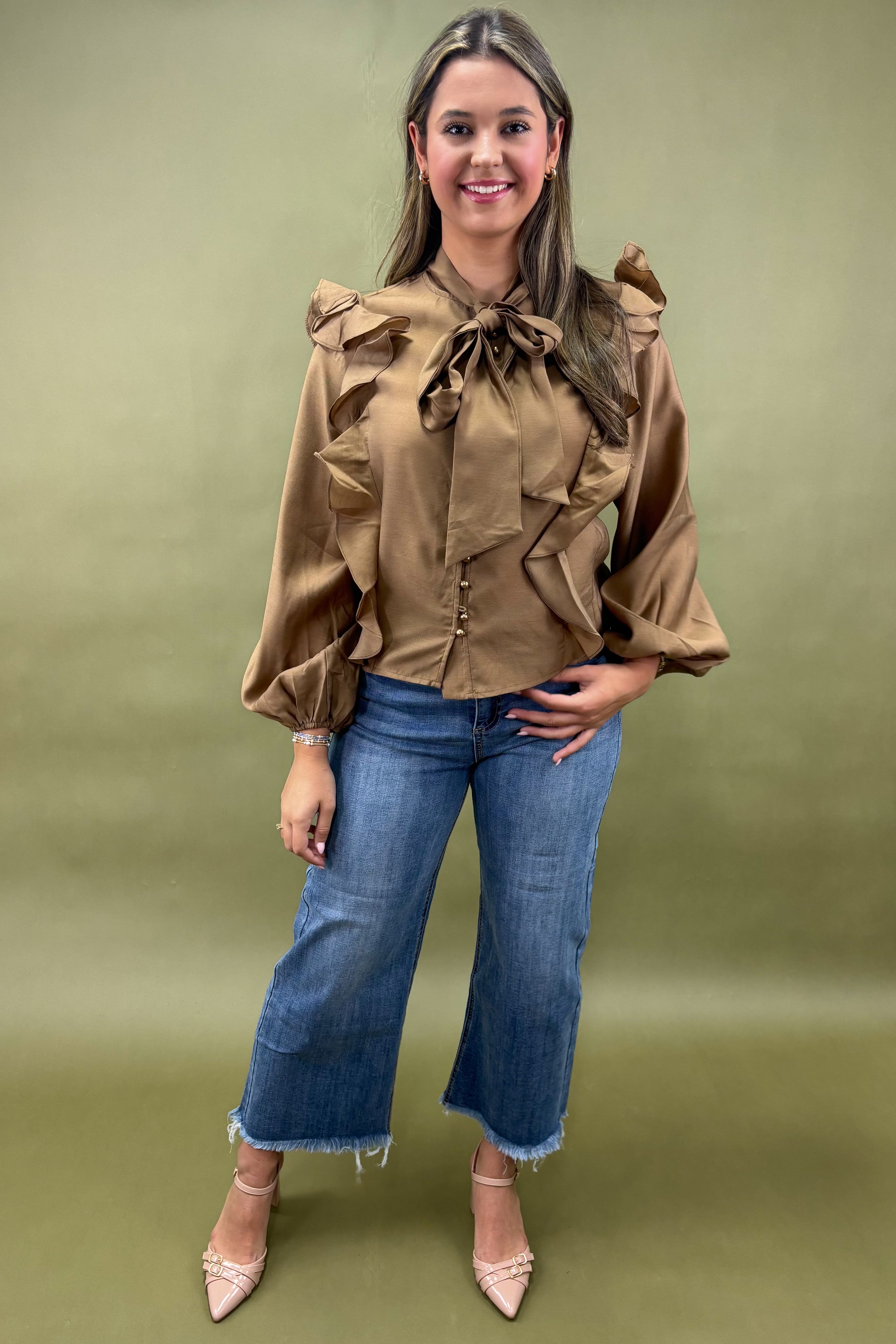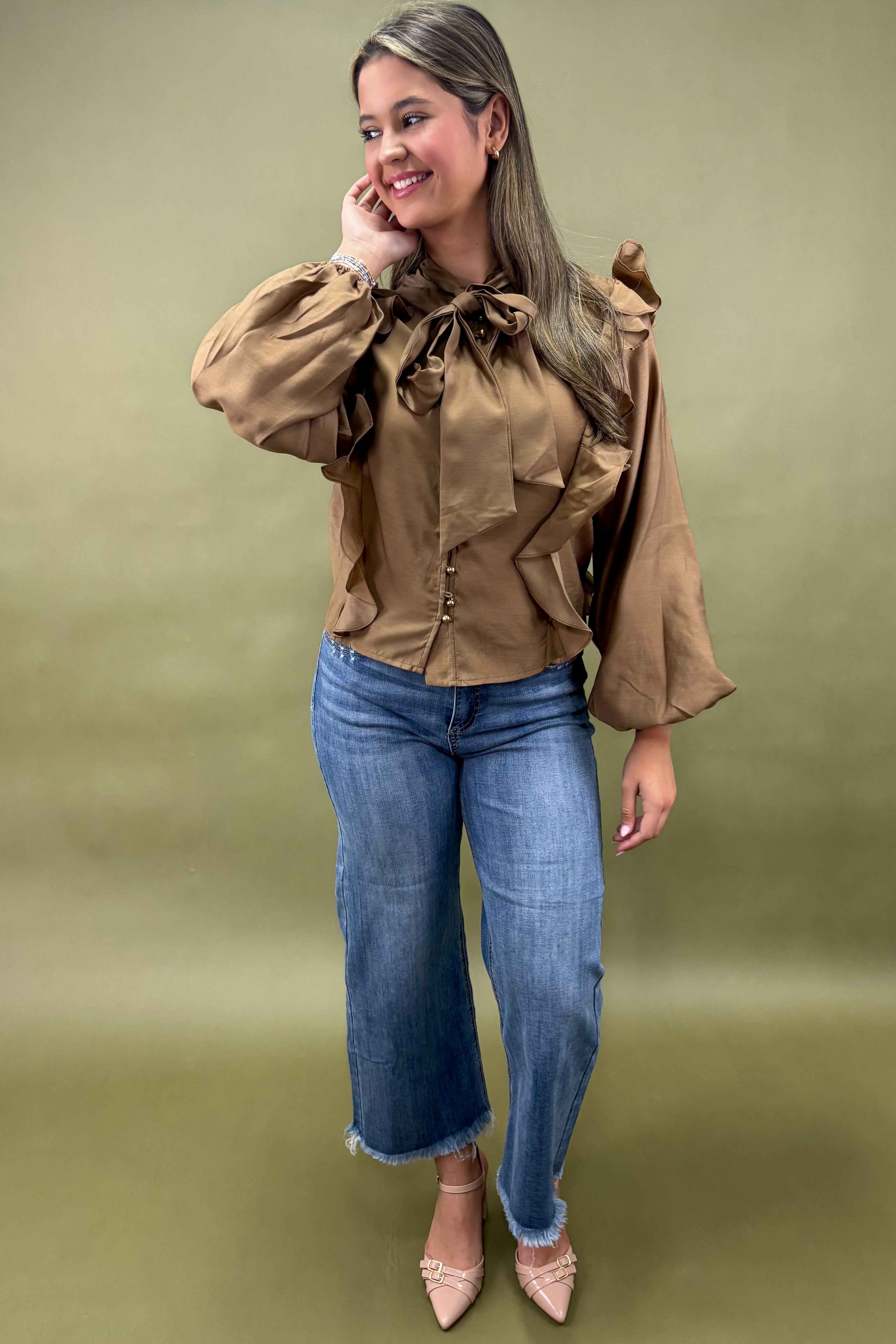 This blouse is giving: romantic heroine in a period drama meets modern-day boss babe. It’s a piece that says: “I came to slay, but also to sip coffee with elegance.” ☕✨ The ruffles keep it playful, the bow tie adds sophistication, and the neutral caramel color makes it versatile for any season.