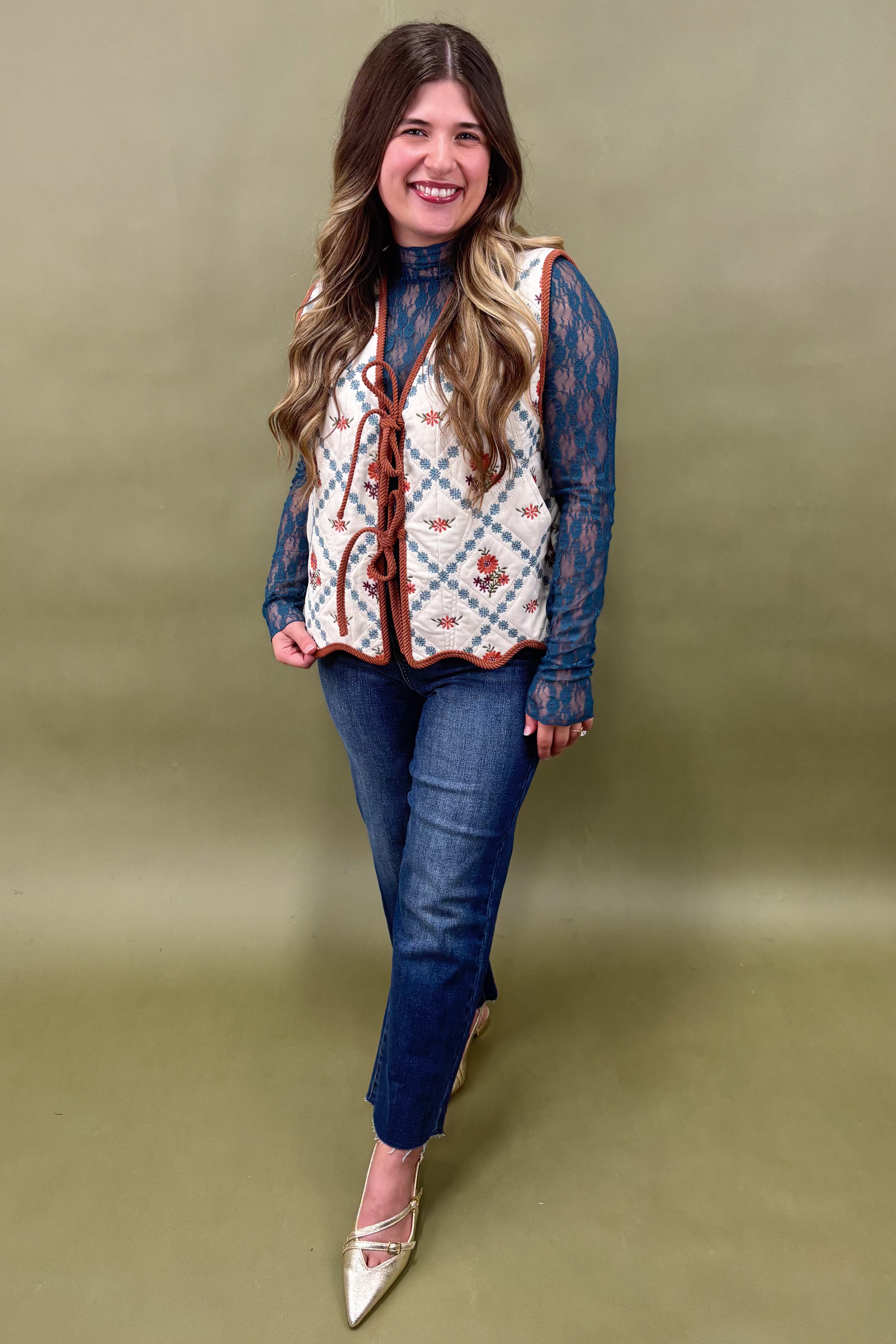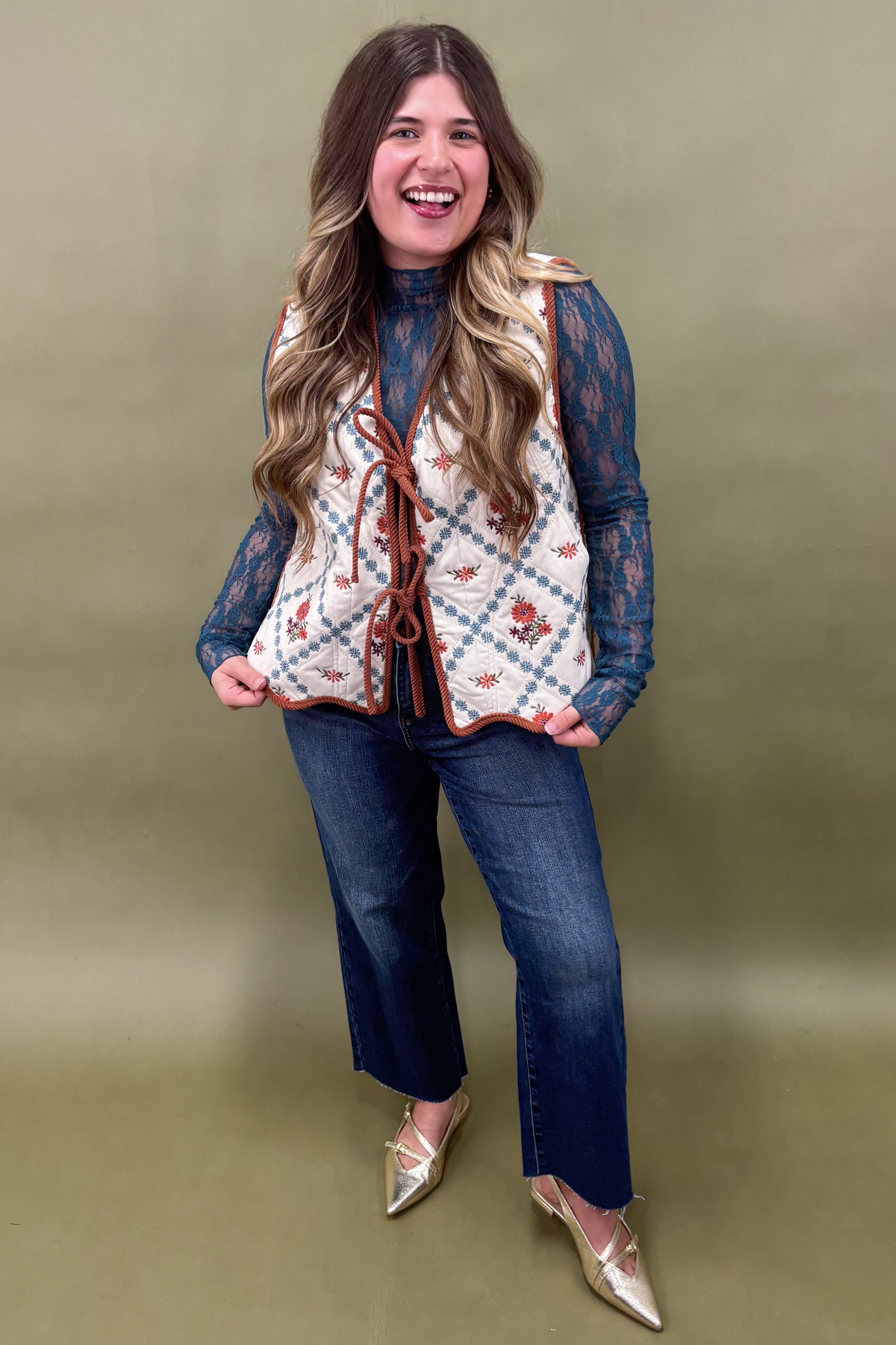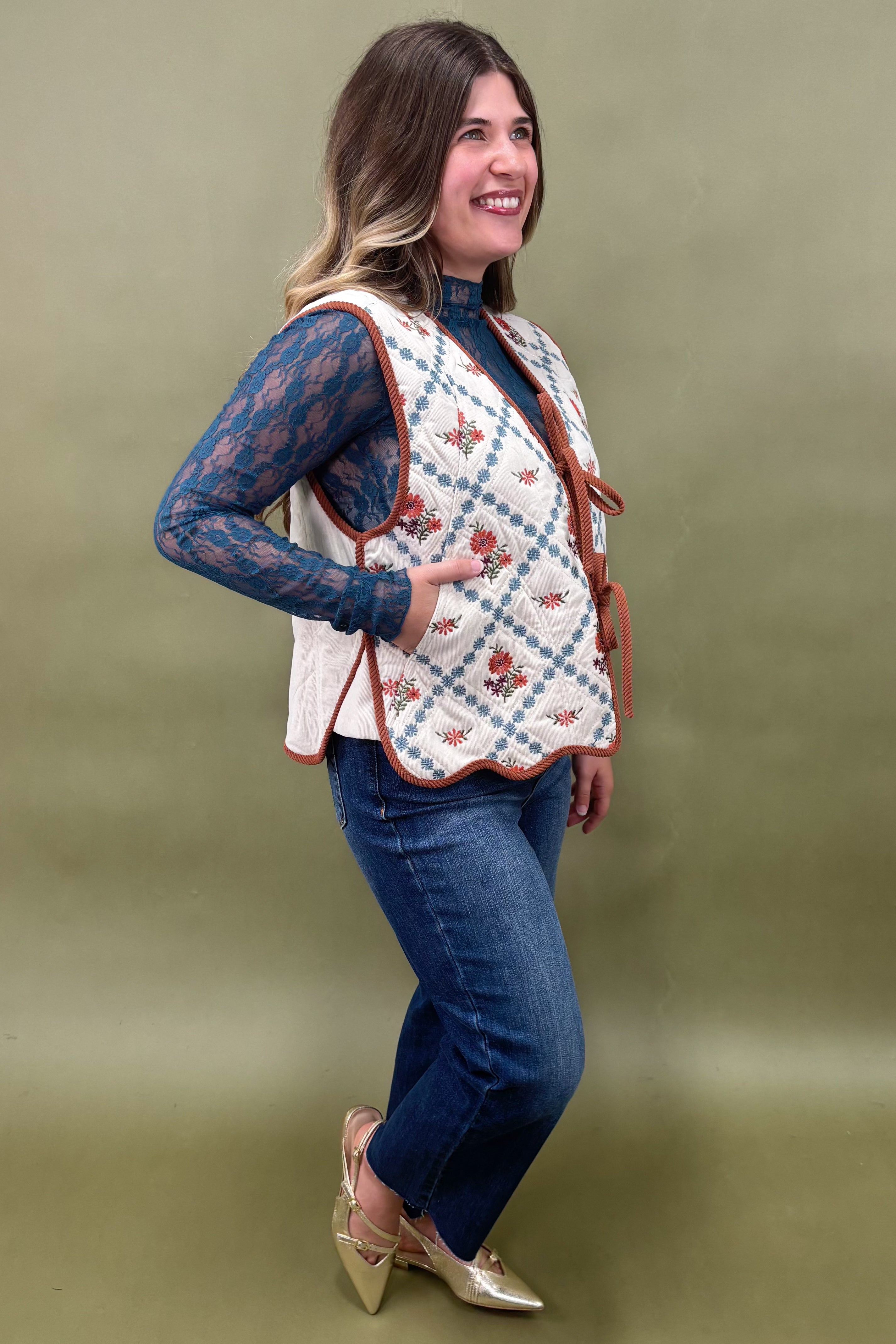 The first thing you’ll notice is its quilted construction. Featuring diamond-stitched panels, the vest offers a touch of texture and dimension that feels timeless. The cream background provides the perfect canvas for the delicate floral embroidery, which is scattered across the surface like a garden in bloom. Tiny blossoms in shades of red, blue, and soft green create a hand-crafted, artisan feel that instantly elevates this piece.