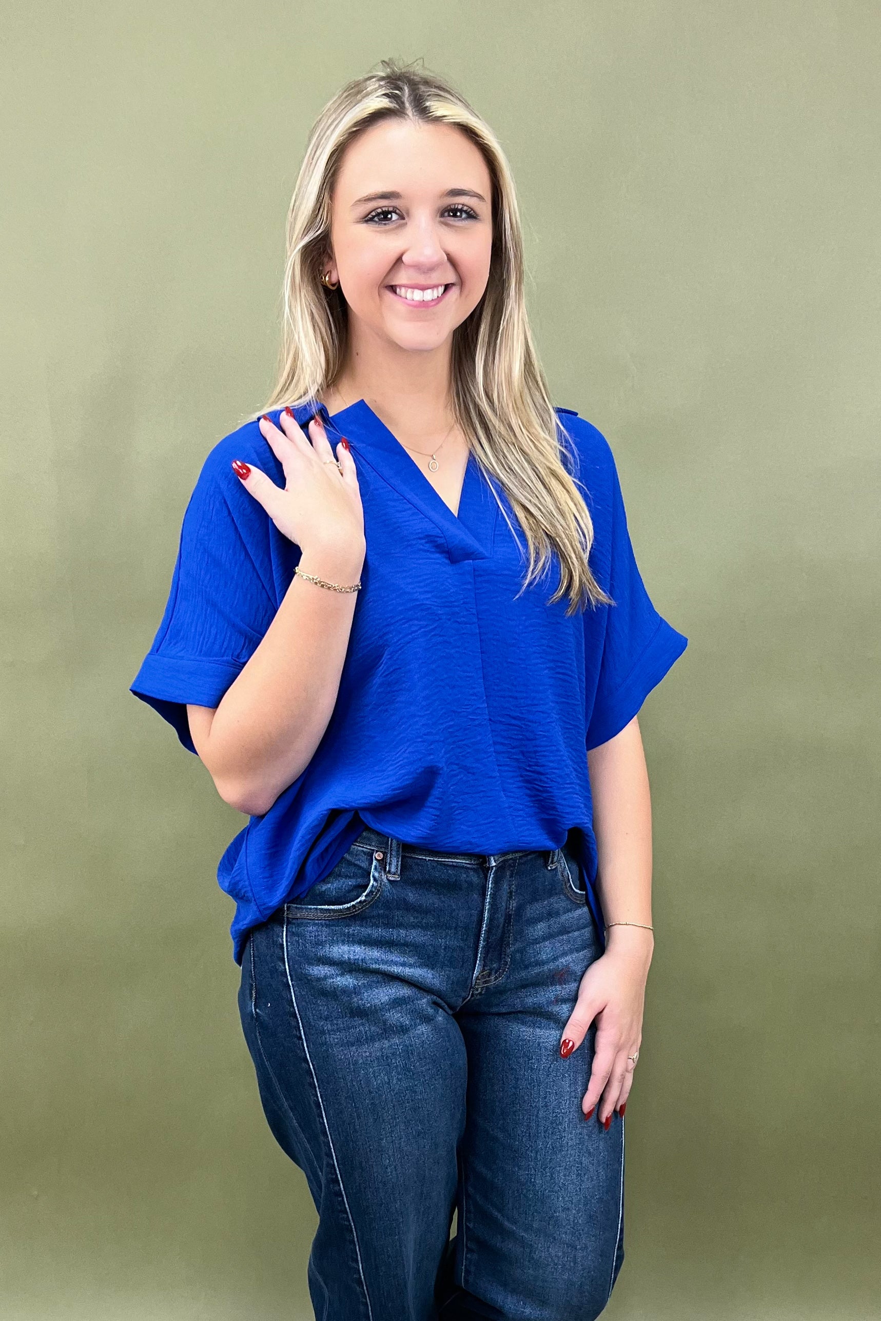 The Sapphire Skies Top isn’t just another “basic blouse.” It’s that bold pop of color that turns an everyday outfit into something memorable. The saturated cobalt shade works beautifully across skin tones, making it universally flattering. It’s bold but not overwhelming—just enough to bring that spark of confidence when you slip it on.Plus, this is one of those pieces that will travel well—the crinkled texture means less stress about wrinkles, and the fabric’s slight stretch makes it comfy whether you’re headed to brunch, a boardroom, or boarding a plane. It’s timeless, chic, and oh-so-versatile.