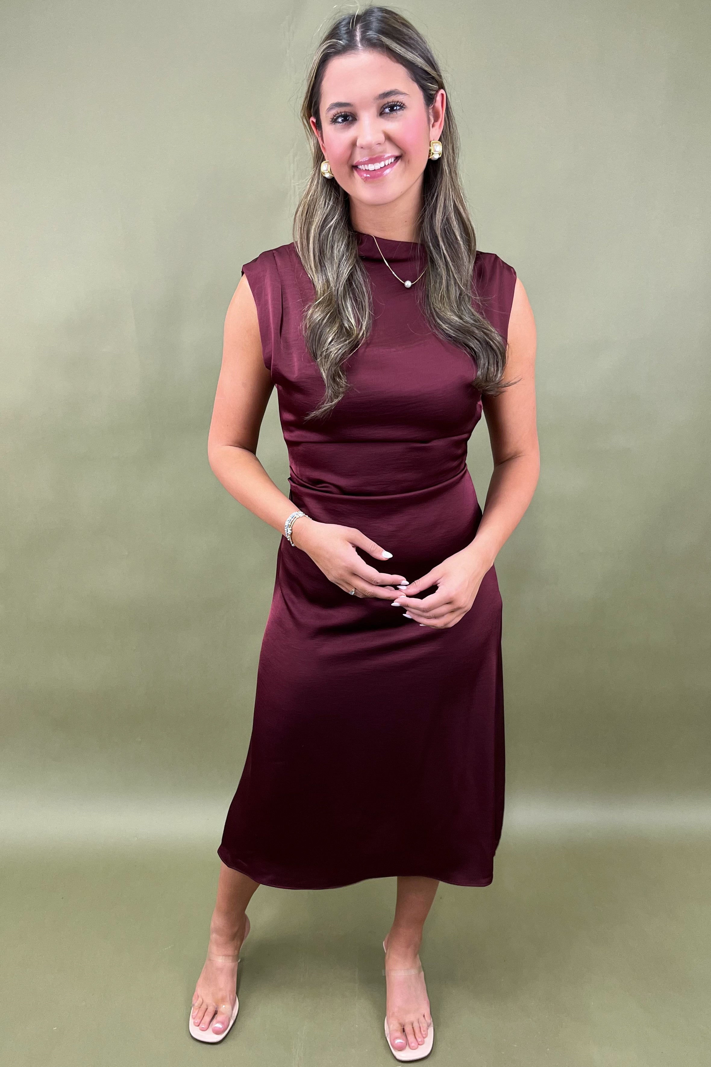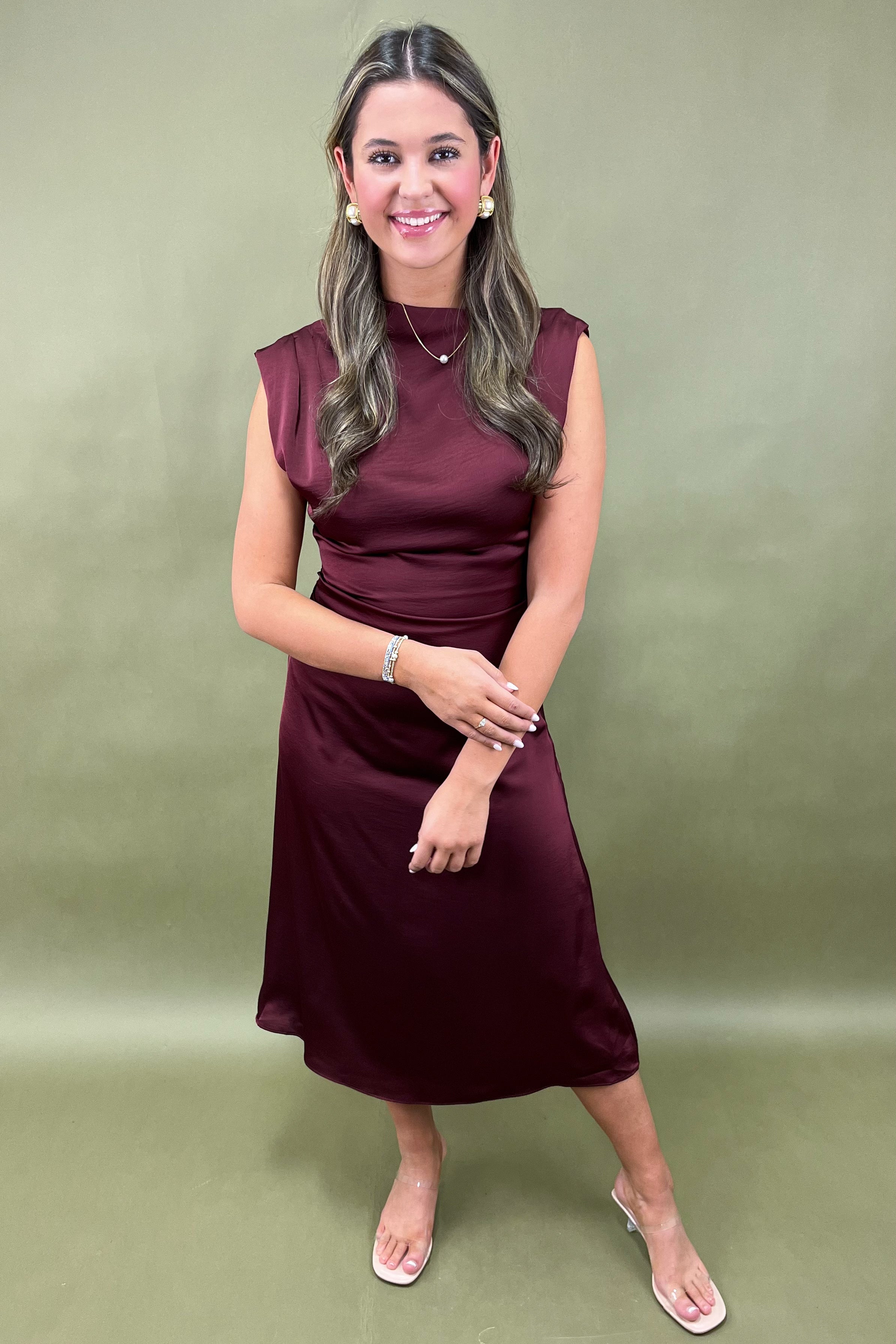 The asymmetrical neckline adds that unexpected detail that sets this piece apart — subtly modern, totally flattering, and just the right amount of sultry. The sleeveless design gives it an elongated, graceful line through the arms and shoulders, while the side ruching creates a naturally slimming effect that highlights your shape in all the right ways 🍷. The midi length is pure perfection — long enough for sophistication, but still playful enough to show off your favorite heels.