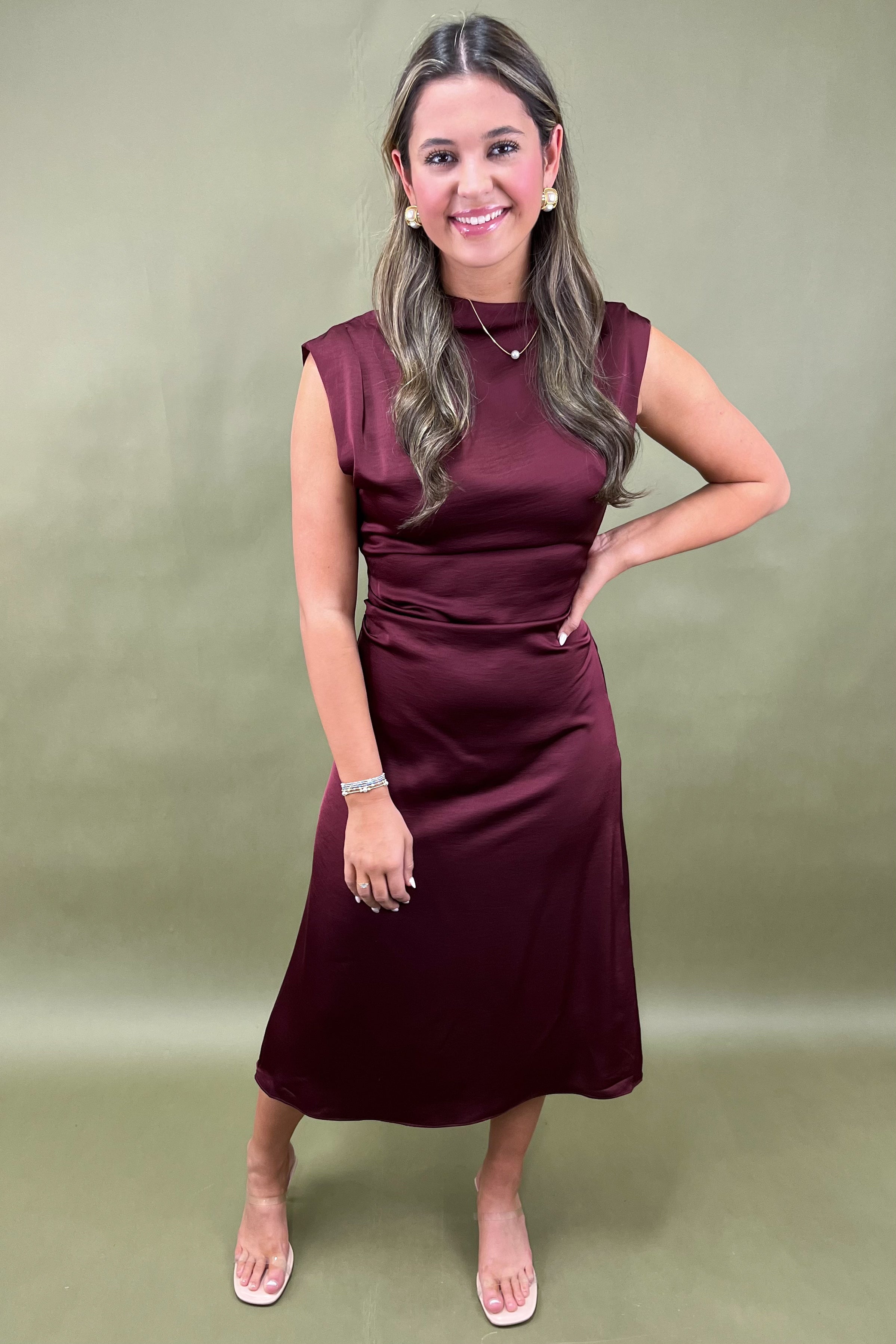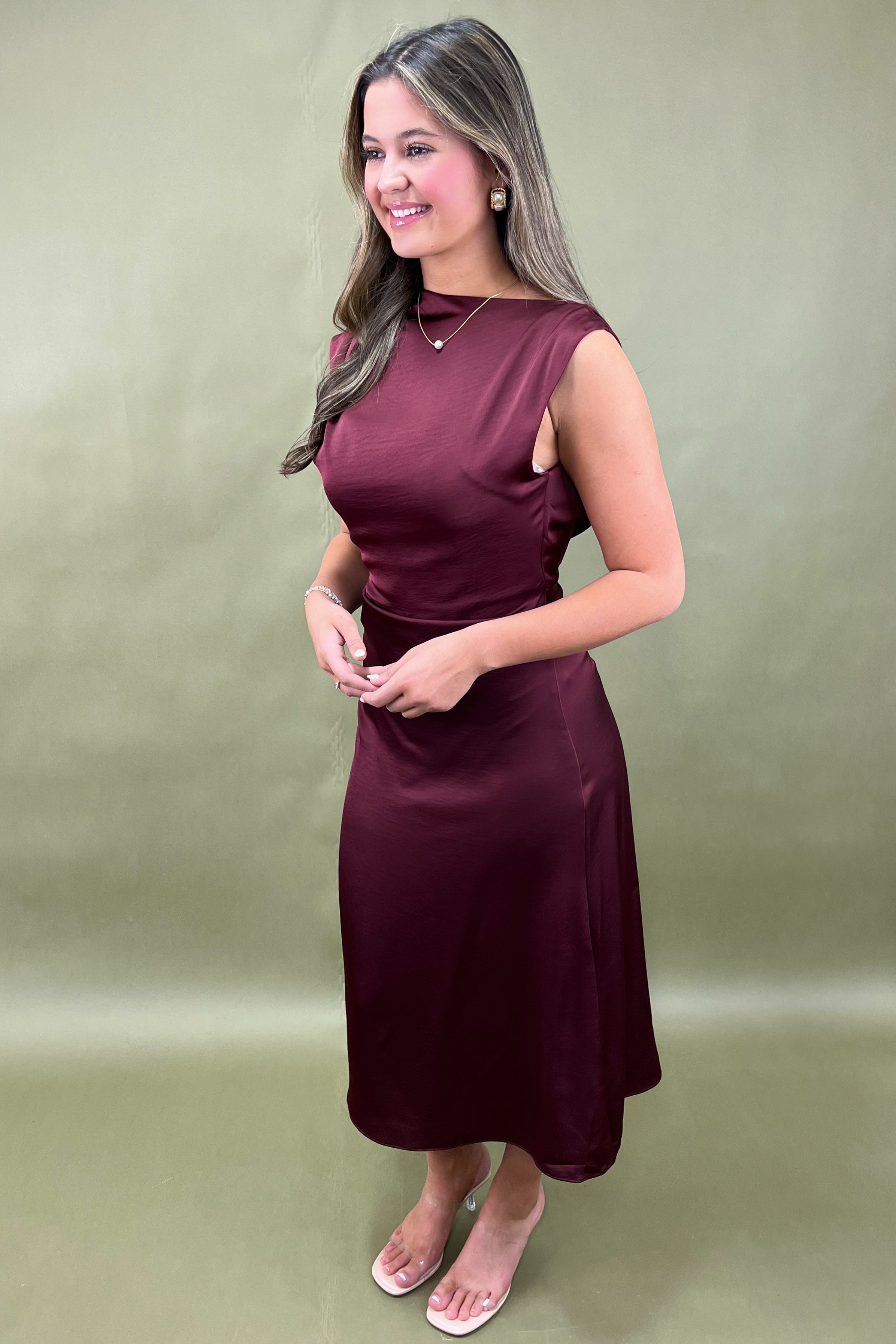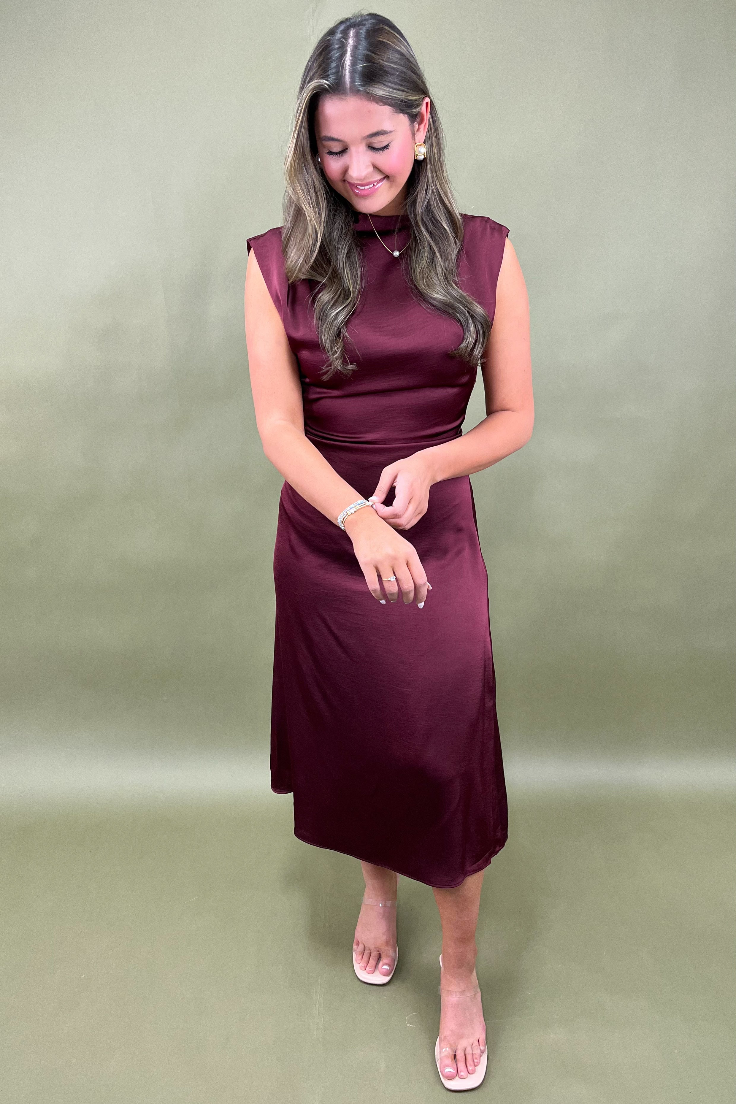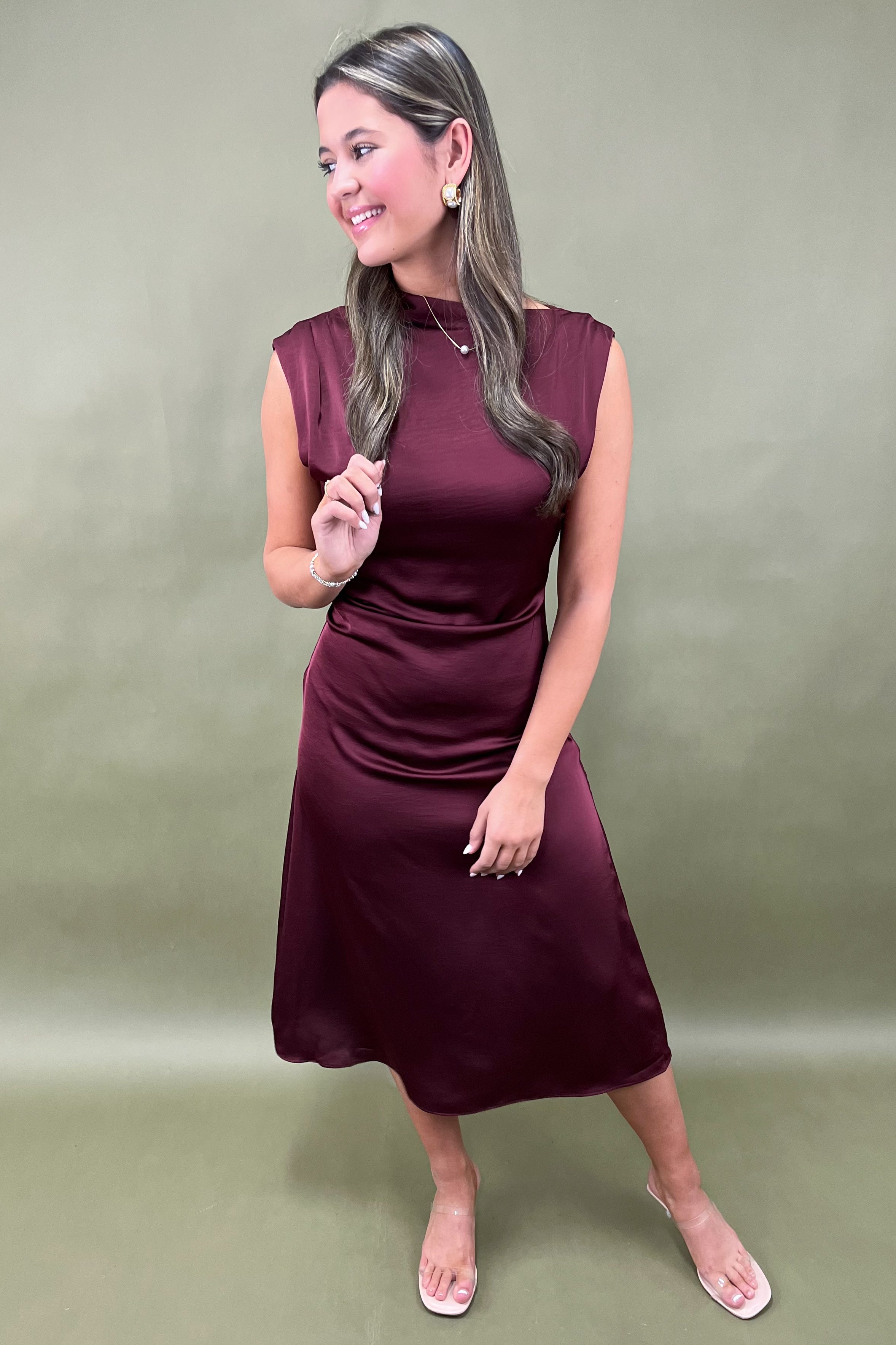 Think city lights, late-night laughter, and endless confidence. The Satin Skies Asymmetrical Midi Dress is for the woman who loves clean lines, bold details, and a touch of mystery. The deep merlot tone is rich and romantic — a perfect alternative to classic black — and the silky texture gives it that high-end, evening-ready feel without trying too hard.