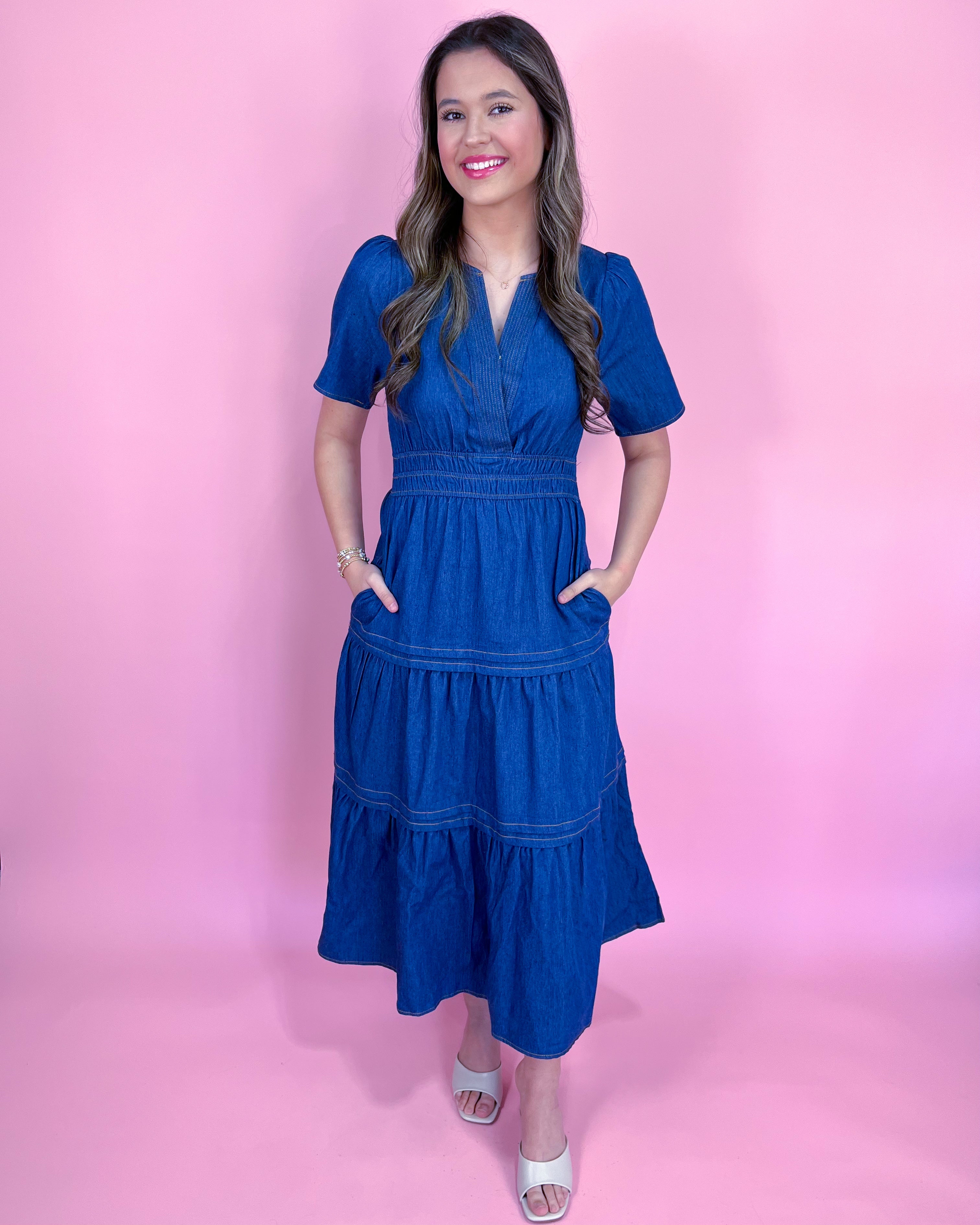 Elevate your everyday wardrobe with the Setlist Staple Denim Midi Dress. Crafted from 100% cotton, this lightweight denim essential combines a flattering smocked waist with a flowy tiered skirt for an effortless, feminine silhouette. Whether you're heading to brunch or running errands, this V-neck midi dress is the ultimate throw-on-and-go piece that ensures you look perfectly put together with zero effort.