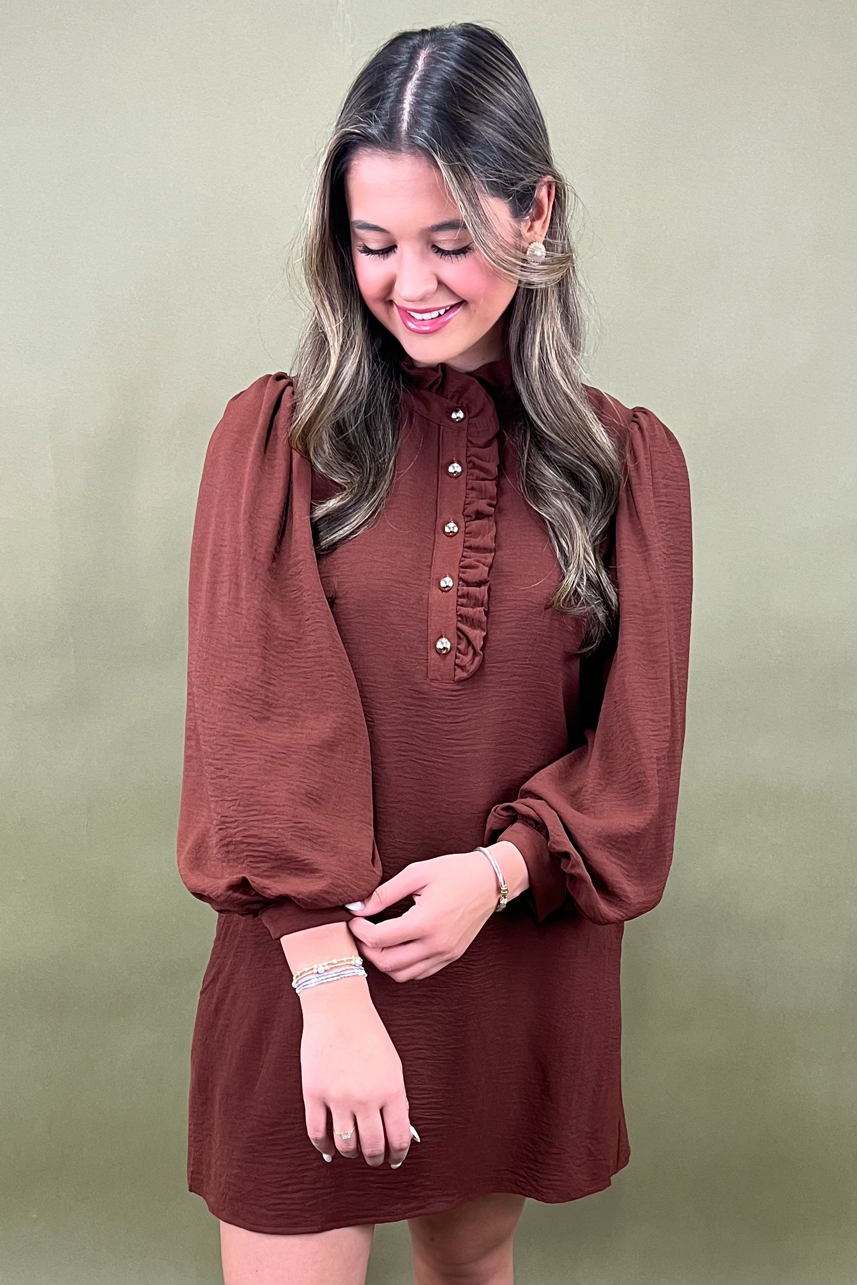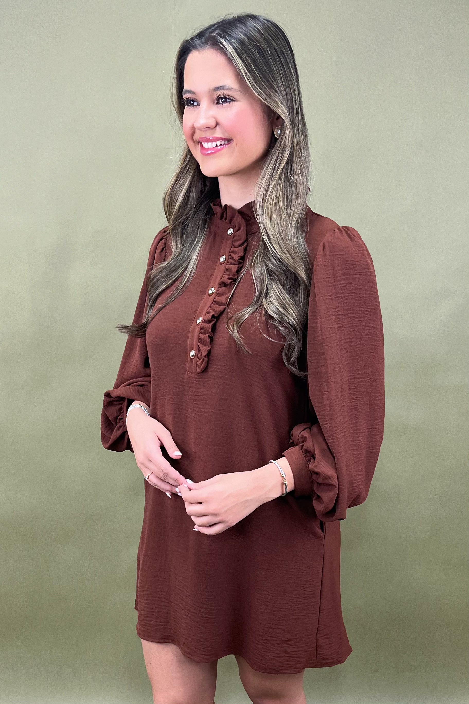 The Sienna Lane Shift Dress blends sophistication with simplicity â the kind of effortless piece that feels refined yet easy to wear. Its warm tone, flowy silhouette, and subtle ruffle details make it a true fall favorite that transitions seamlessly through the seasons.