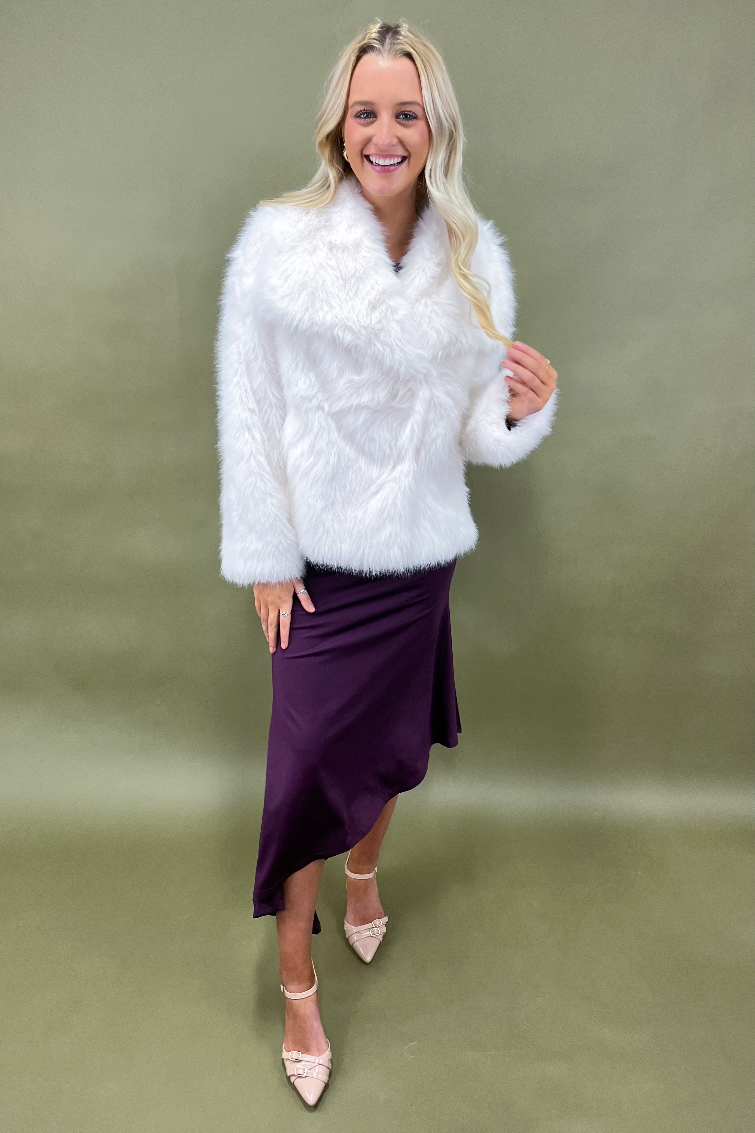 This beauty has a slightly longer, shaggier faux fur finish that feels silky to the touch — like wrapping yourself in a chic snow cloud ☁️. The crisp ivory-white hue keeps things dreamy and sophisticated, instantly elevating your outfit no matter what’s underneath.
