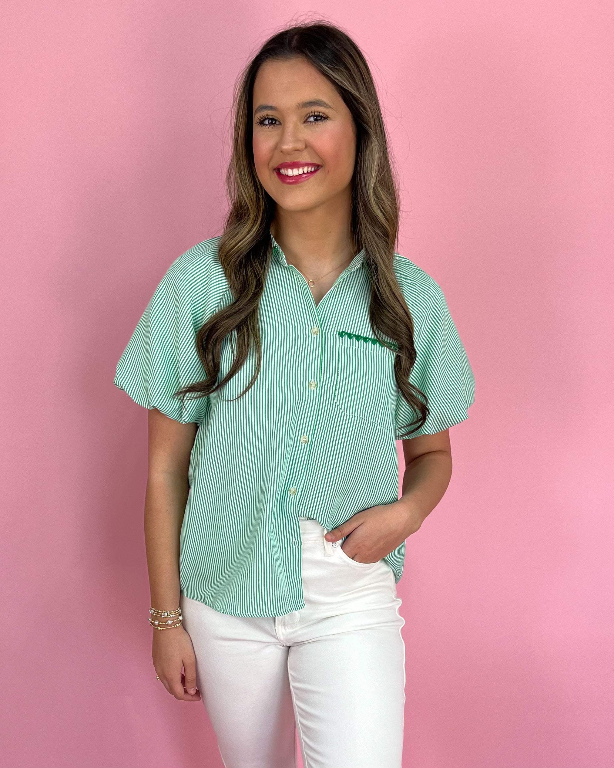 • Green striped button-up top 💚