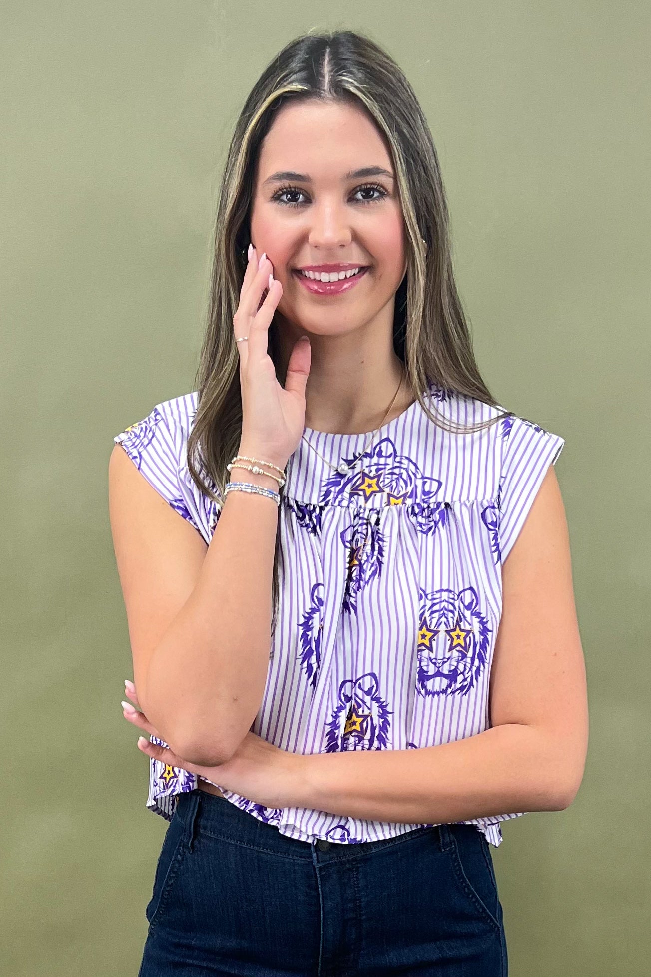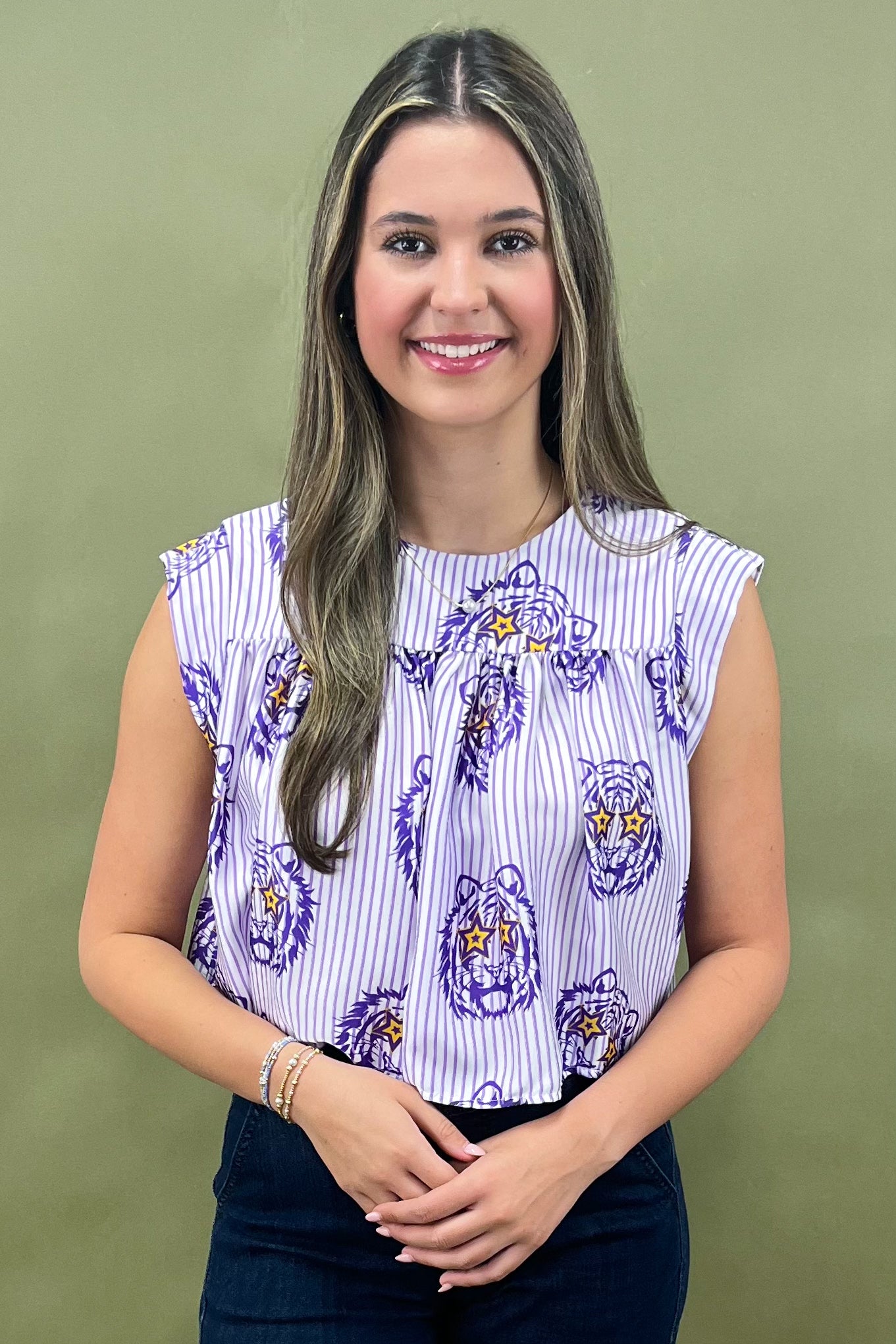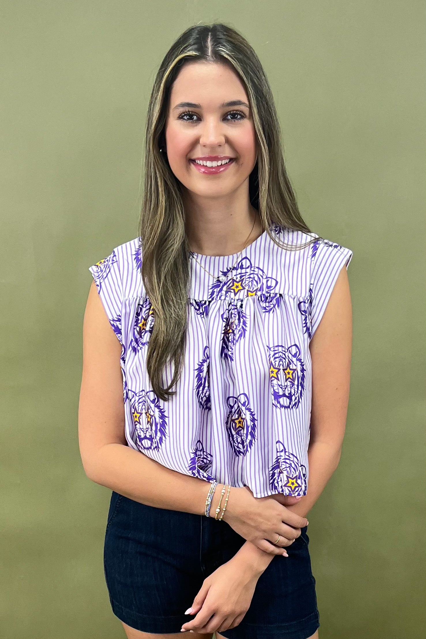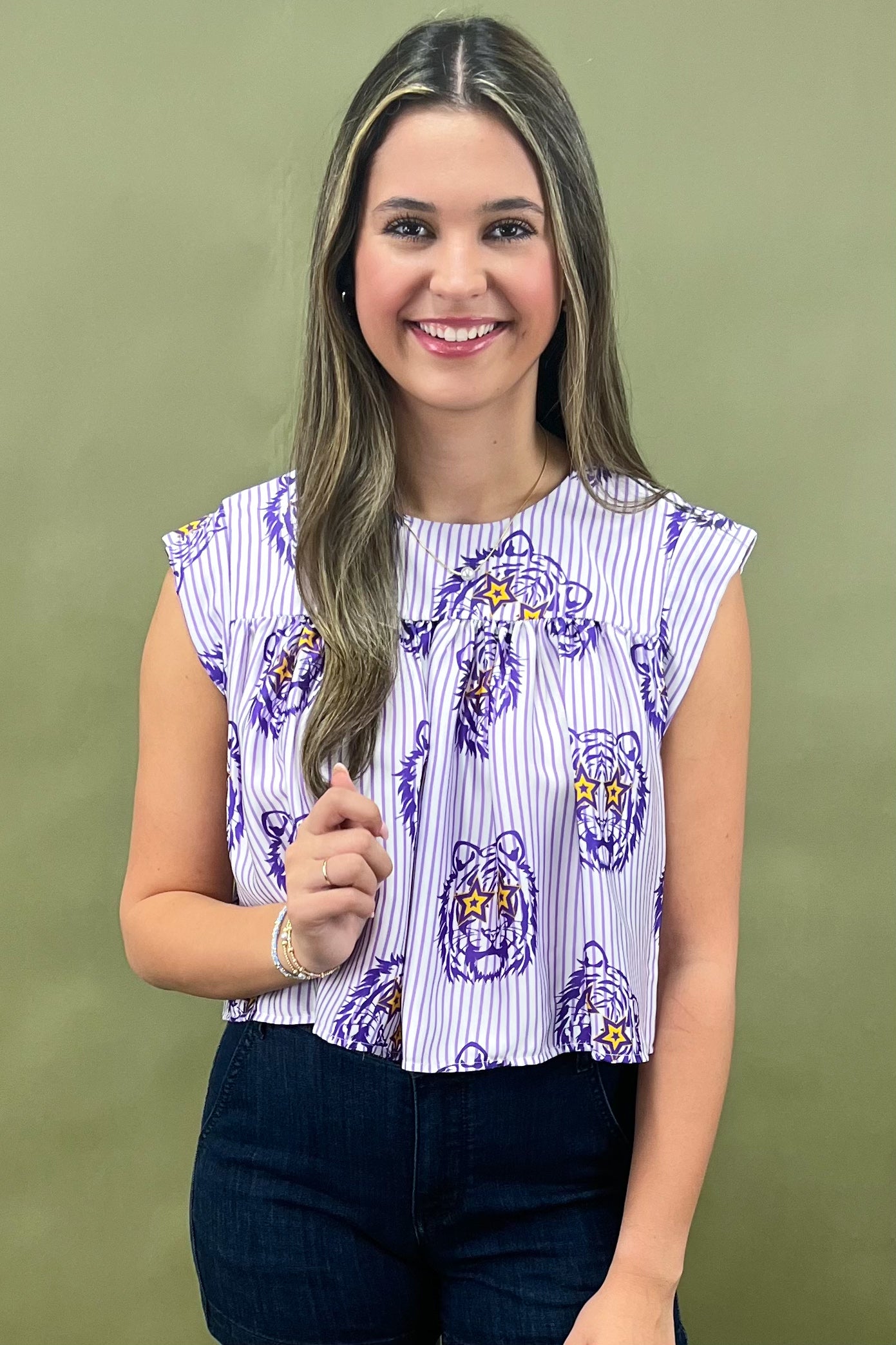 Bring the roar to game day and beyond with the Starstruck Tiger Striped Top đŻâïž. Bold, playful, and oh-so-spirited, this top combines classic stripes with a fierce twistâpurple tiger heads rocking star-shaped sunglasses (yes, these tigers came to slay). The result? A piece thatâs part sporty-chic, part fashion statement, and 100% game-day ready.