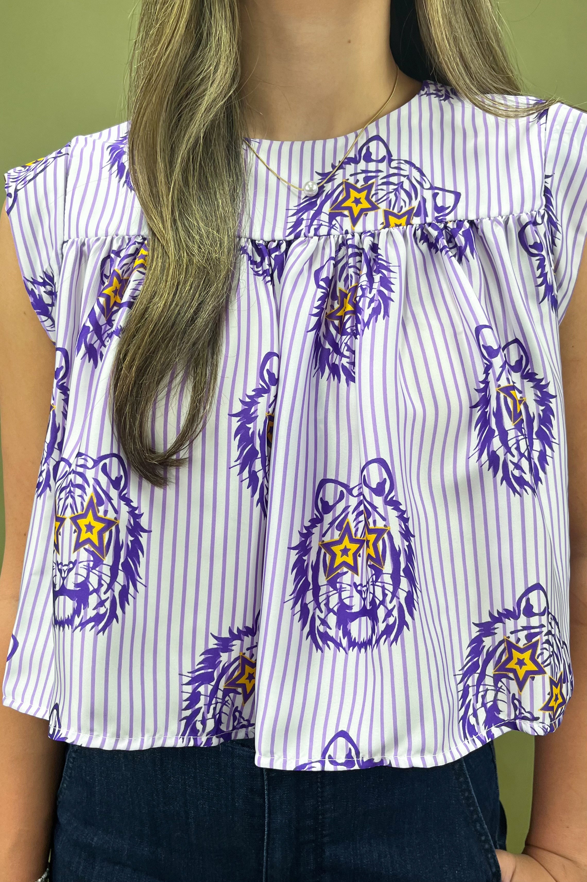 Designed in a lightweight 100% polyester fabric, this top is breezy, comfortable, and perfect for keeping cool while the energy heats up. The lilac and white pinstripes give it that crisp, clean backdrop, while the pops of purple and gold tiger prints add major team spirit flair. The relaxed fit, sleeveless cut, and gathered detail under the bustline give it that effortless drape we all adoreâflowy, flattering, and comfy all at once đ.