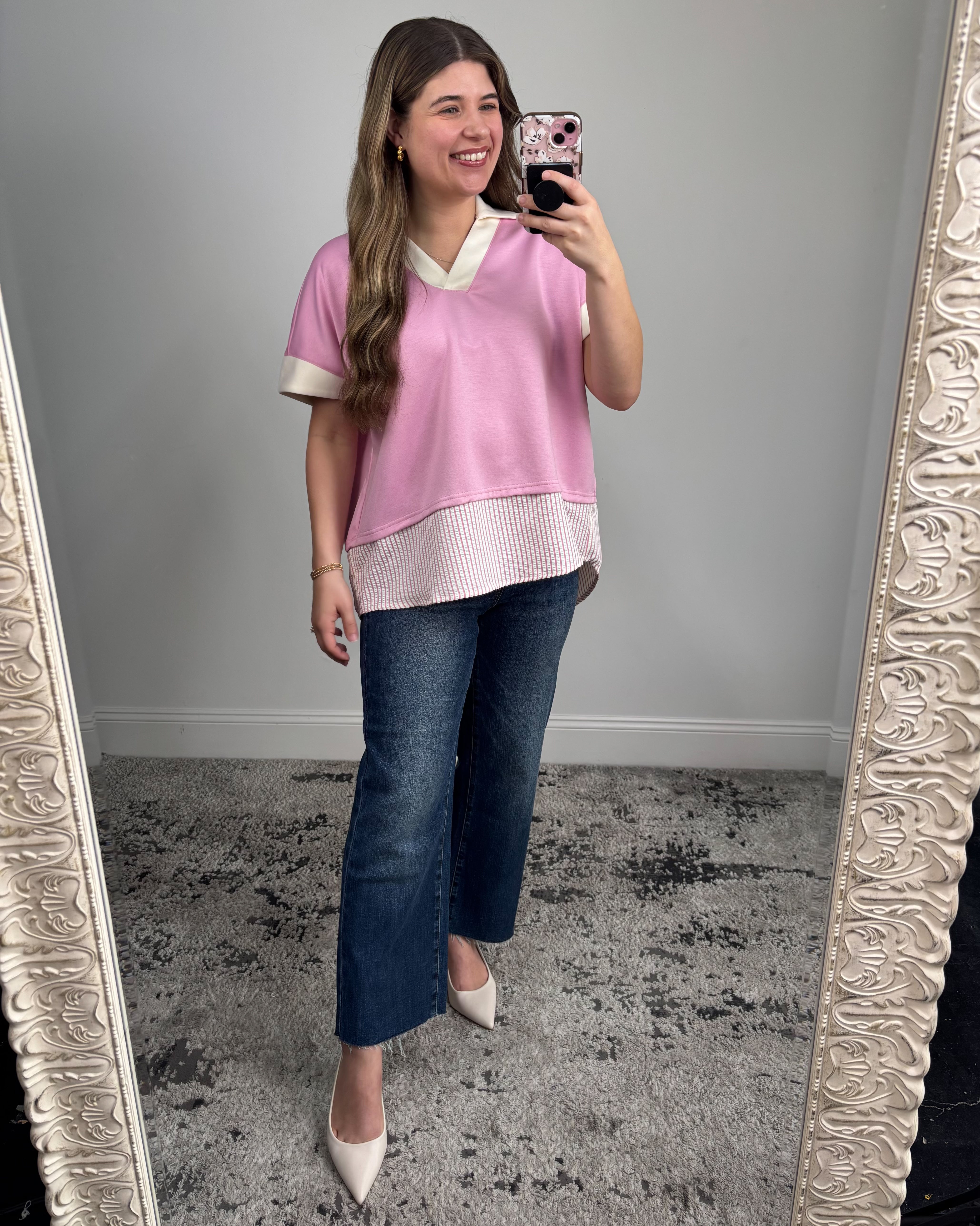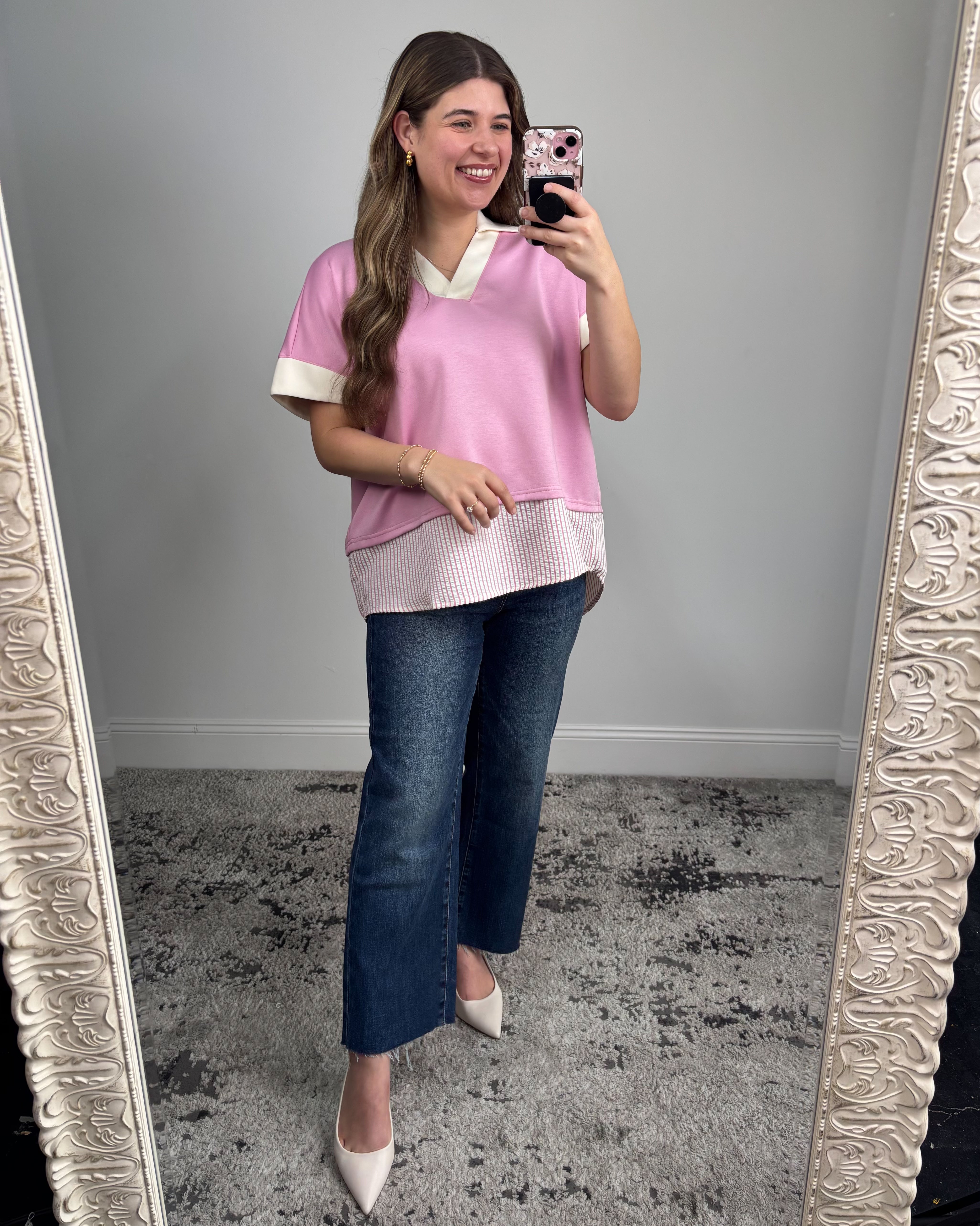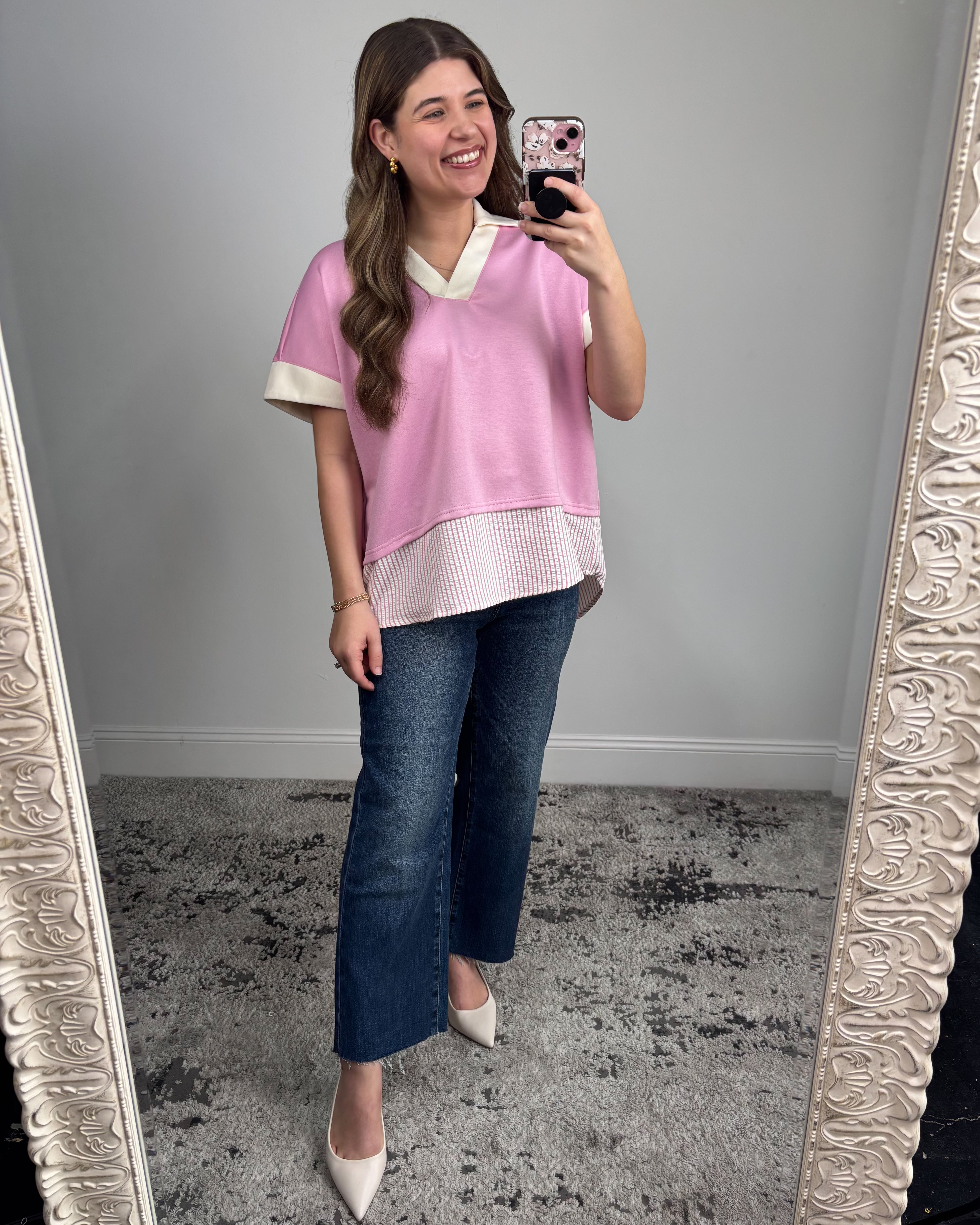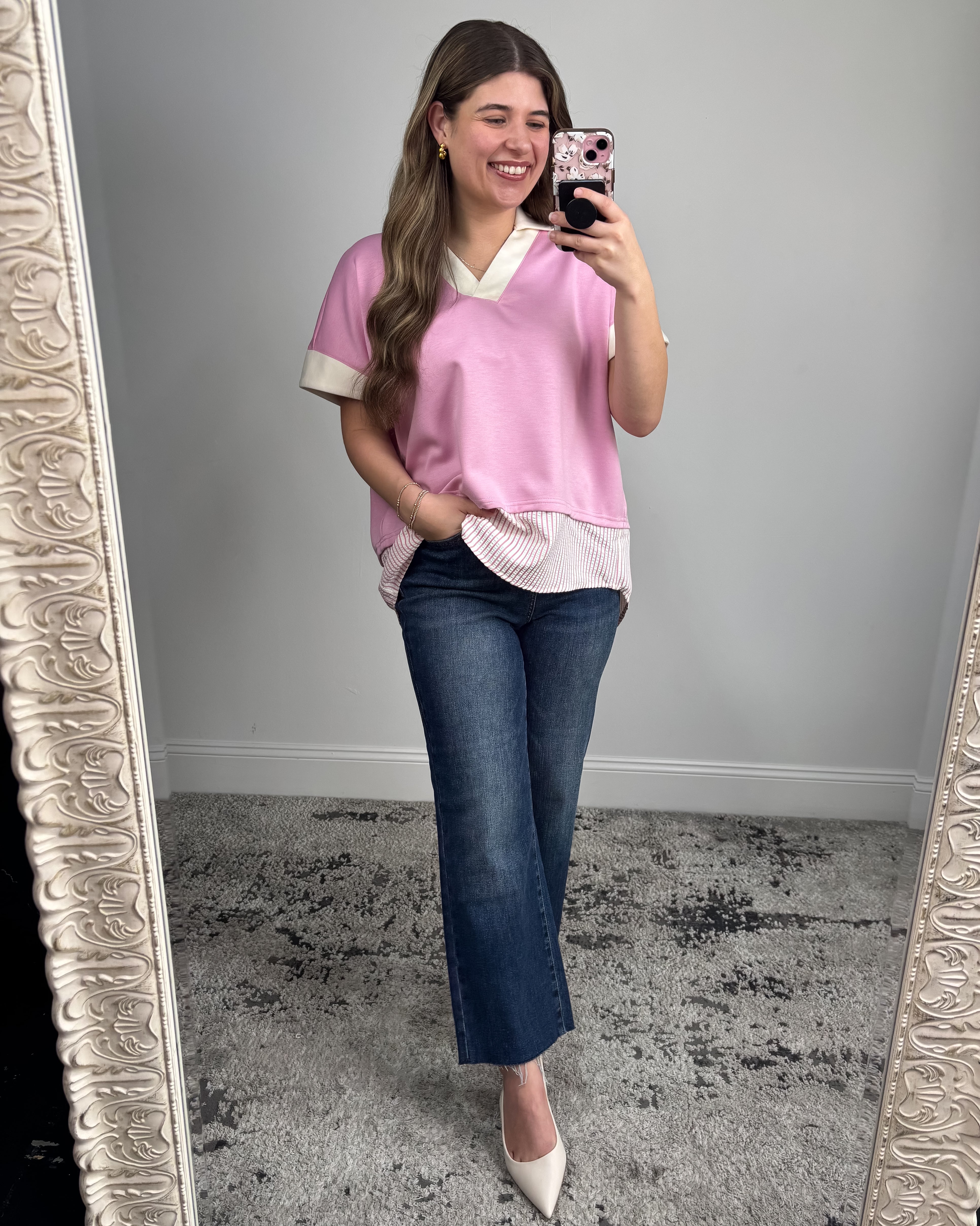 Meet the Strawberries and Cream Striped Top — the sweetest blend of preppy charm and playful femininity. 🍓💕 This mixed-media beauty combines a soft blush pink knit body with crisp striped shirting details for a look that’s effortlessly polished yet comfortably relaxed. The contrast collar and sleeve cuffs add that classic, country-club–meets-boutique vibe, making it the perfect top for spring days, weekend outings, or anytime you want to look cute with zero effort.