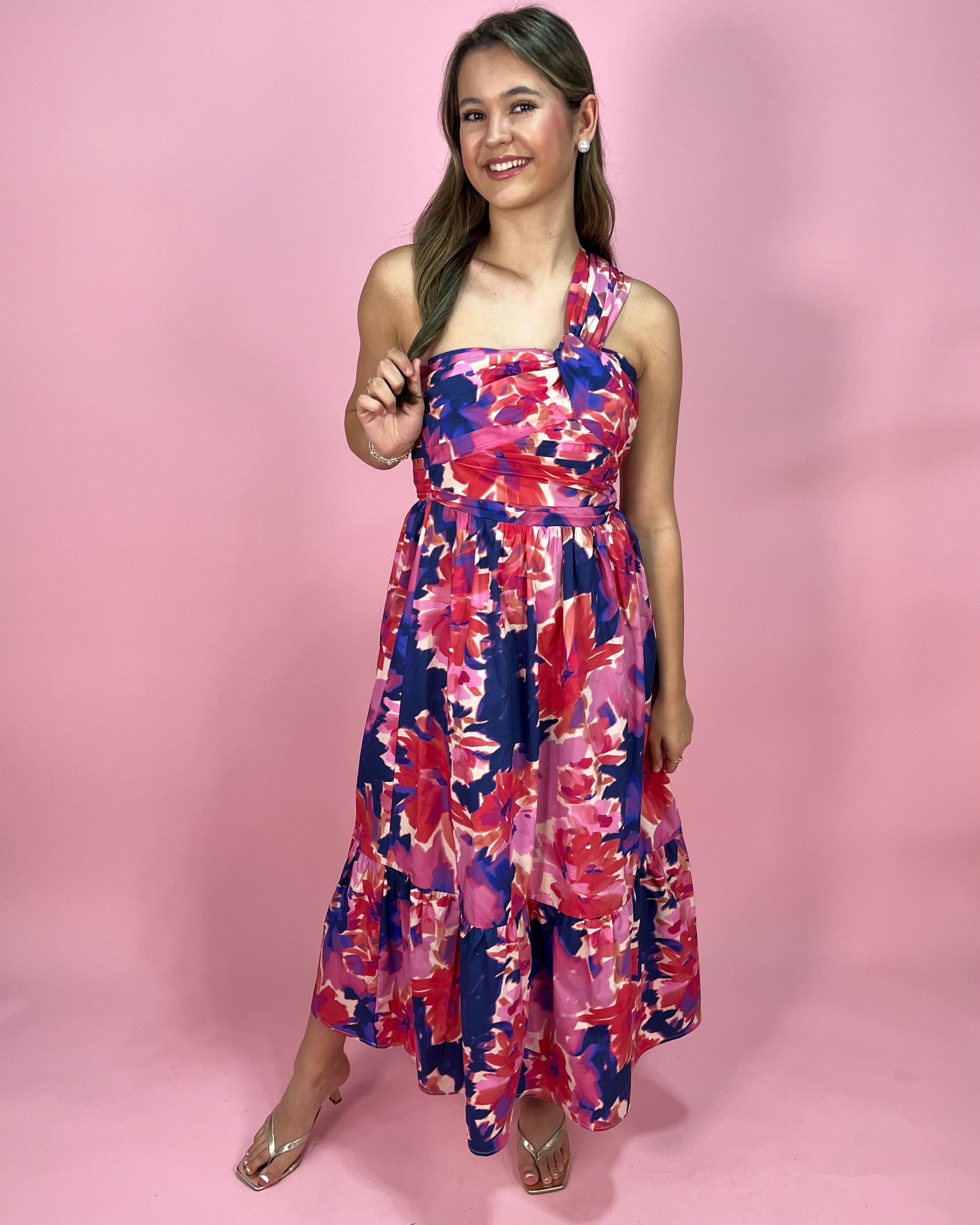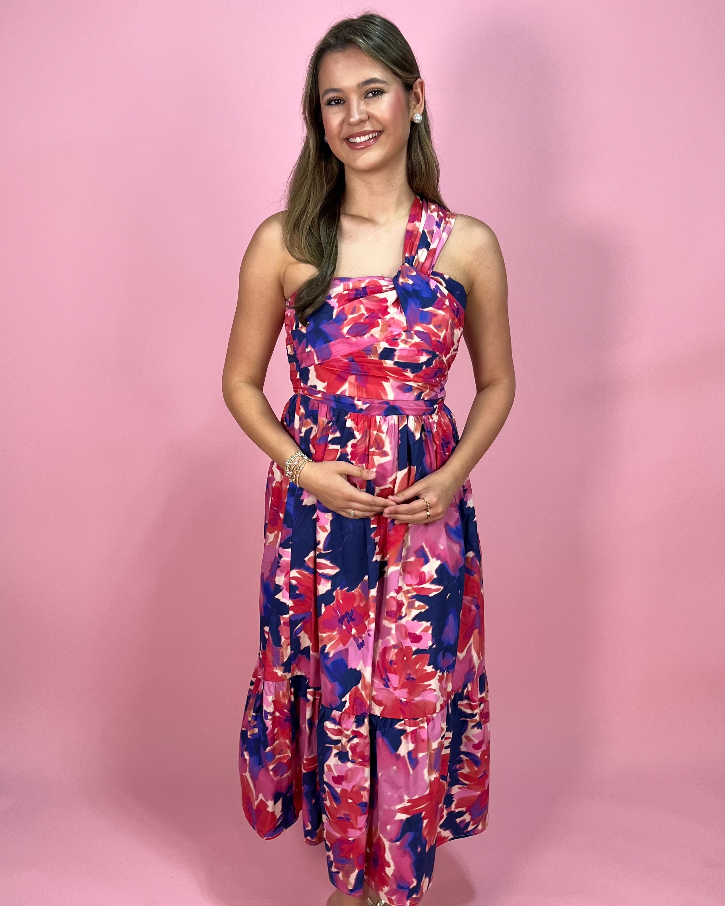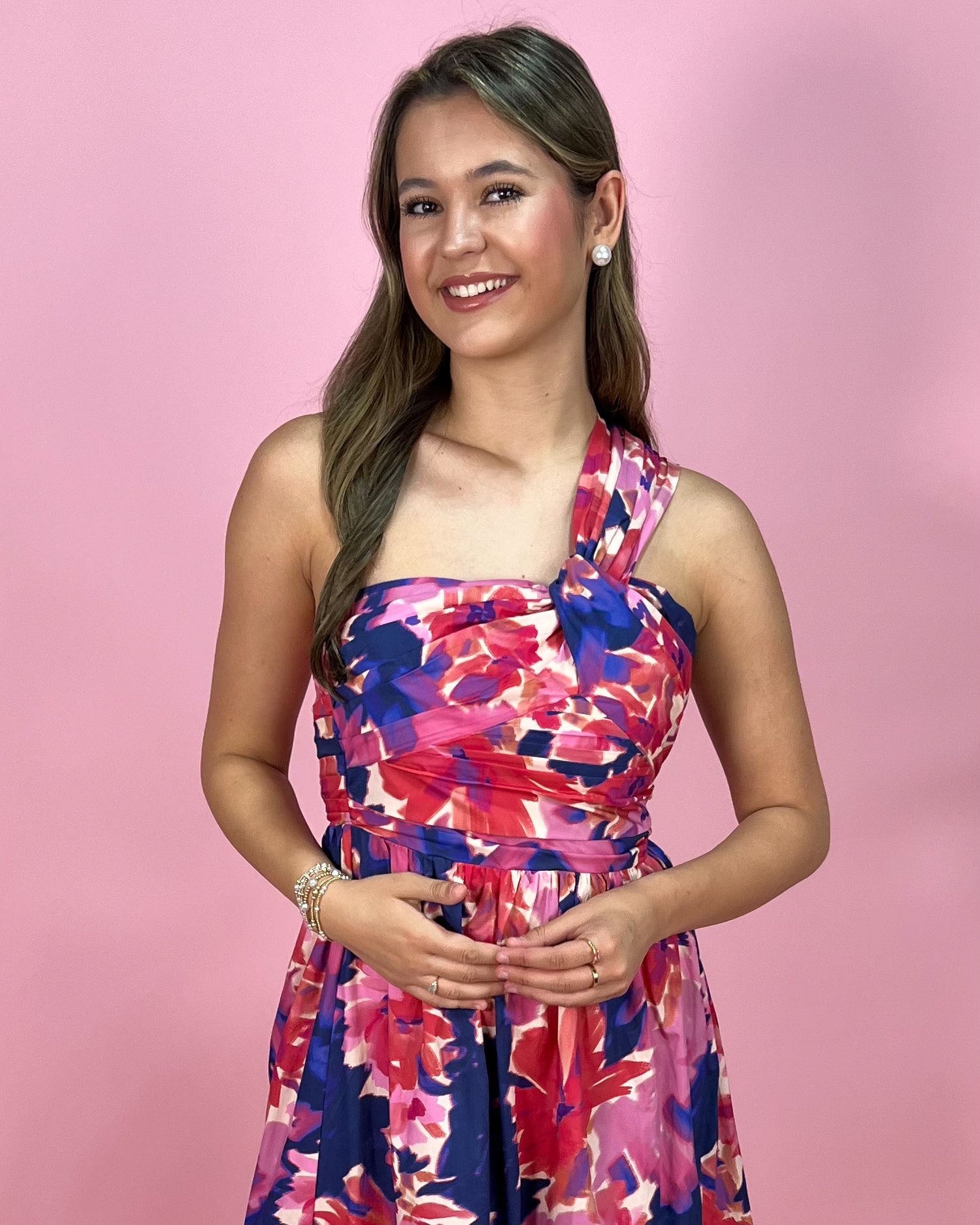 Bold, vibrant, and made to stand out, the Sunset Splash Floral One-Shoulder Midi Dress is your go-to for making a statement. Featuring a stunning blend of pinks, reds, and deep blues, this eye-catching print brings a sunset-inspired palette to life in the most flattering silhouette.