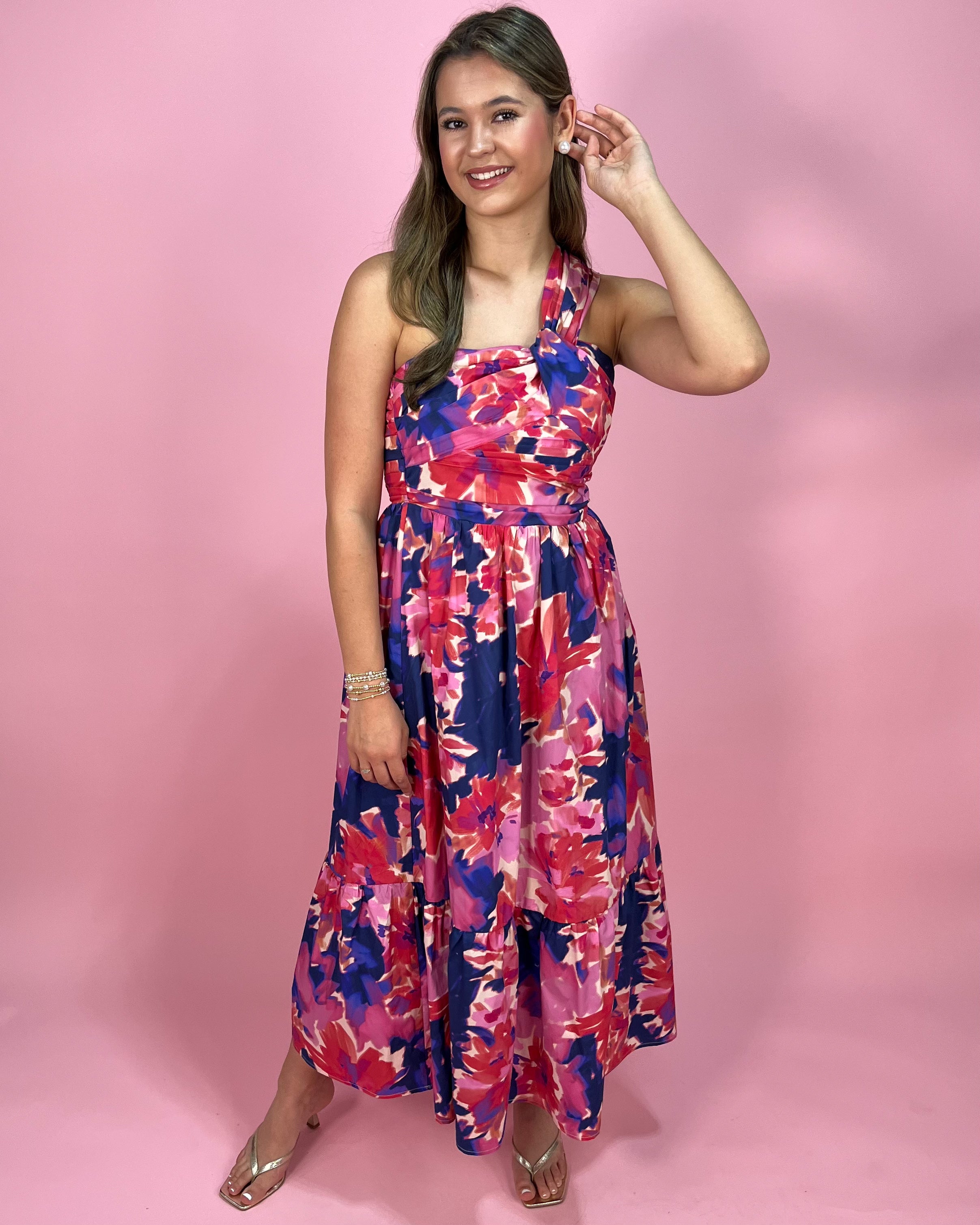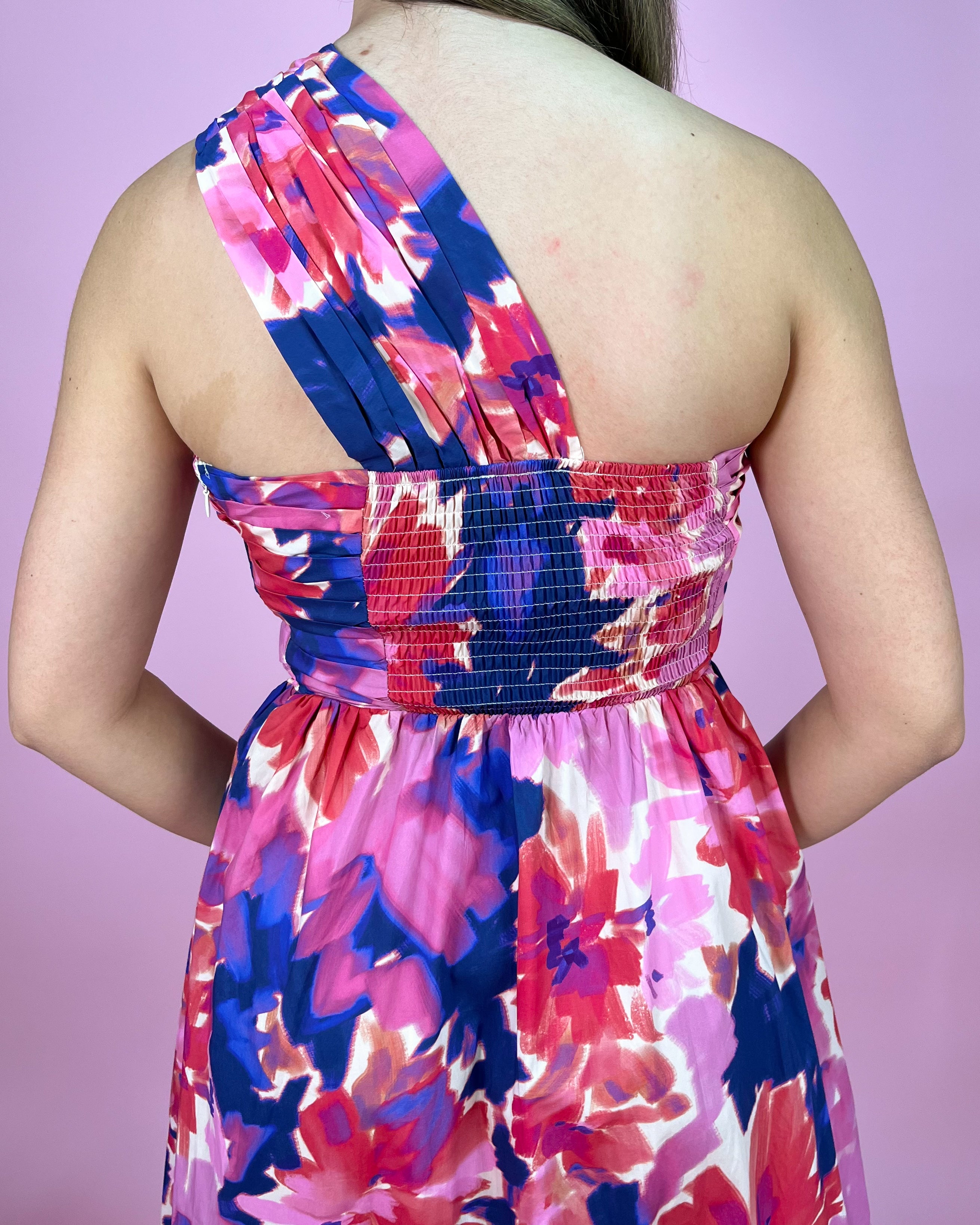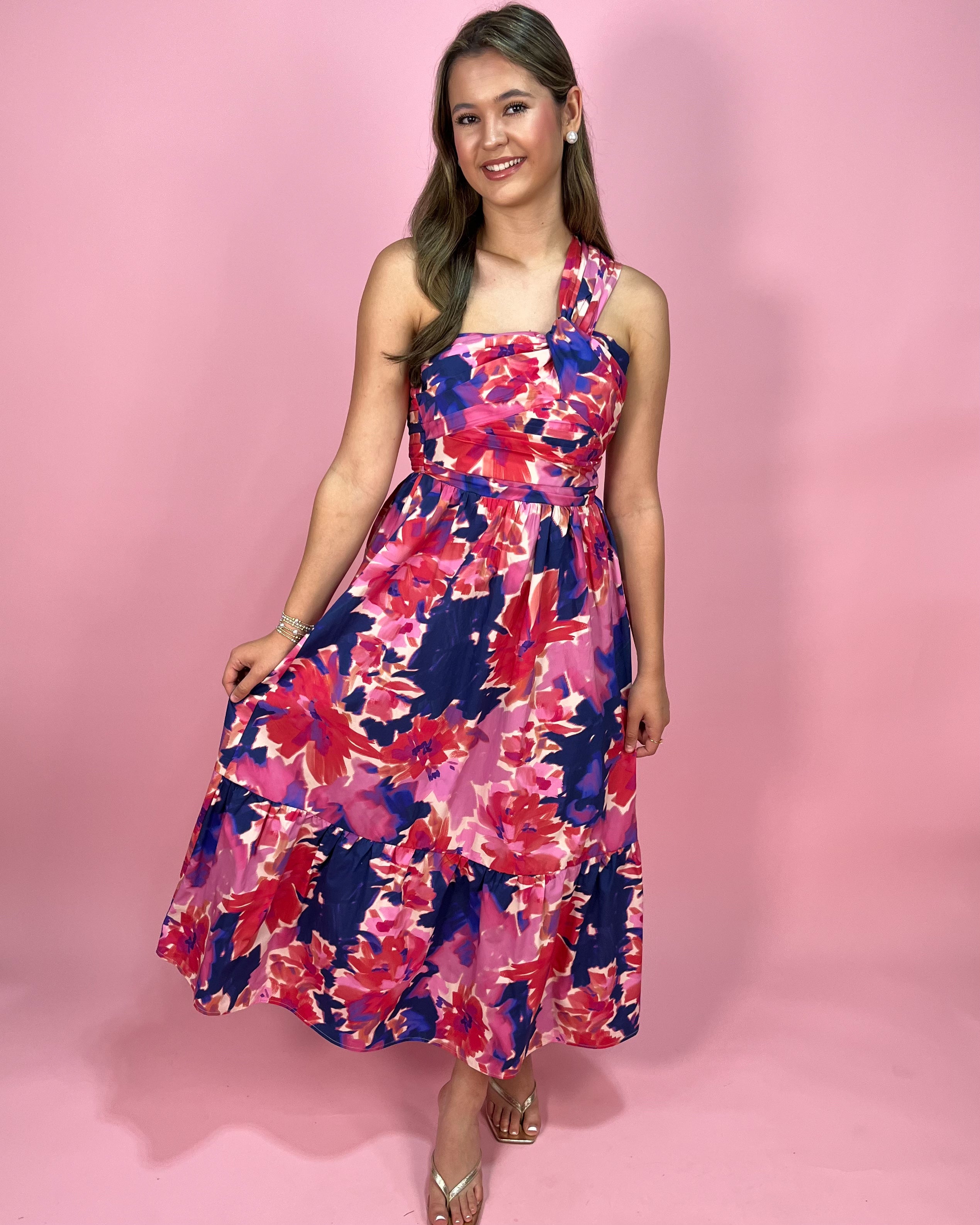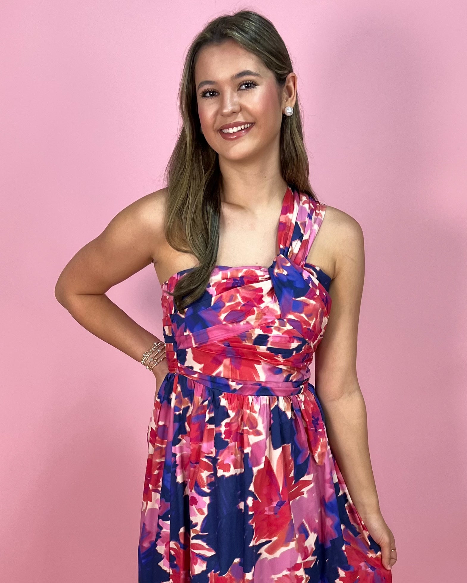 Bold, vibrant, and made to stand out, the Sunset Splash Floral One-Shoulder Midi Dress is your go-to for making a statement. Featuring a stunning blend of pinks, reds, and deep blues, this eye-catching print brings a sunset-inspired palette to life in the most flattering silhouette.
