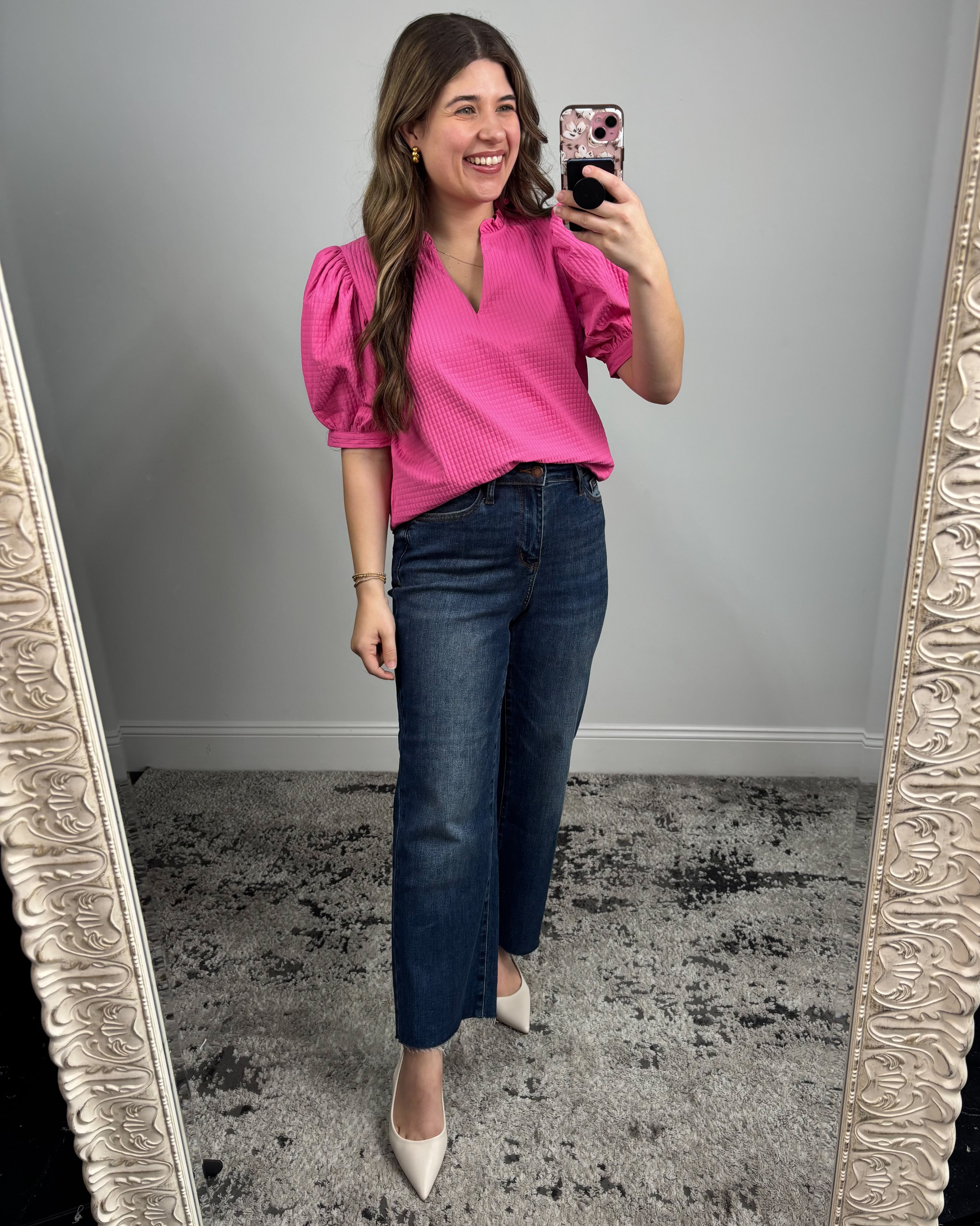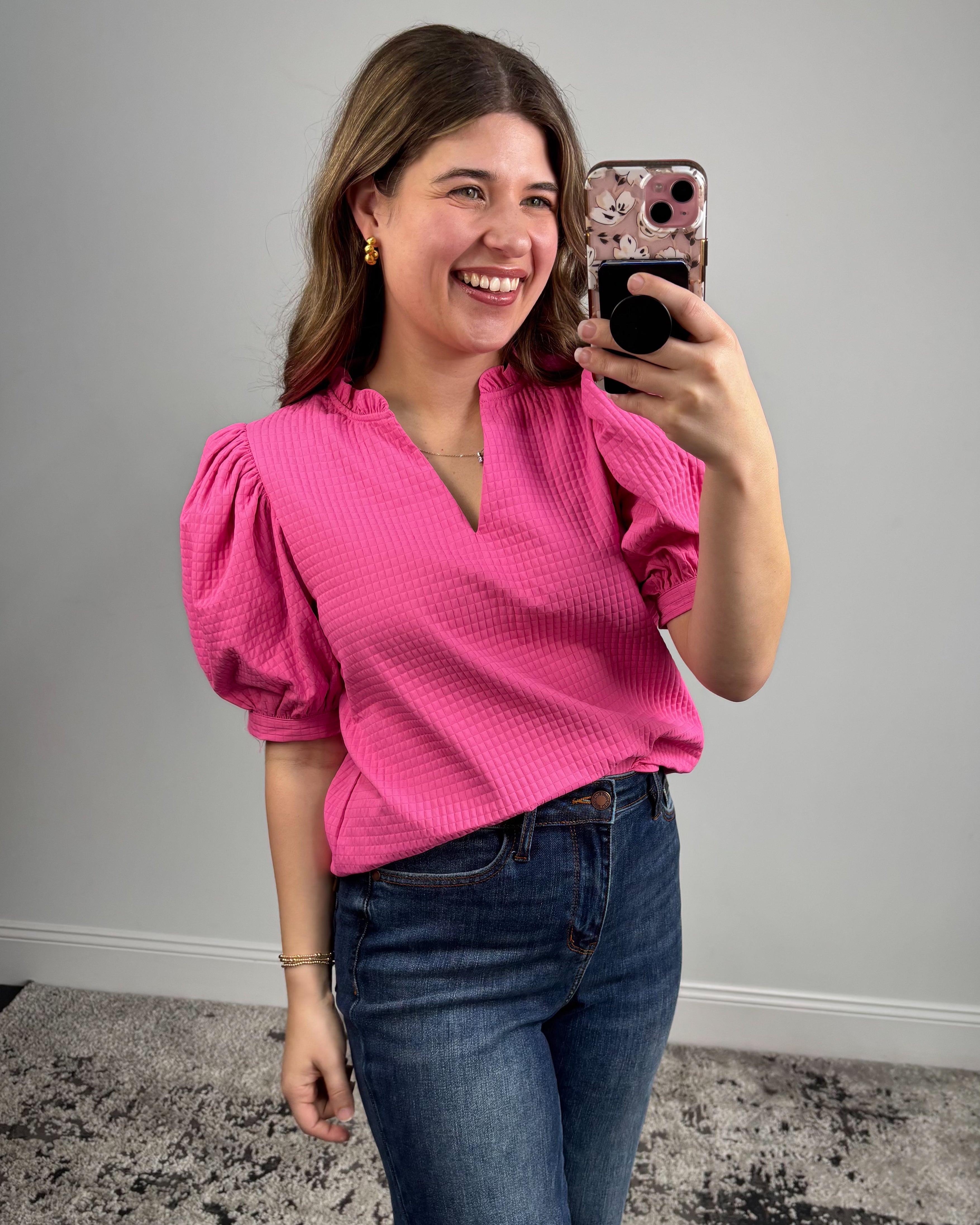 The quilted texture adds beautiful dimension, while the puff sleeves create a flattering, feminine silhouette that feels on-trend without being over the top. A soft V-neckline frames the face nicely, making it easy to dress up with layered jewelry or keep simple for a clean, effortless look.