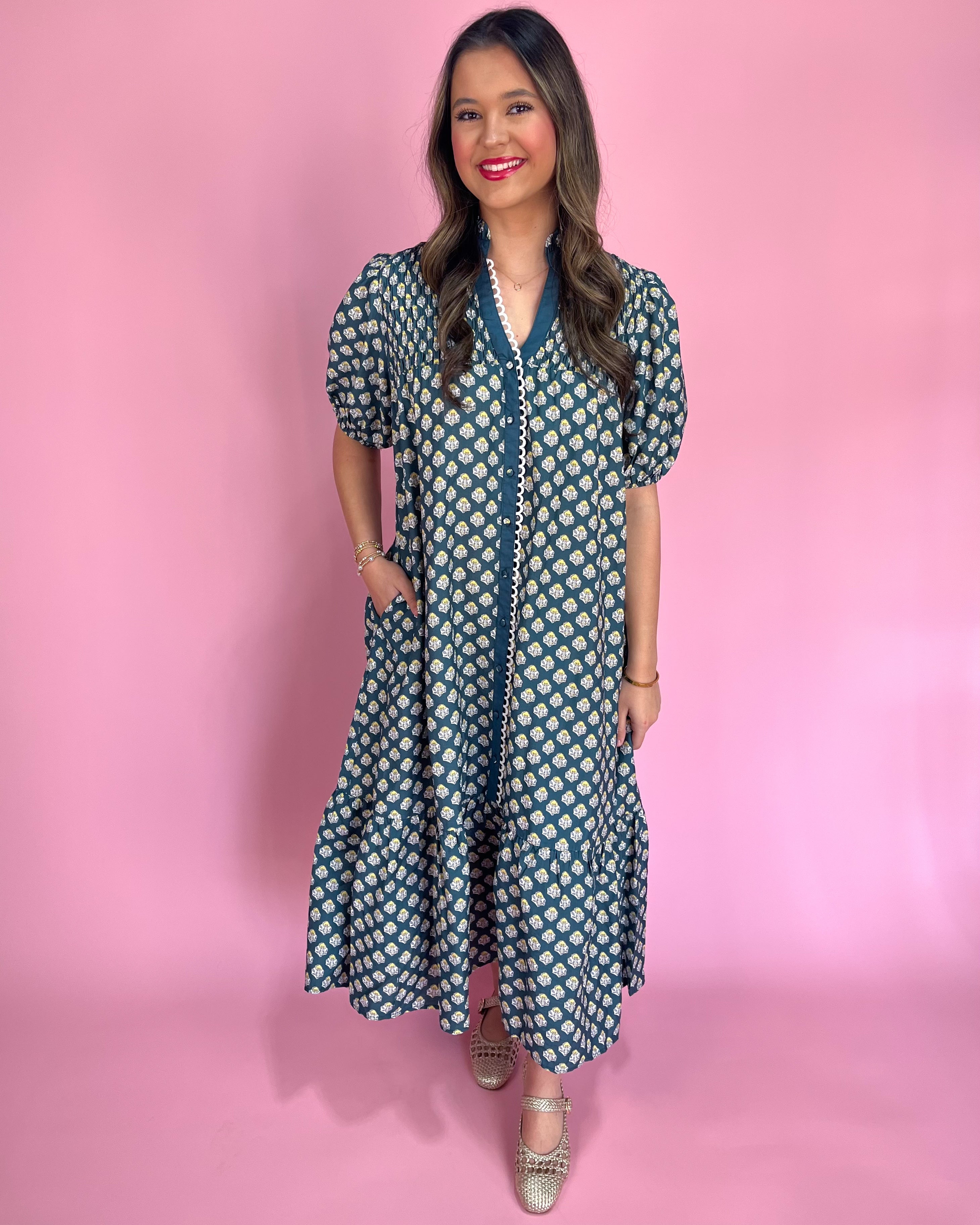 If you love an easy, throw-on-and-go dress that still feels so pretty â this one is calling your name đ The deep teal base paired with the tiny tulip-inspired floral print is giving effortless charm with a little vintage flair, and we are OBSESSED.The button down front + relaxed silhouette makes it super wearable and comfy, while the cute contrast trim + scalloped detail adds that boutique âextraâ touch we love so much âš Itâs one of those pieces that looks dressed up with boots or heels⊠but still feels totally casual with sneakers!