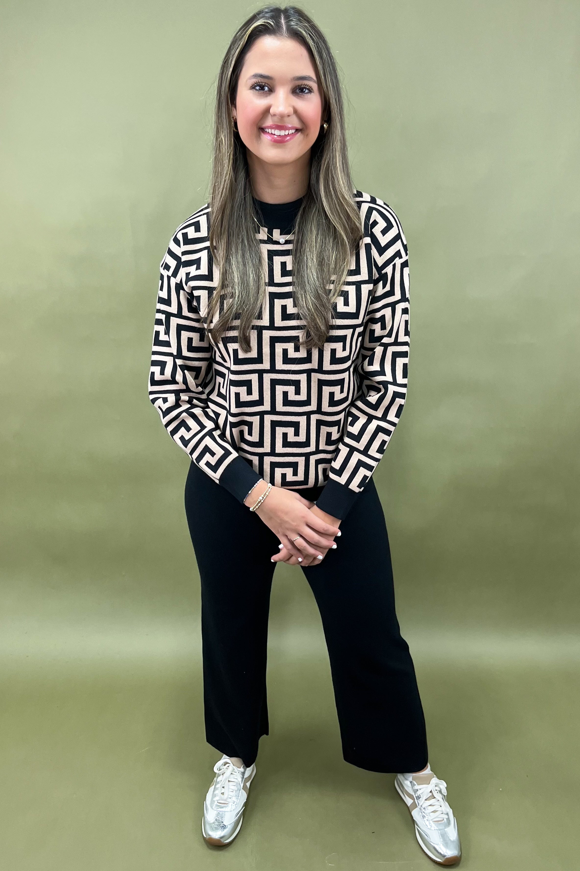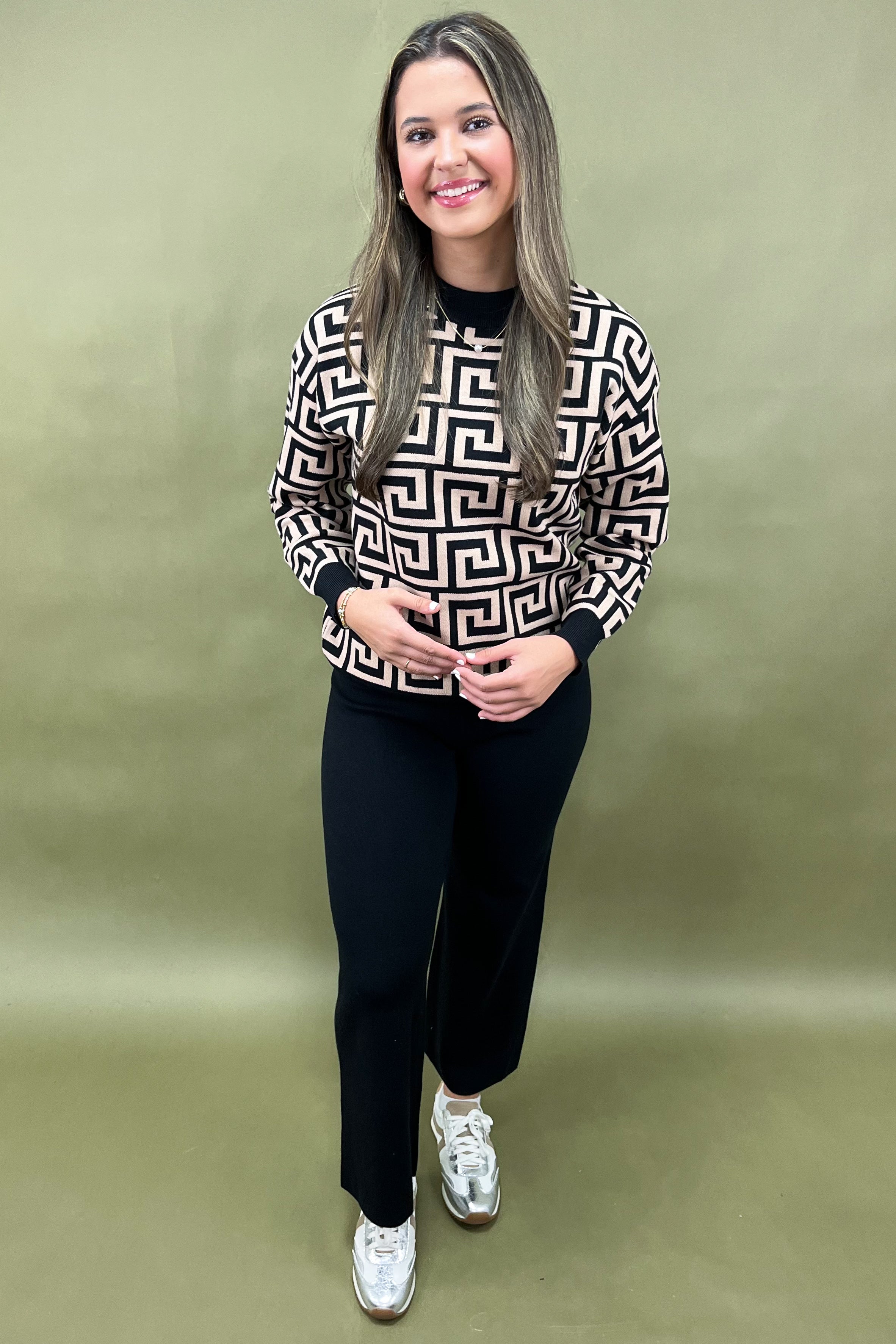 The sweater steals the show with its bold maze-like pattern—modern yet classic, and totally eye-catching without being over the top. Its relaxed fit makes it cozy to wear while still keeping your look sharp and put-together. Paired with the solid knit bottoms, the vibe is all balance: statement meets subtle, comfort meets chic. The wide-leg pants flow beautifully, elongating your frame while keeping things cozy and wearable all day long.