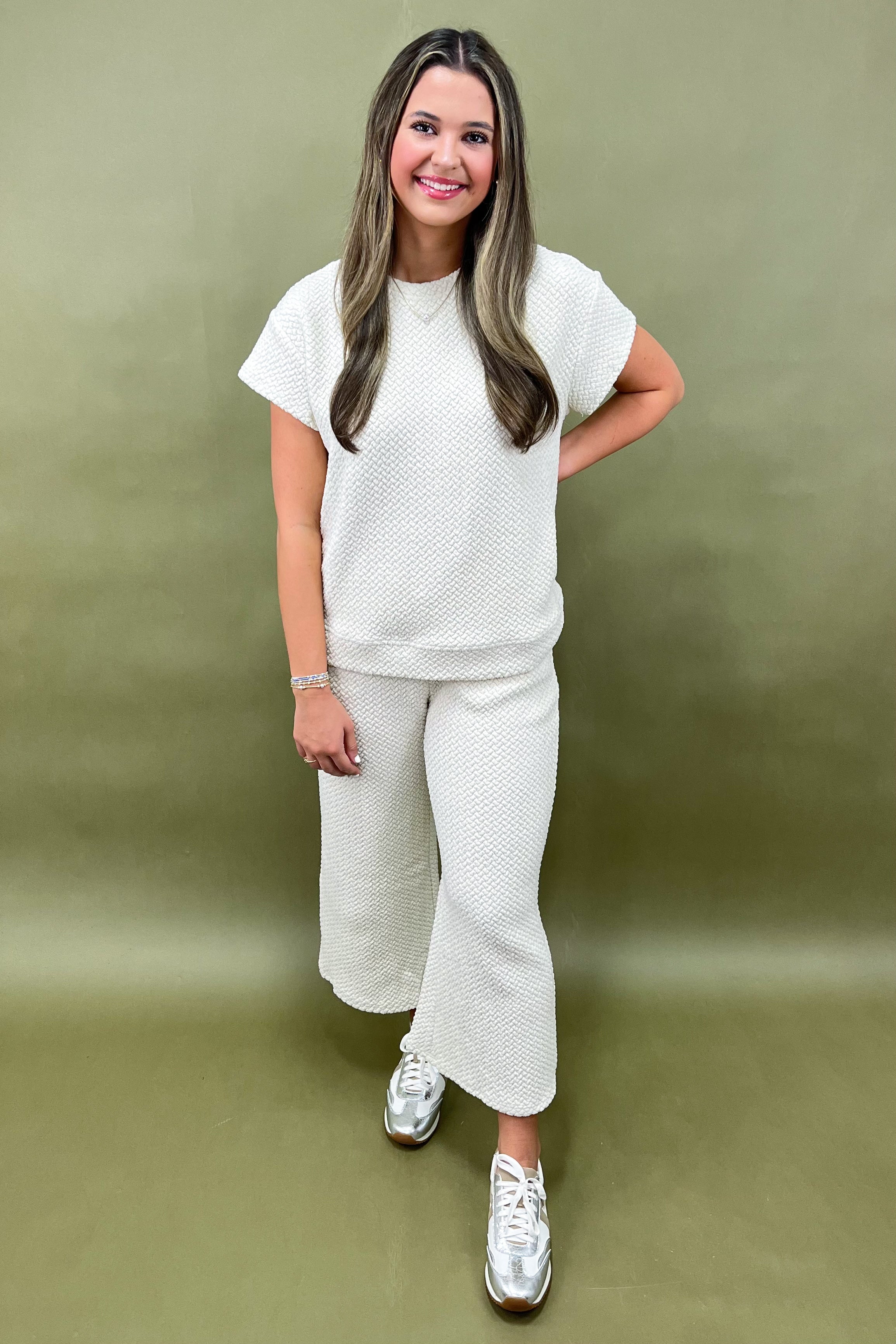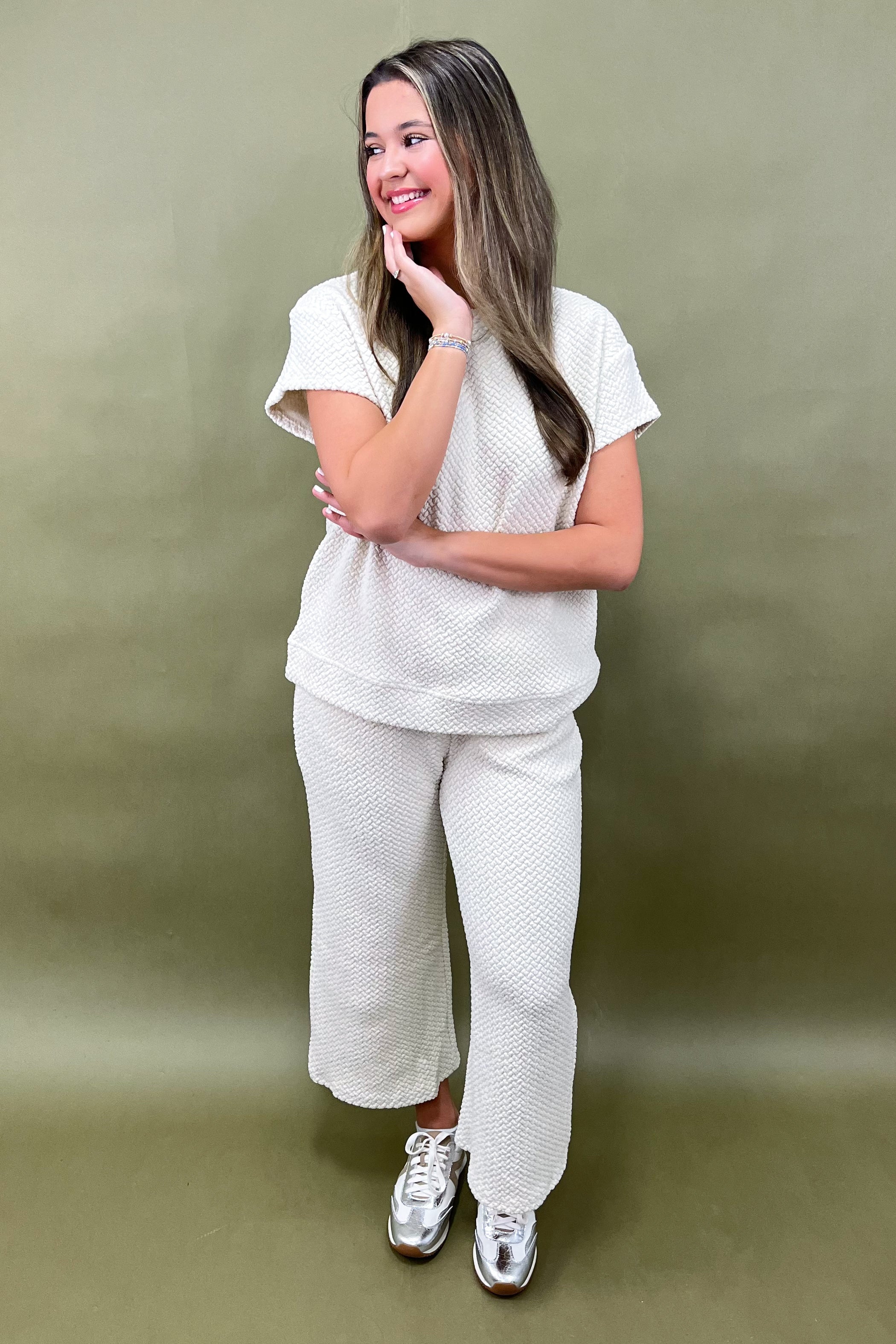 We love a set that does it all — and The Cozy Charm Textured Set is exactly that. She’s simple enough to become your go-to, but detailed enough to feel special every time you wear her. The basketweave design brings a rich texture that makes the outfit look high-end while keeping the feel relaxed and approachable.