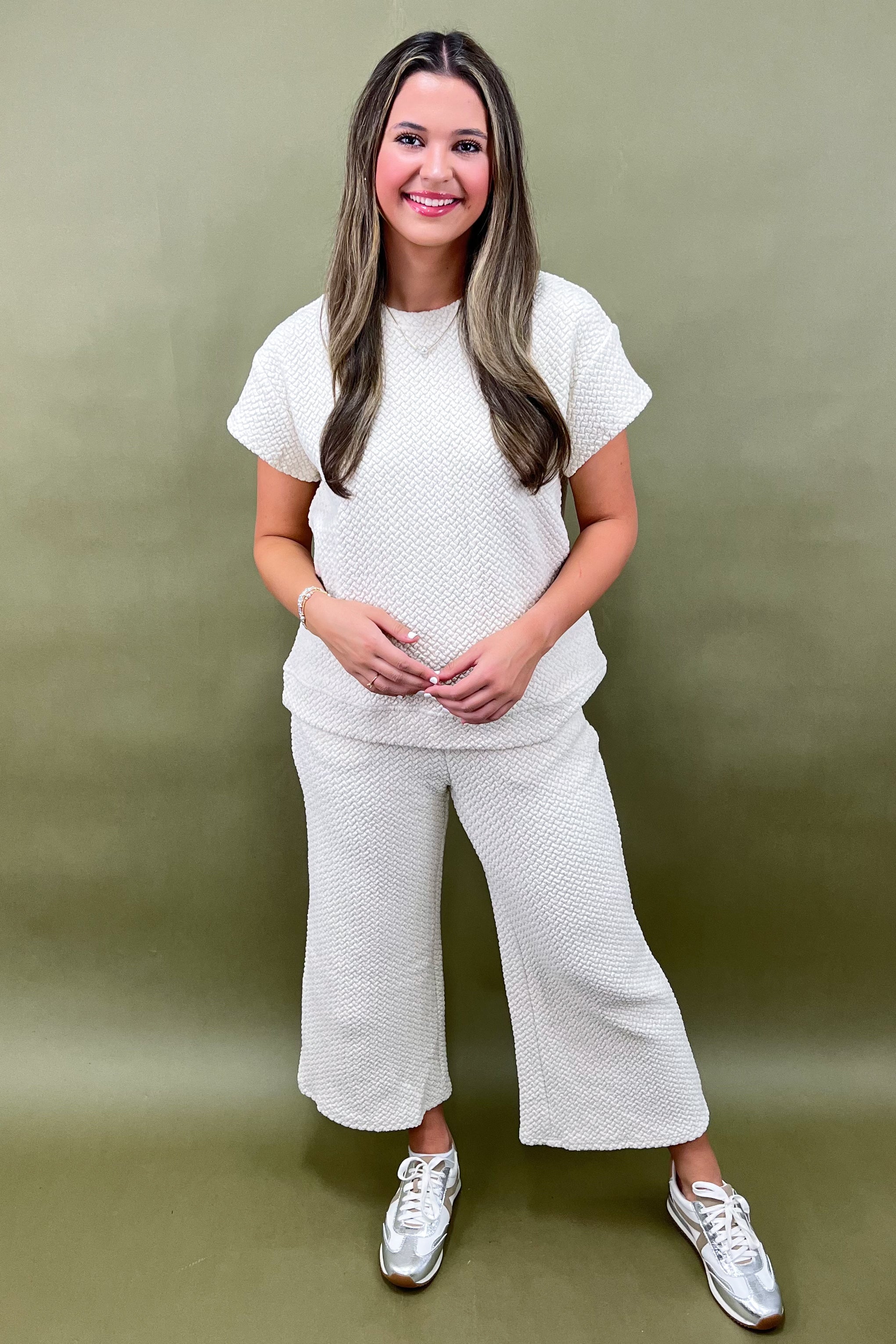 The top features a relaxed silhouette with a classic crew neckline and short sleeves — easy, breezy, and timeless. The matching bottoms carry the same textured pattern, creating that head-to-toe coordinated look we all adore. The best part? You can wear the pieces together for a put-together vibe, or break them apart and style them separately for endless outfit options.
