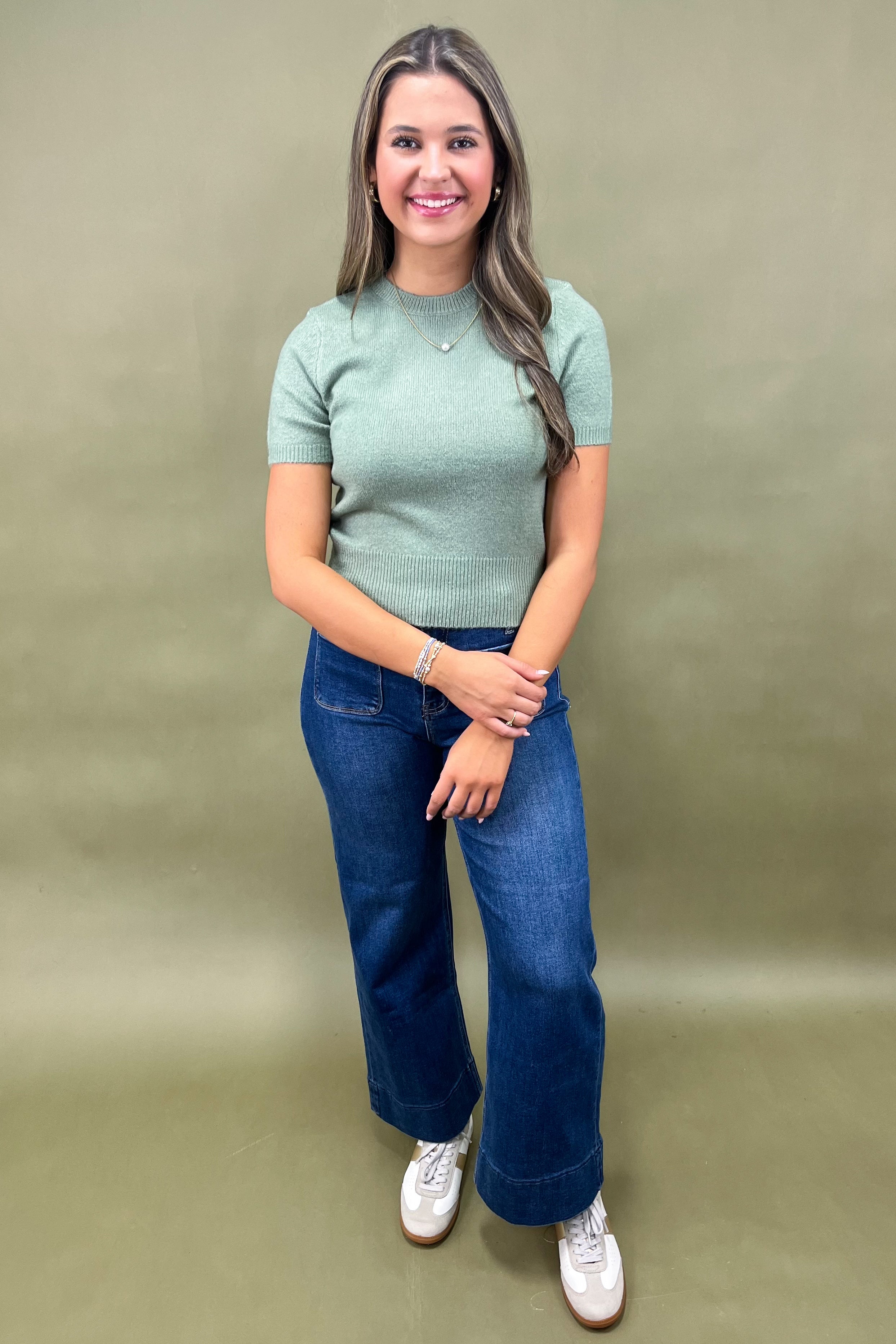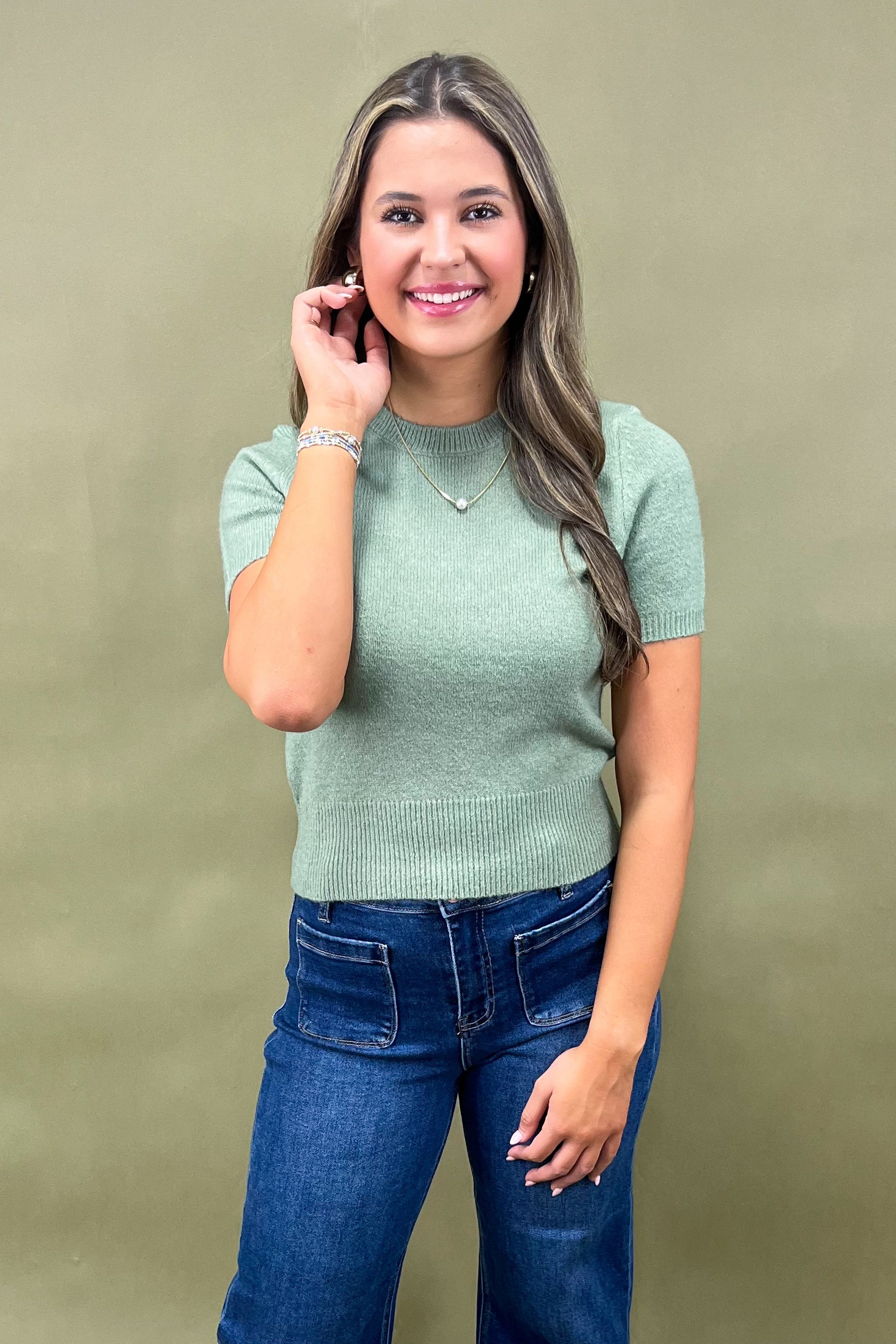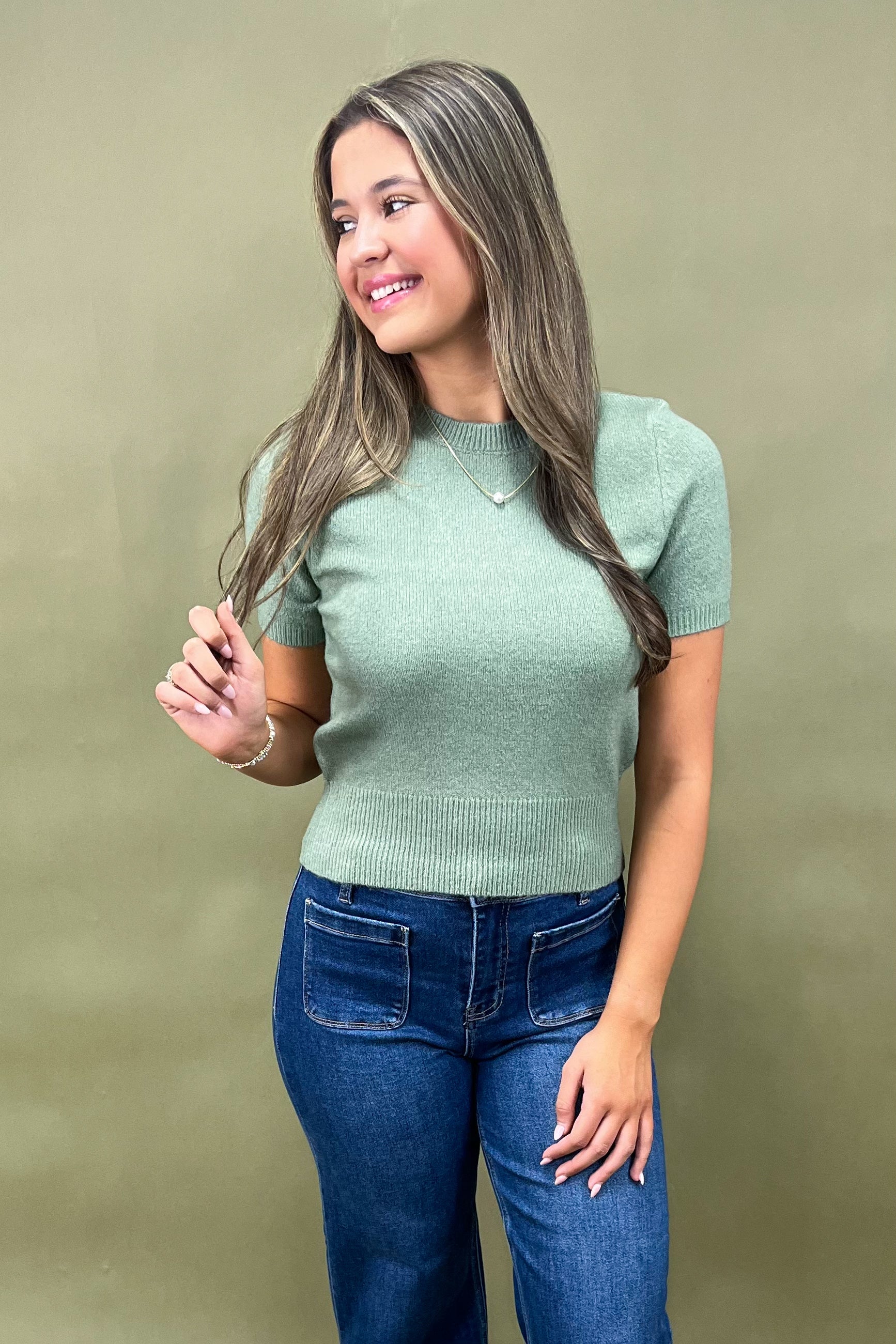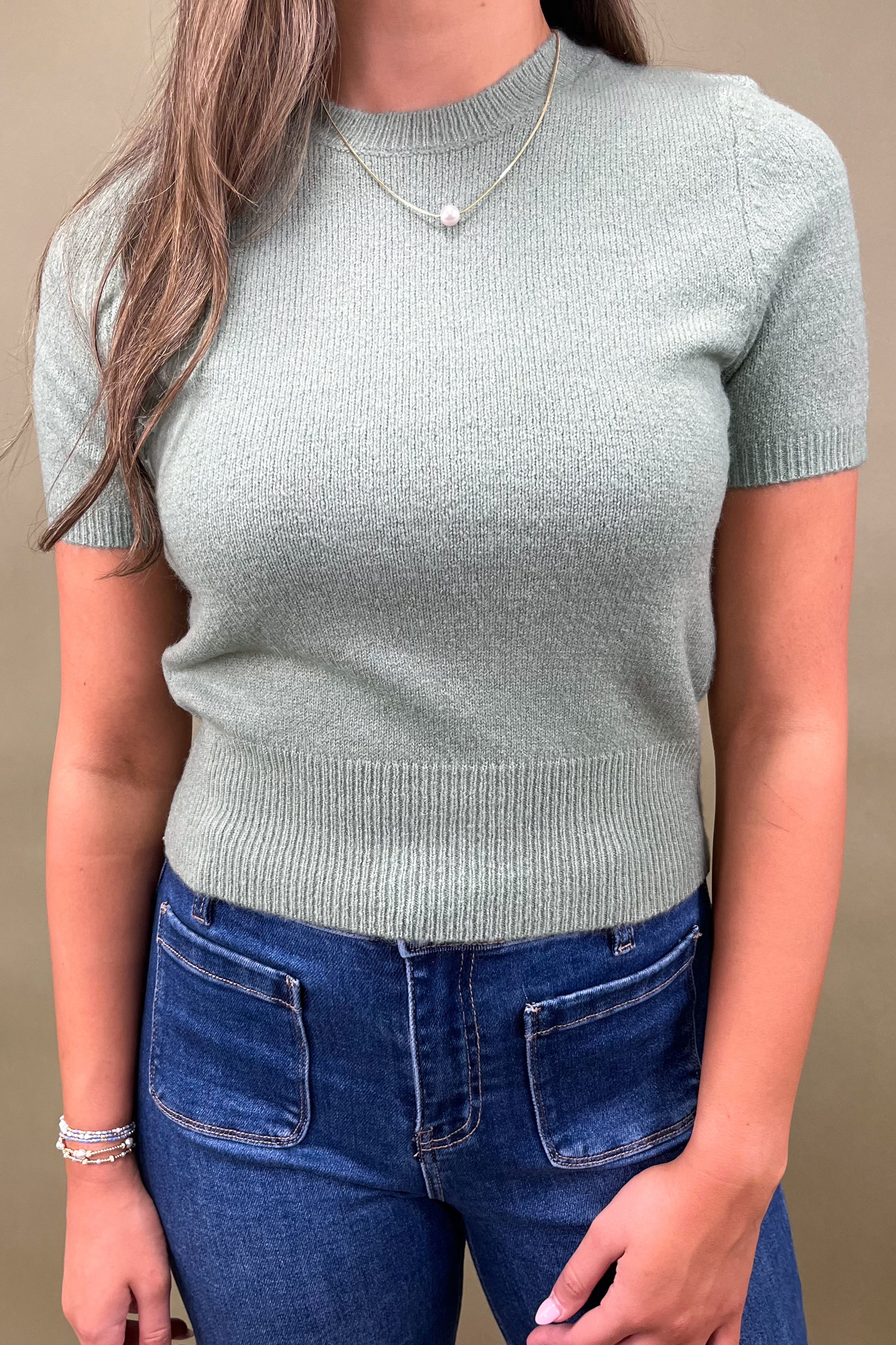 Her short sleeve cut makes her easy to layer, and her sage green shade gives her that boutique-exclusive feel. She’s simple, but she’s special—because she adapts to you and whatever your day has planned.