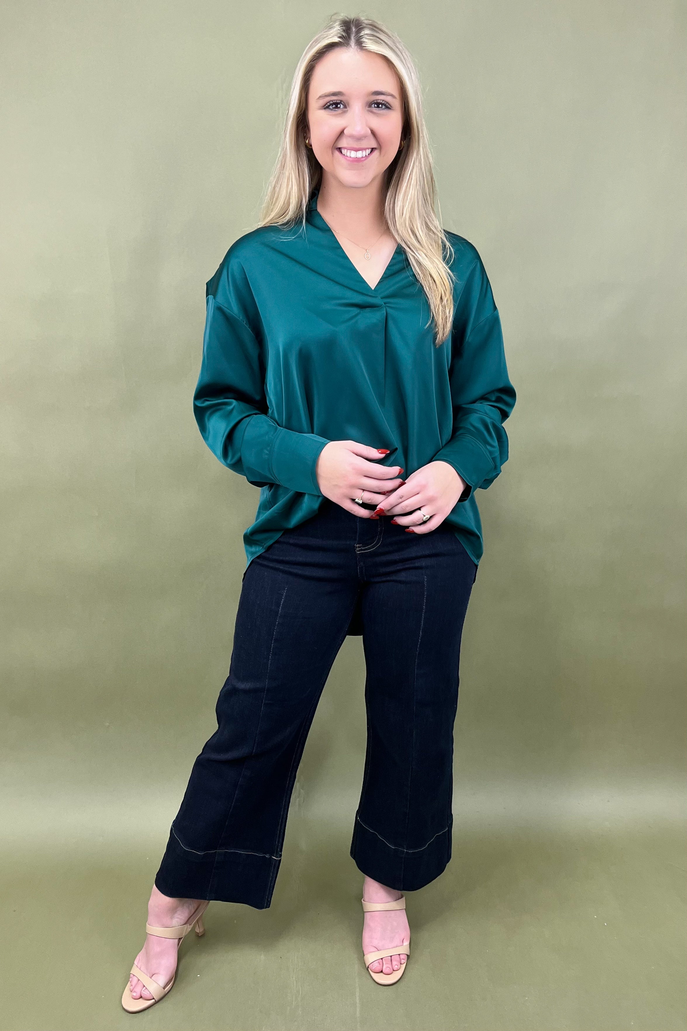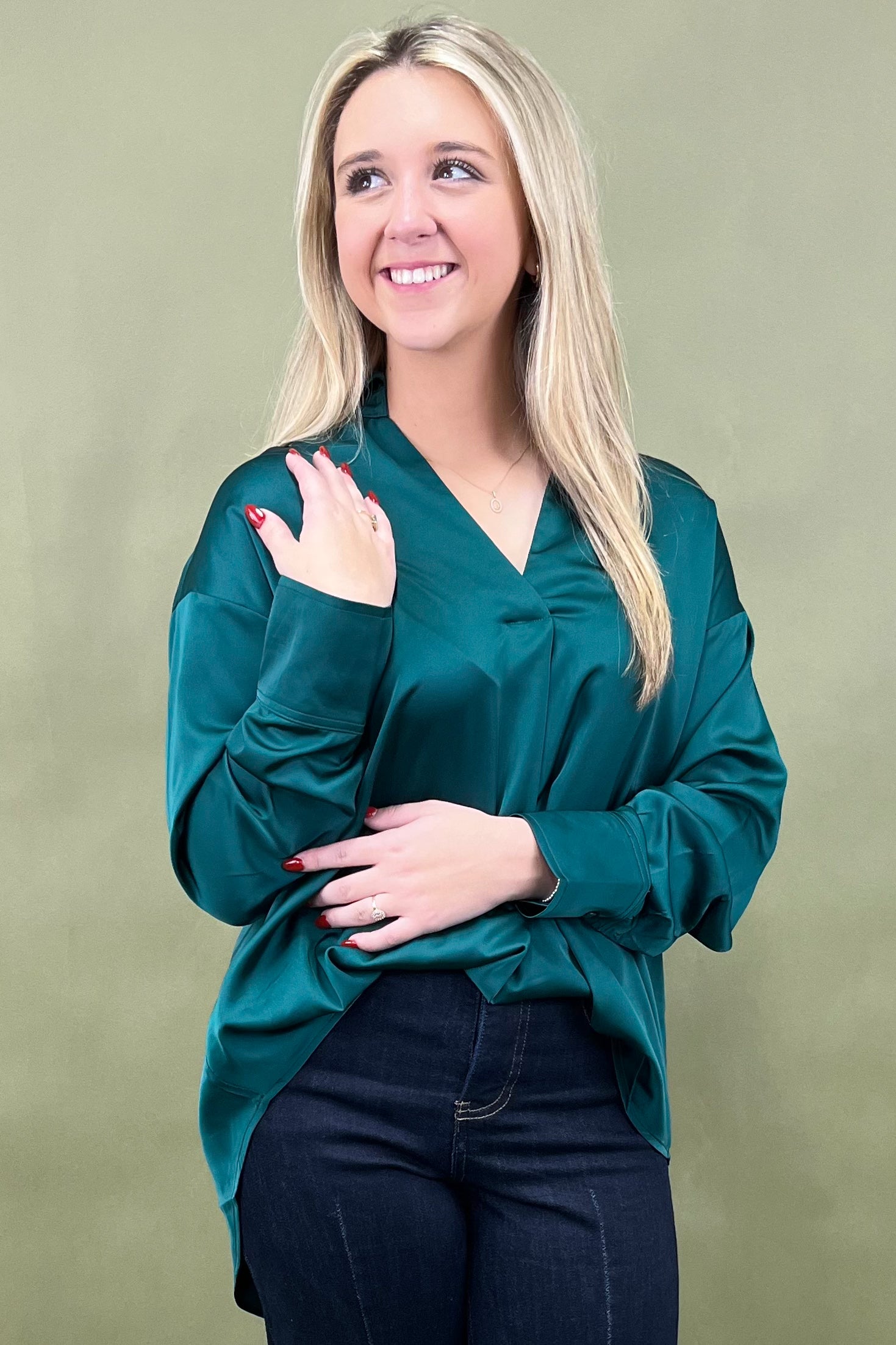 Some tops are just destined to make a statement, and the Emerald Elegance Top does exactly that. With her silky satin-like finish, rich jewel-tone color, and flowy-yet-polished silhouette, she’s your shortcut to looking chic—whether you’re in the office, out for dinner, or celebrating something special.