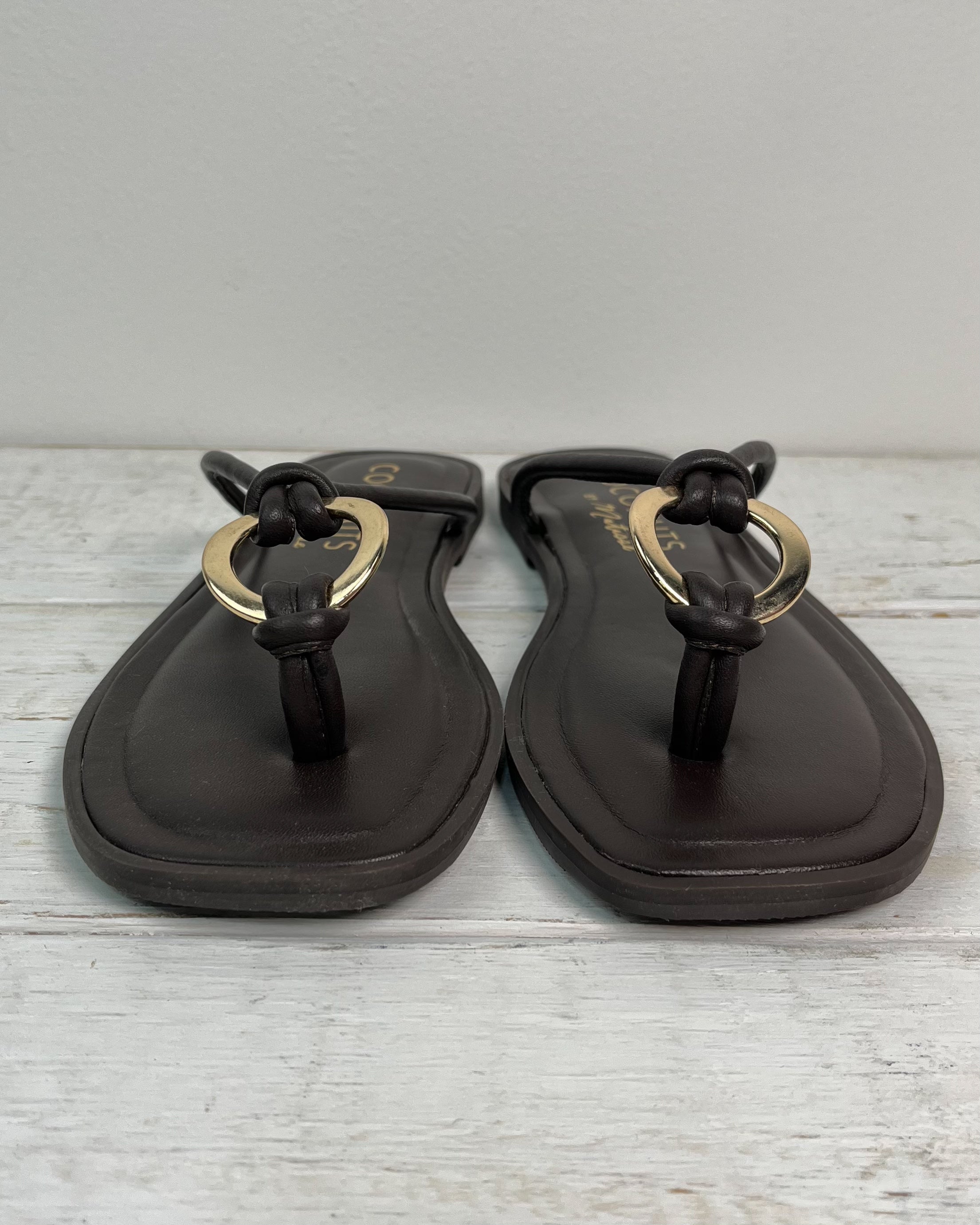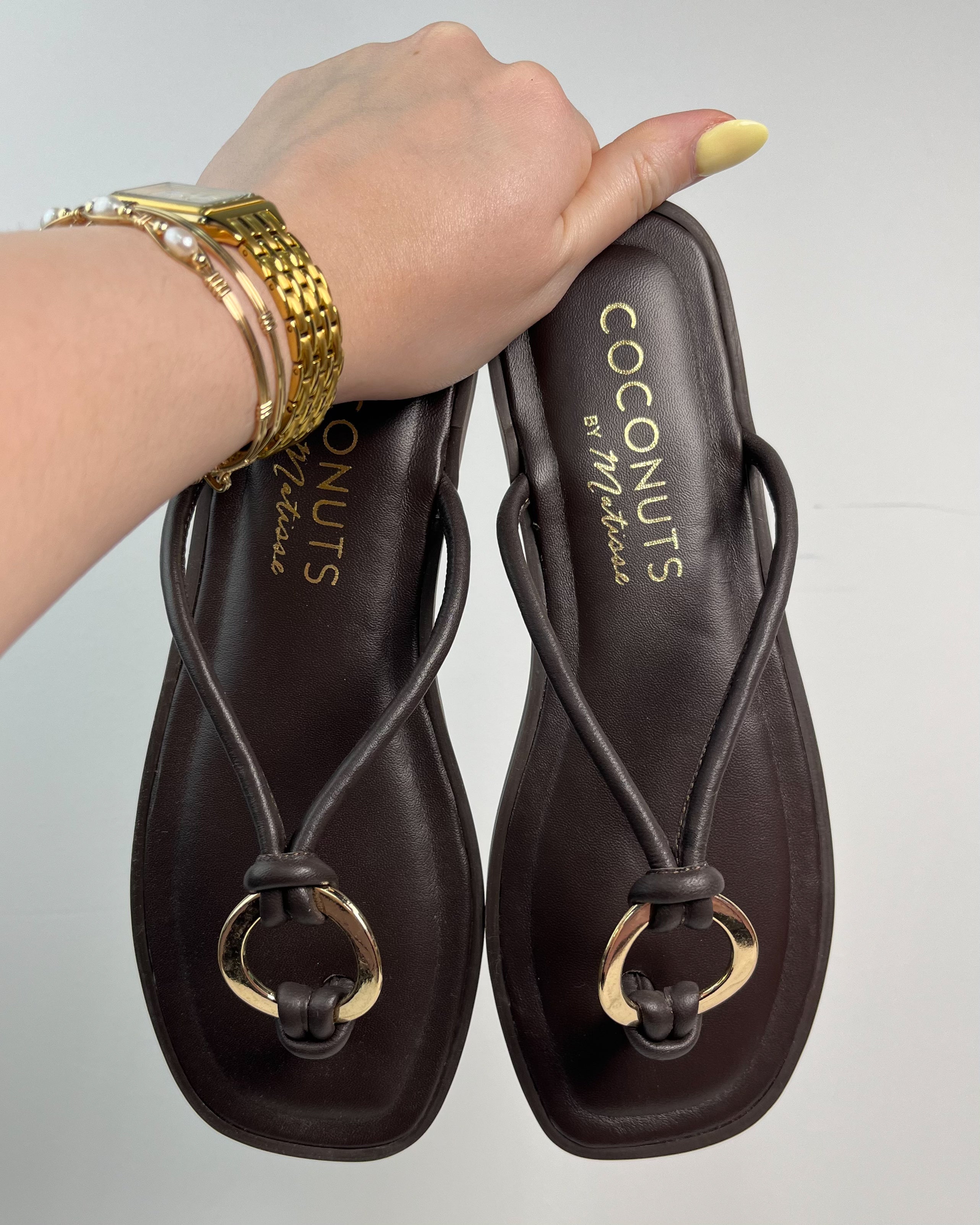 Designed with a slim thong-style strap and a statement gold ring detail, this sandal adds just the right amount of interest while still keeping things clean and versatile. The flat sole and cushioned footbed make it an easy choice for everyday wear, whether you’re dressing up or keeping it casual.