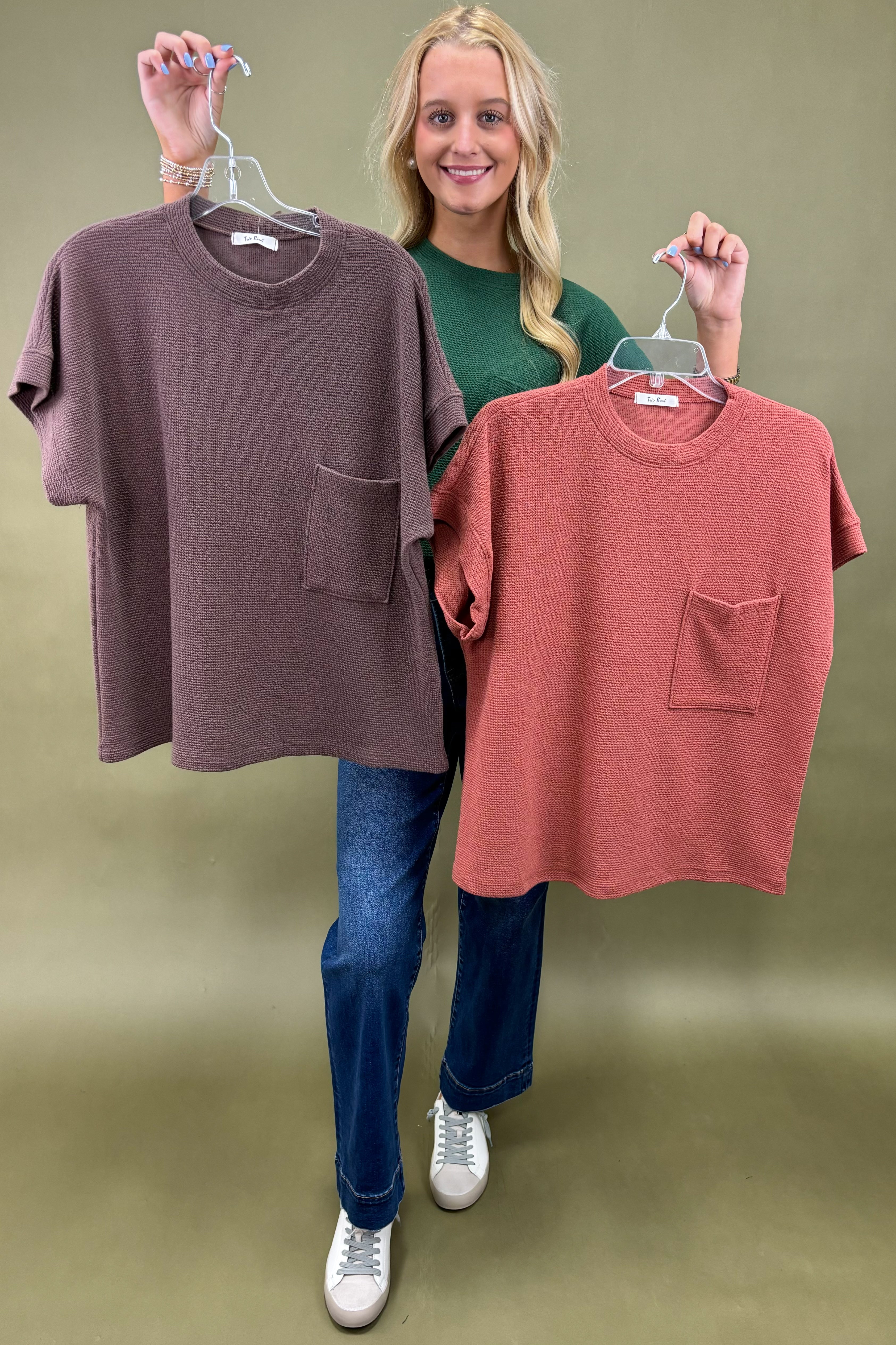 Meet the everyday top you’ll reach for again and again—The Go-To Comfort Textured Top. This simple yet elevated piece takes your classic t-shirt silhouette and gives it a modern twist with a soft textured fabric, a relaxed fit, and a statement front pocket. Available in three timeless shades—brown, mauve, and green—it’s the ultimate versatile staple to build endless outfits around.
