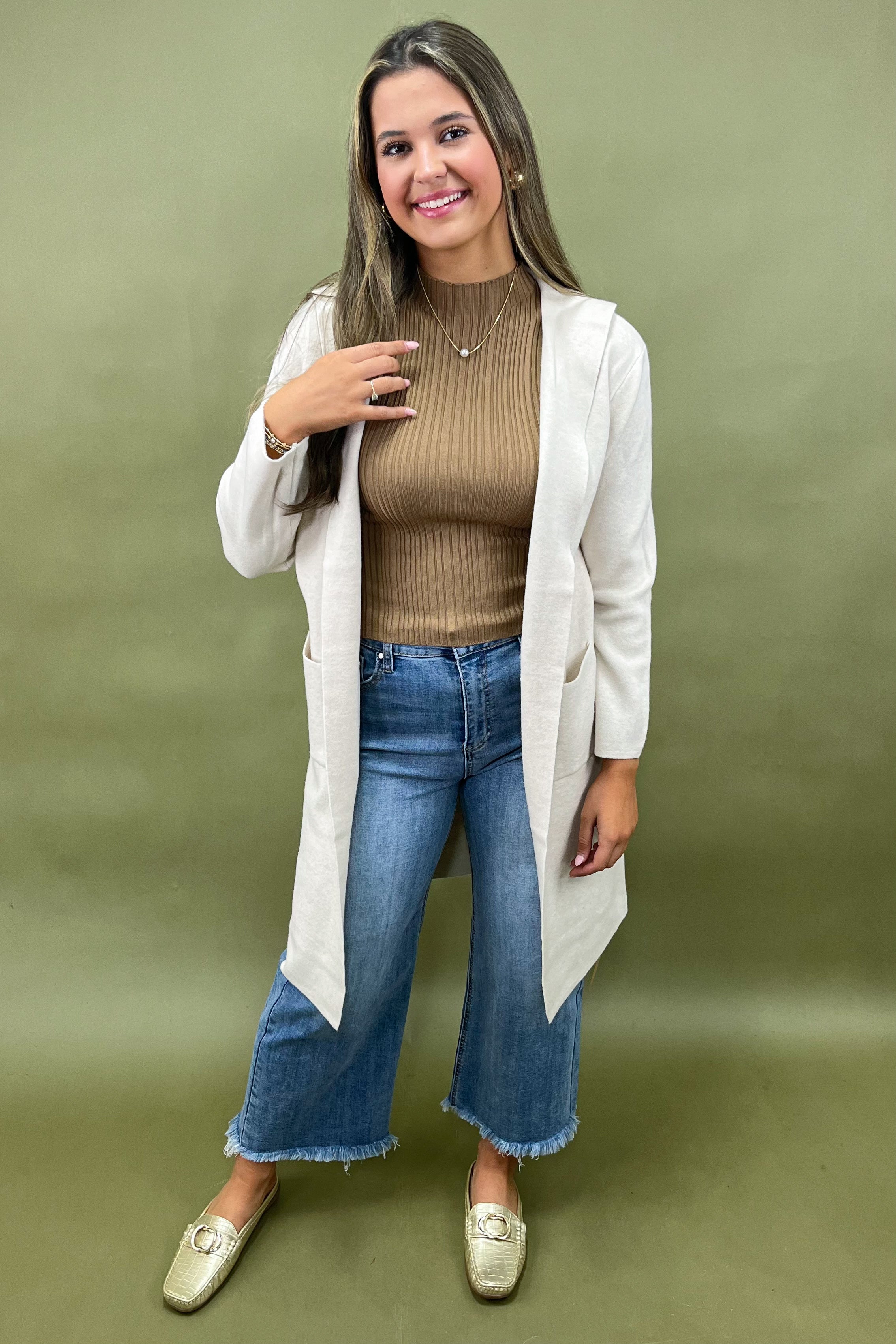 When comfort calls and style answers, you get the Hearth & Haven Hooded Cardigan. This dreamy cream knit brings the perfect blend of cozy warmth and laid-back polish, making it one of those “throw-on-and-go” pieces you’ll reach for over and over again. Whether you’re cuddled up on a Sunday morning, heading out for errands, or layering over a sleek outfit for a night by the firepit, she’s got that timeless charm with a modern twist.
