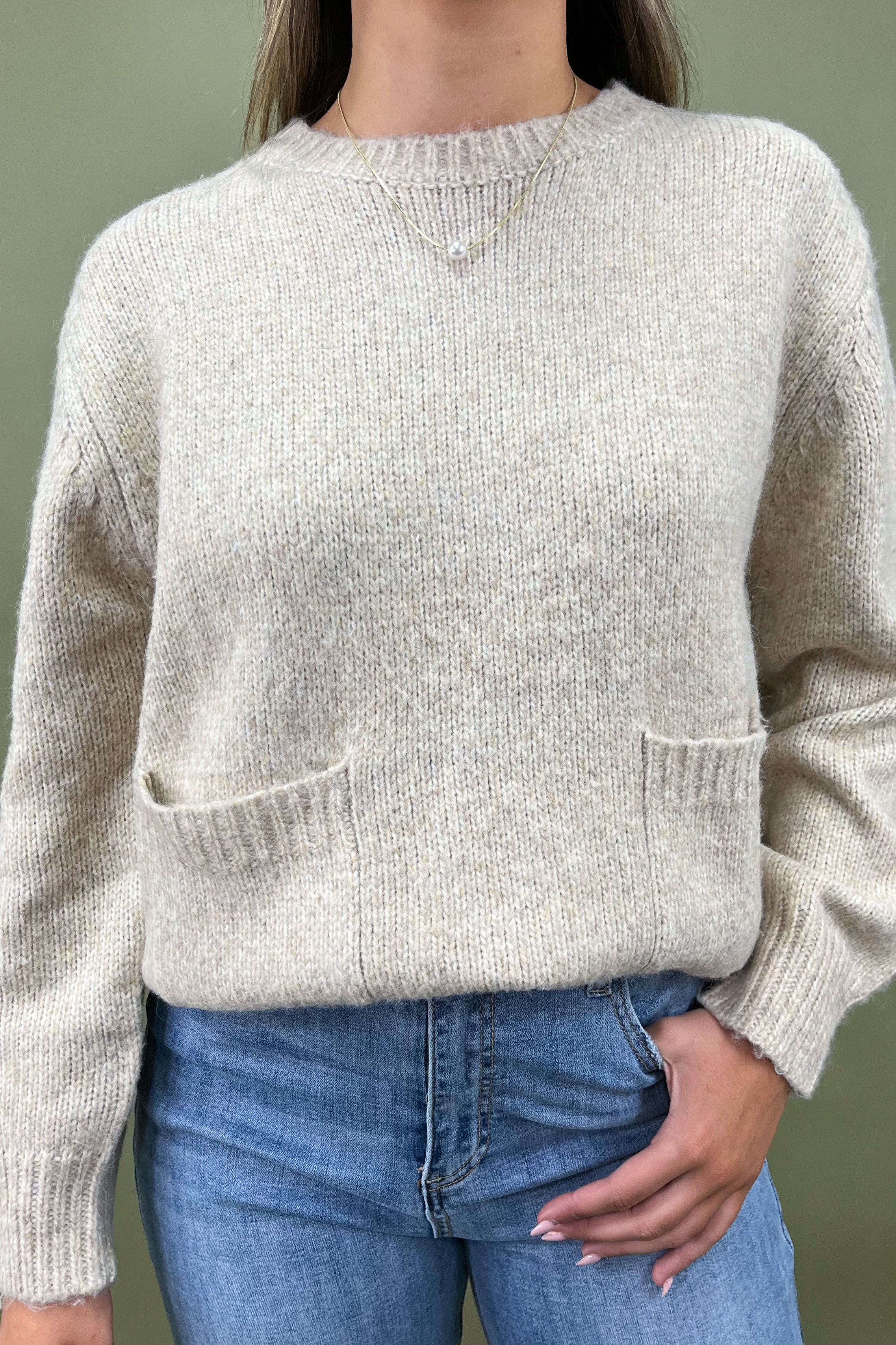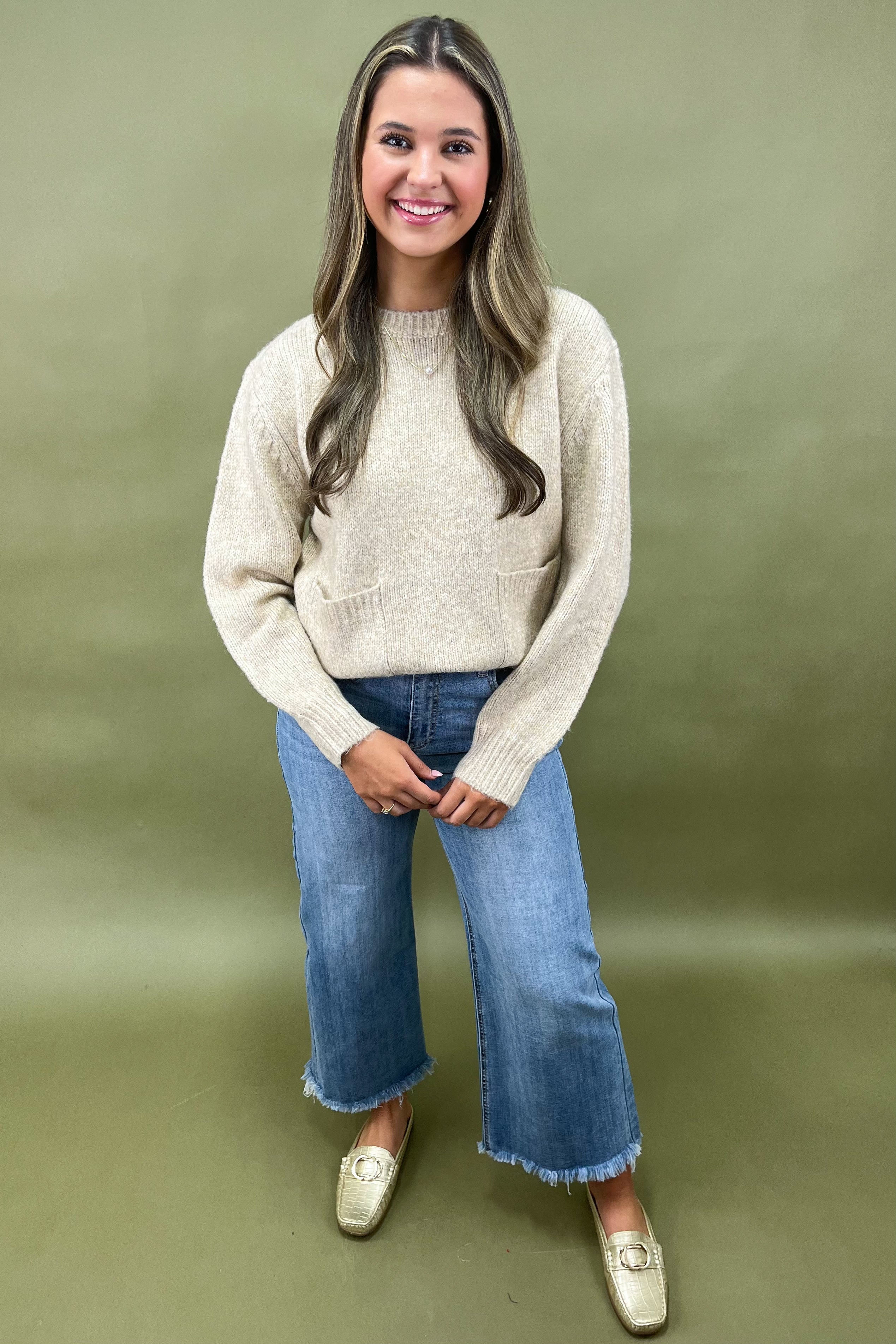 The classic crew neckline keeps things simple and timeless, while the ribbed trim at the neck, cuffs, and hem ensures a flattering fit that holds its shape. But the sweetest detail? The front patch pockets—cute, functional, and oh-so-cozy. Perfect for slipping your hands into on a brisk morning or tucking away your favorite lip balm, they add just the right touch of casual charm.