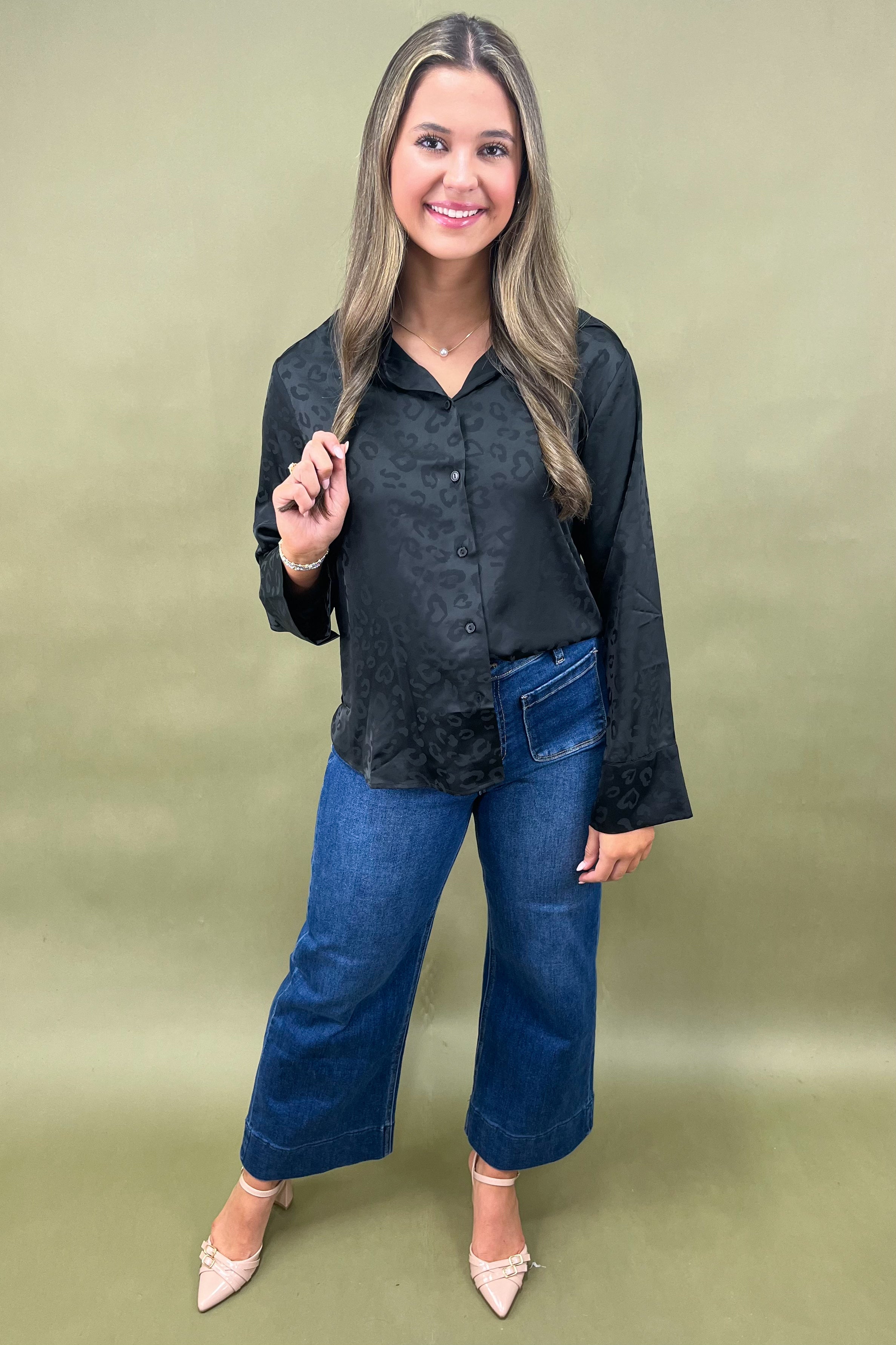 Turn heads with a subtle roar—the Midnight Leopard Top is here to bring a touch of bold elegance to your wardrobe. With her silky satin-like finish, sleek black-on-black leopard print, and classic button-down design, she’s the perfect mix of fierce and refined.