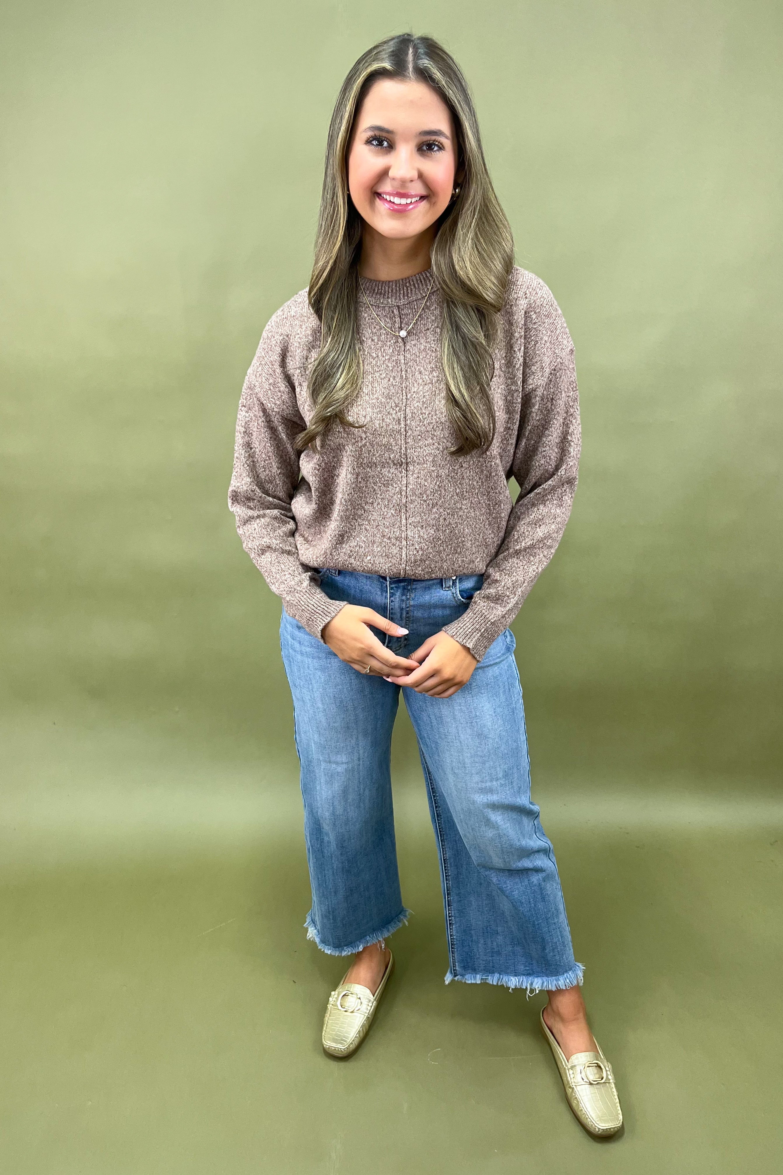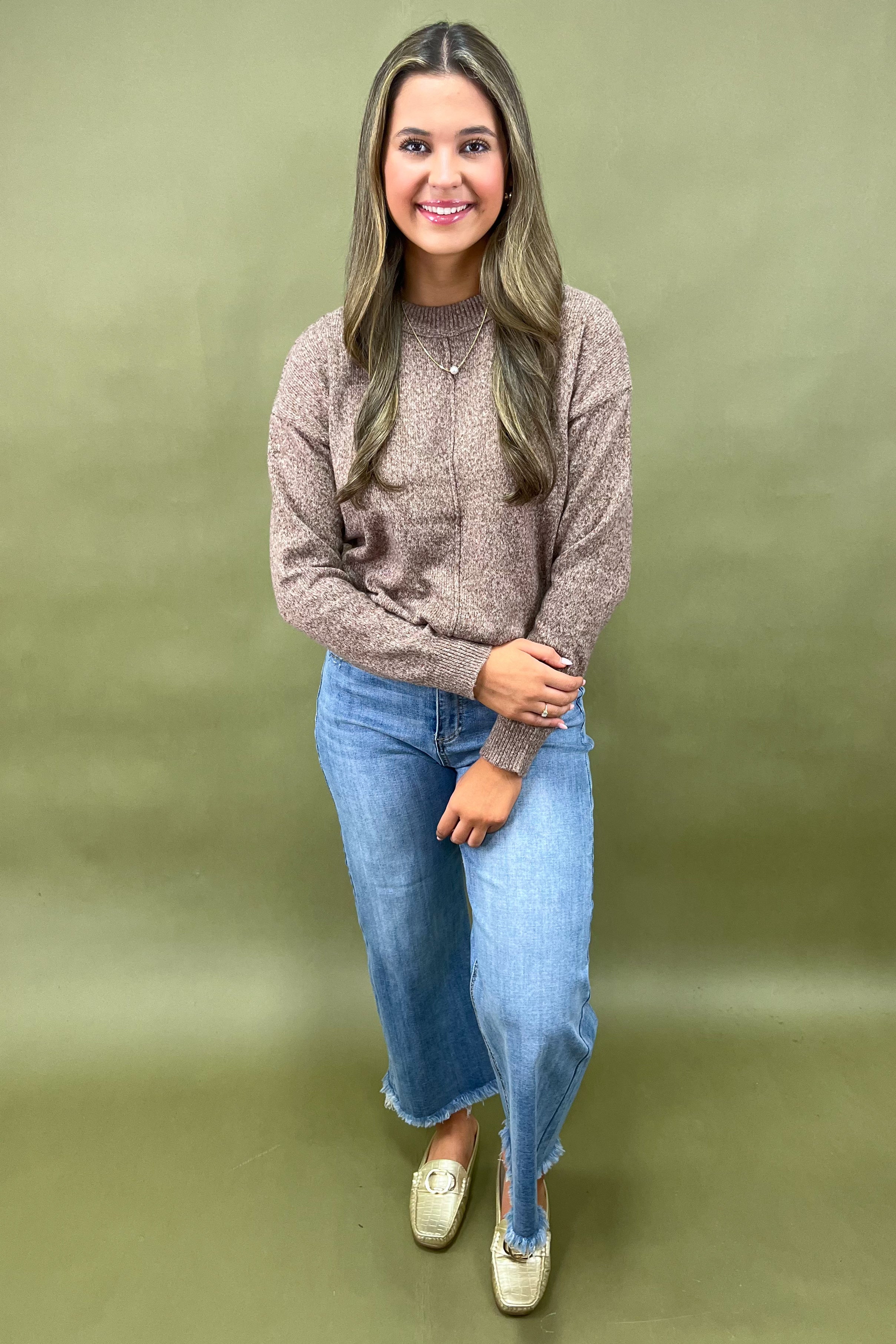 With her classic crew neckline, relaxed silhouette, and perfectly slouchy drape, she’s the definition of “throw on and go” done right. Whether you’re headed to brunch, running errands, or curling up for a cozy night in, The Mocha Moments Sweater is your reliable go-to.