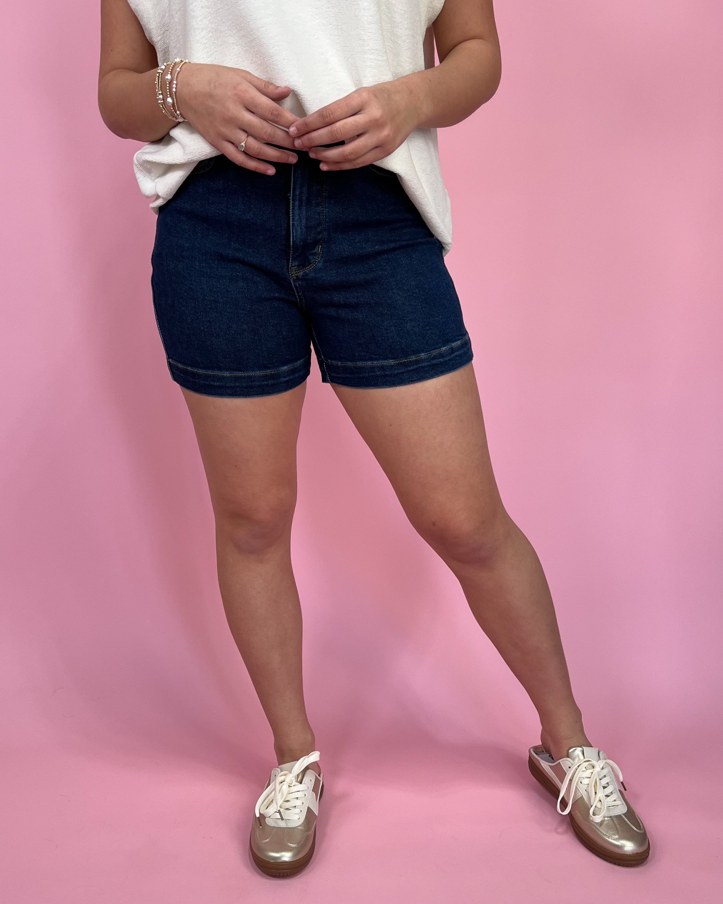 The dark wash keeps things sleek and slimming, while the length is pure perfection â not booty short, not bermuda, just classy, cute, and wearable with everything. Whether youâre pairing them with a graphic tee and sneakers or dressing them up with a flowy blouse and wedges, the Rosie Shorts work HARD for your wardrobe.