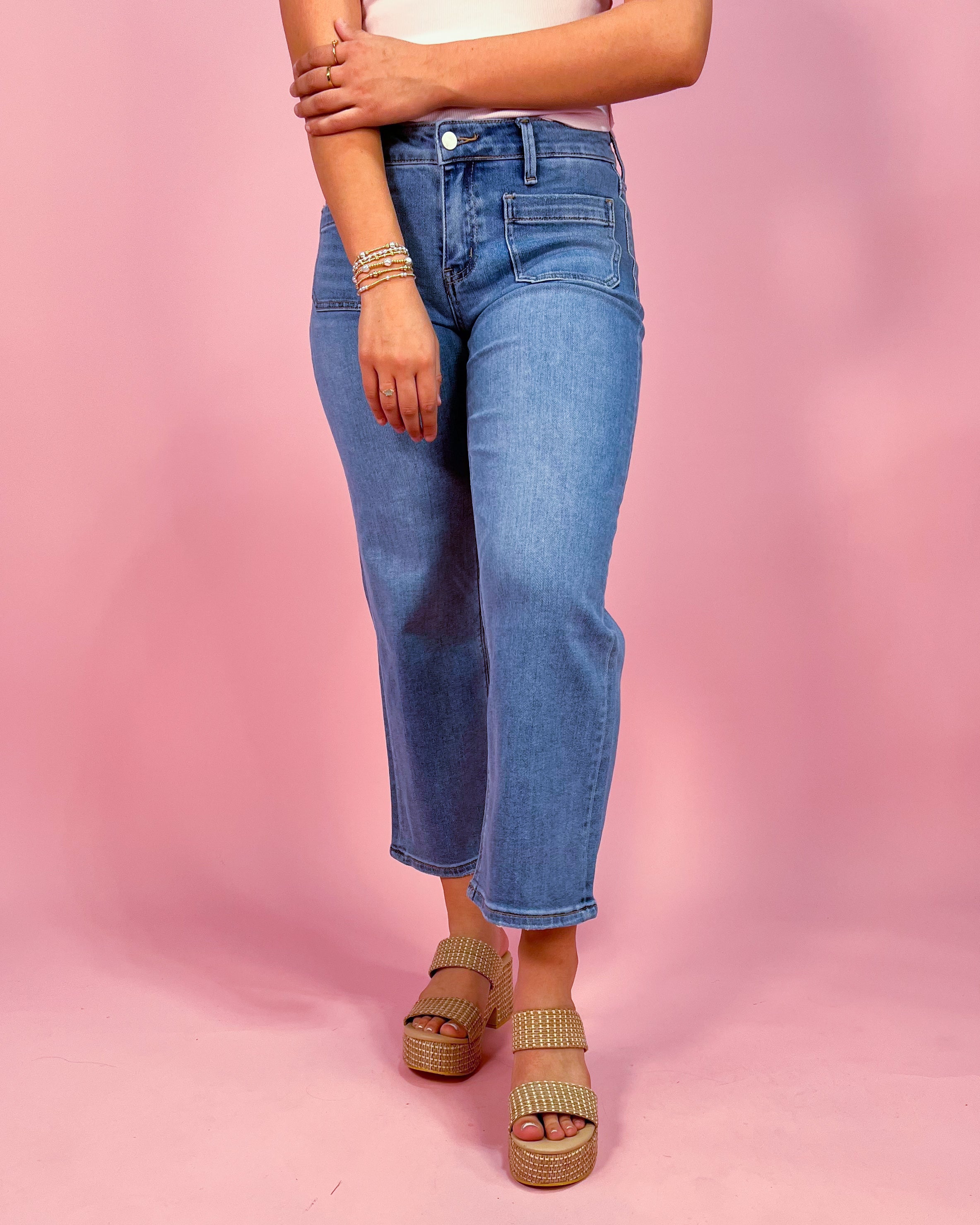 These are the jeans your everyday outfits have been waiting for. The Valencia MR Slim Wide Patch Pocket Denim Jeans combine a flattering mid-rise fit with a modern slim wide leg silhouette, giving you that effortlessly elevated look without sacrificing comfort.