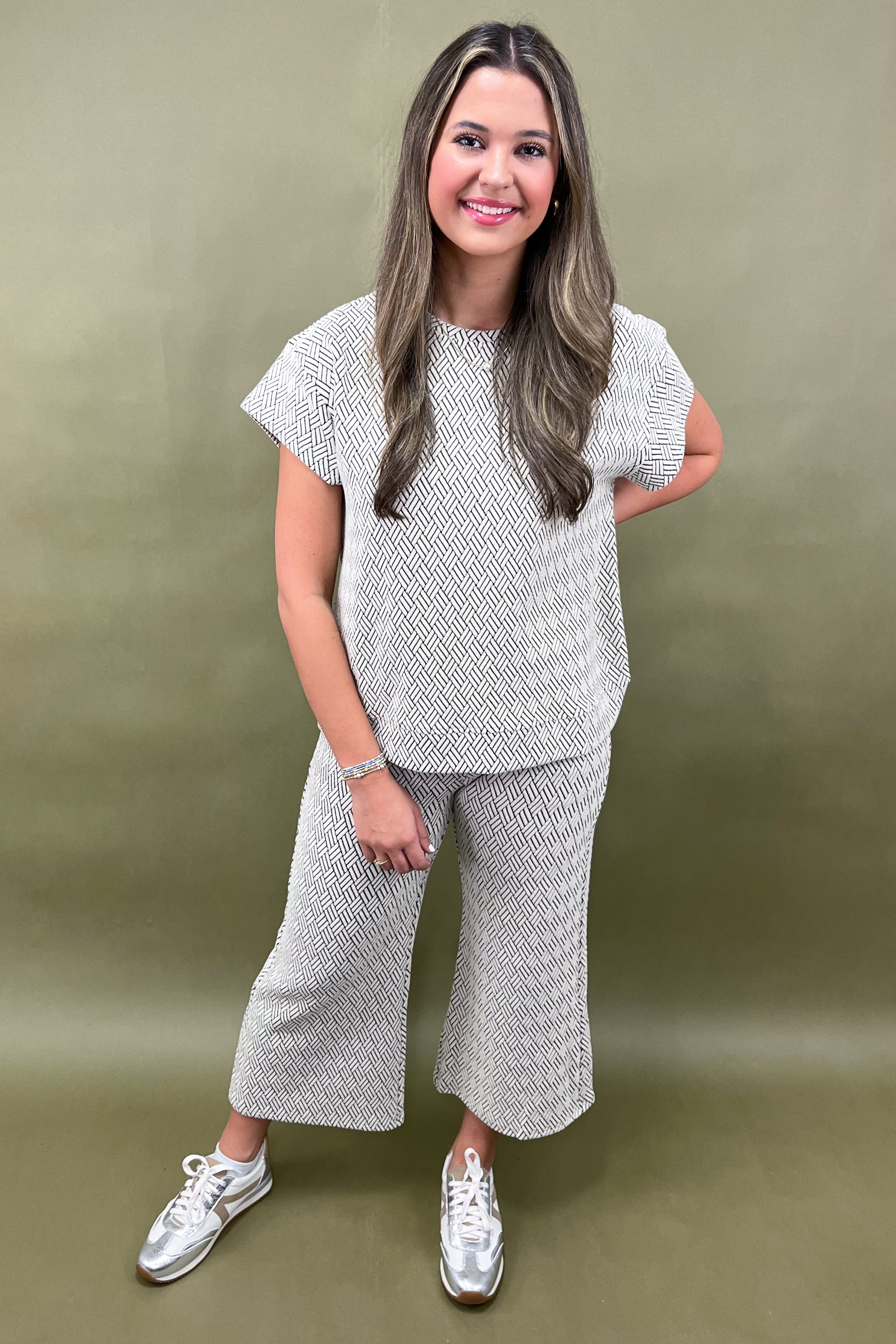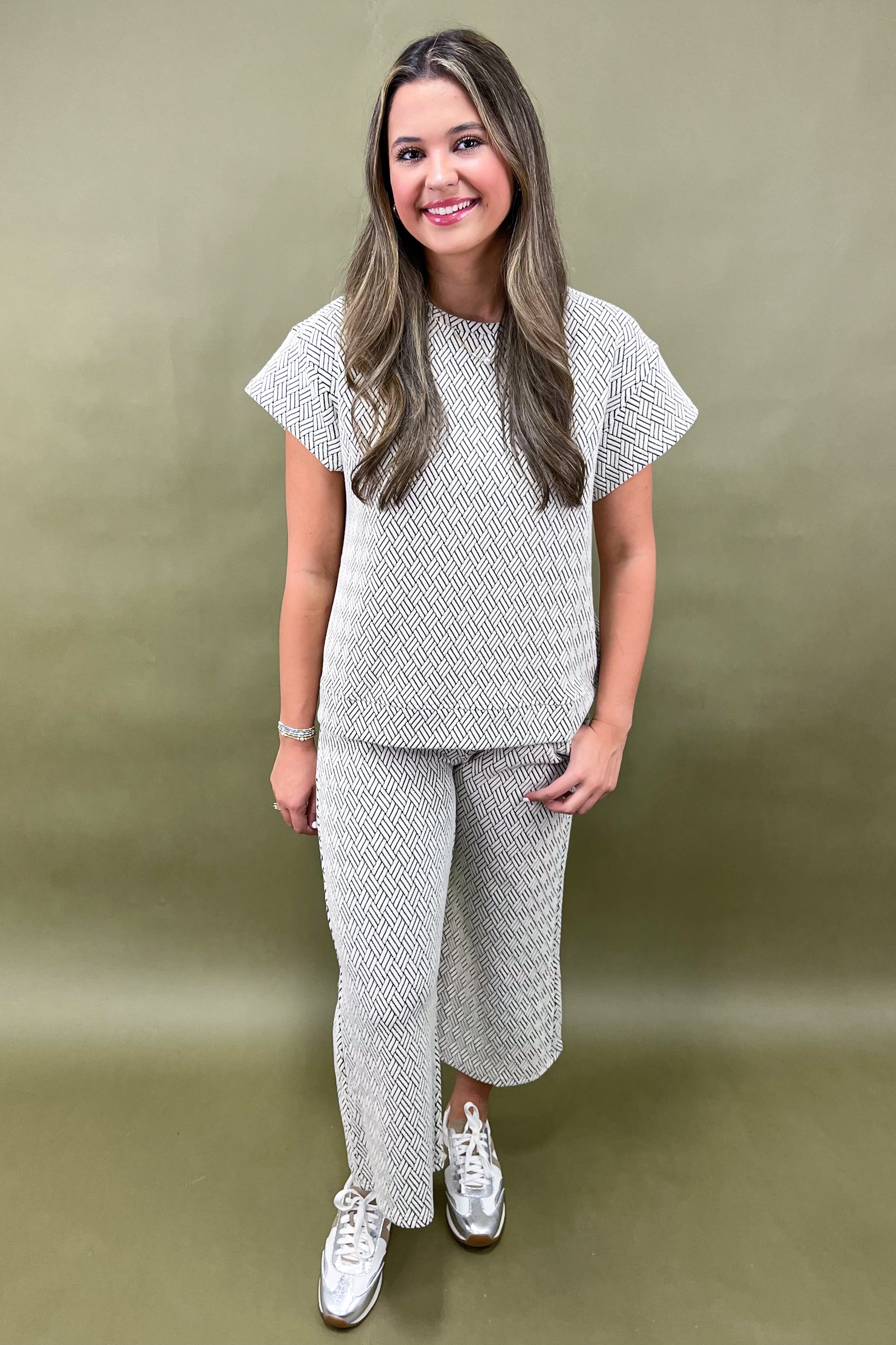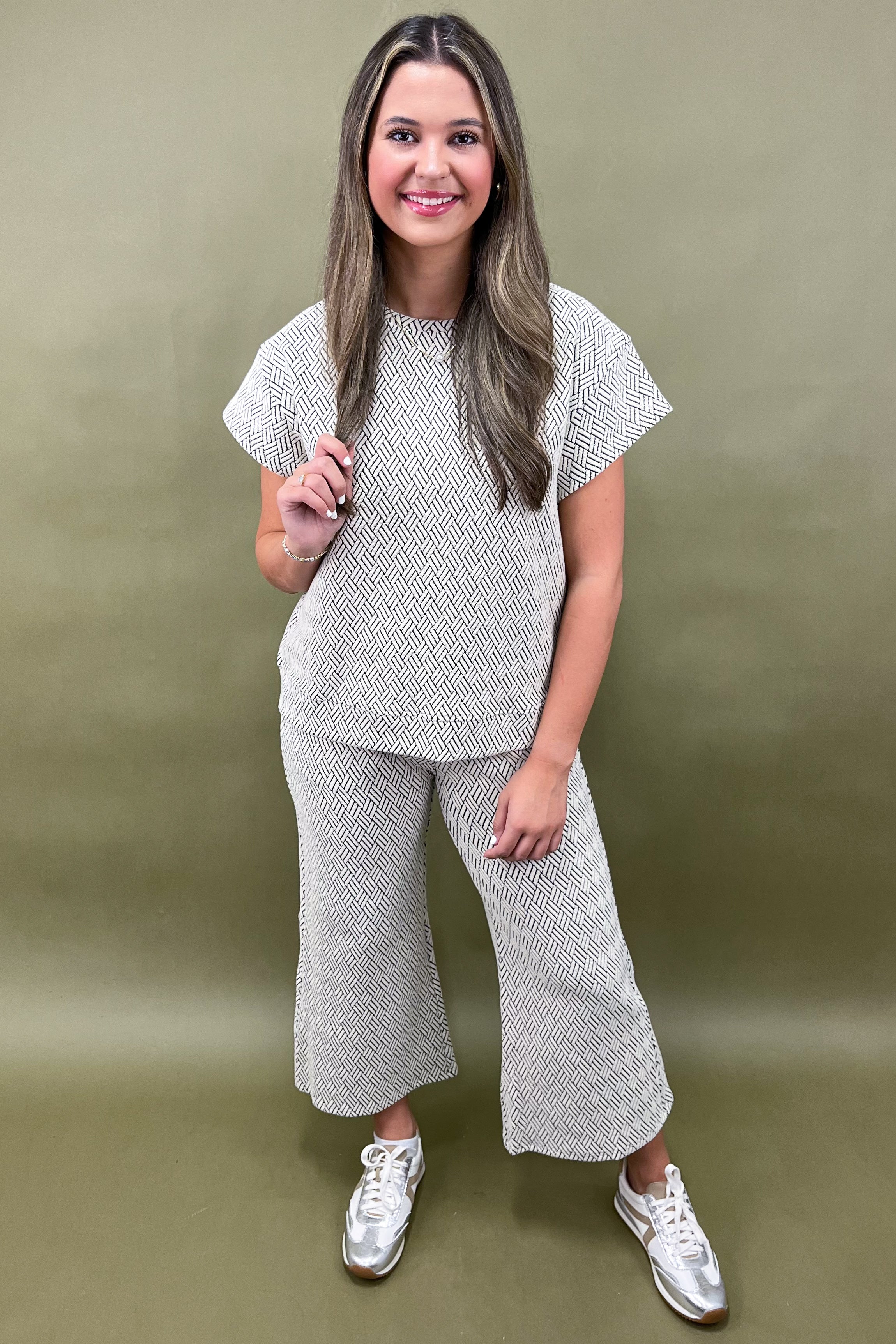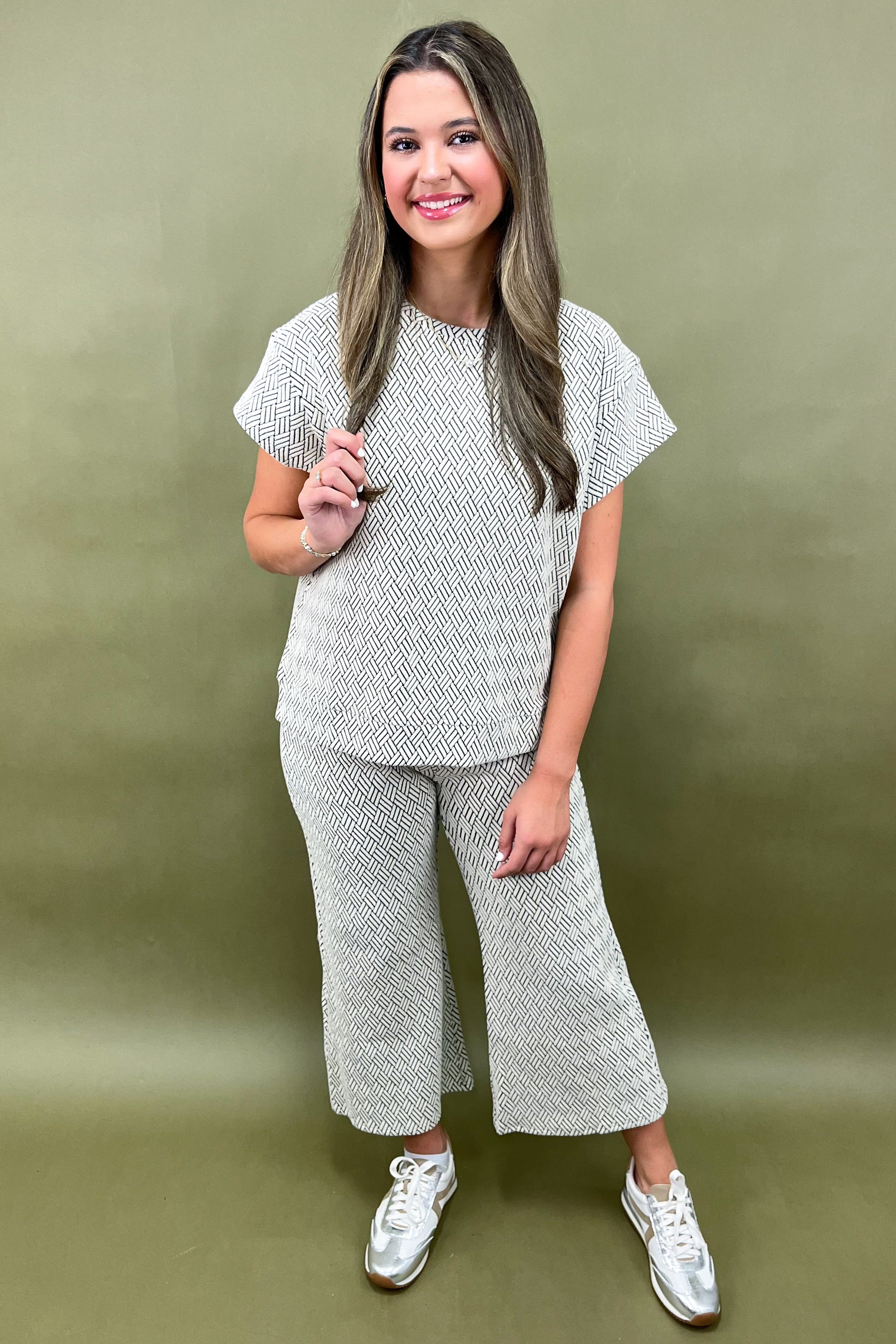 The Woven Charm Set is the kind of outfit you’ll want to live in. She’s casual yet polished, textured yet minimal, and endlessly easy to style. The basketweave texture catches the eye, giving her a boutique feel that goes way beyond ordinary loungewear.