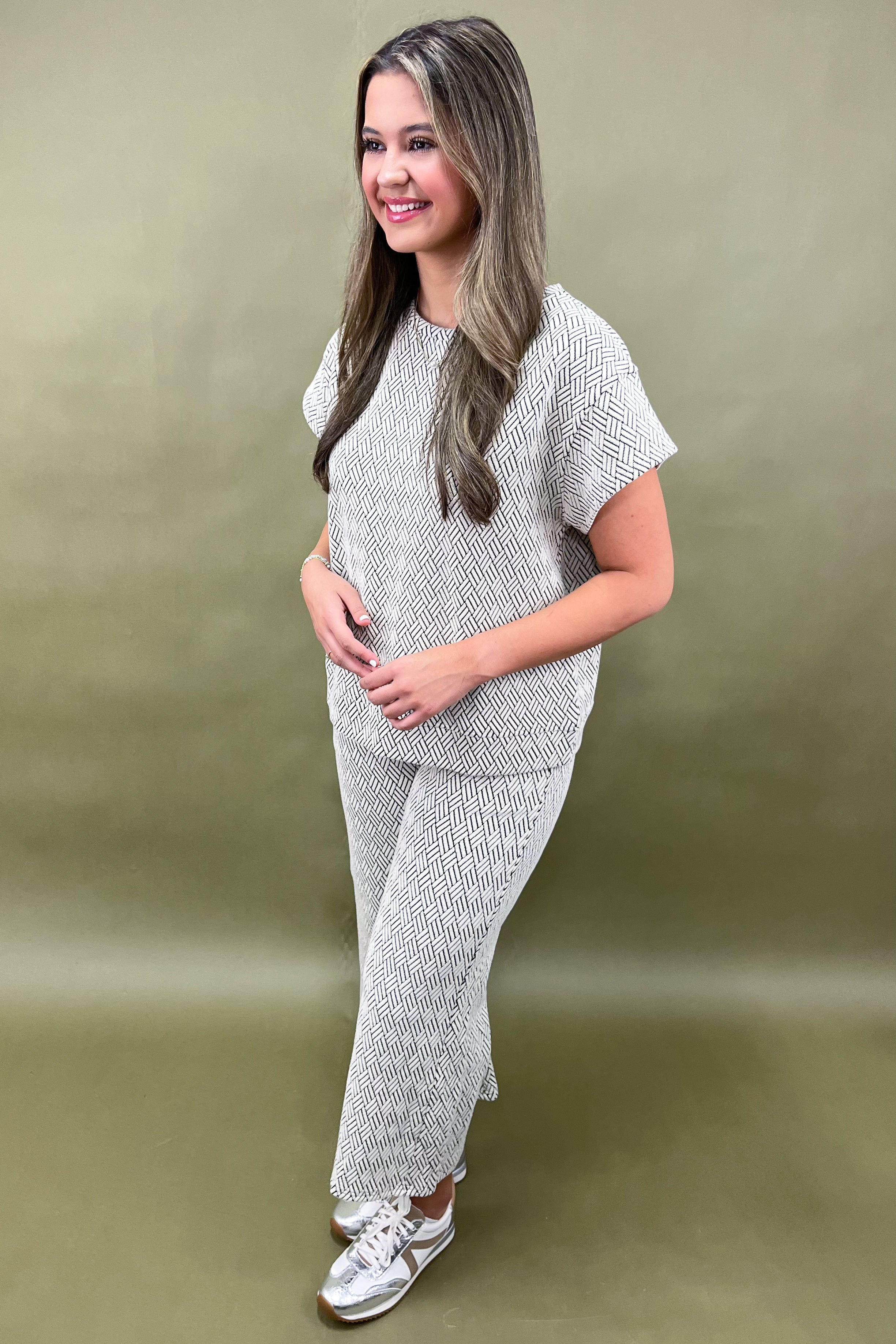 The top features a relaxed silhouette with short sleeves and a classic crew neckline, giving you a flattering and fuss-free fit. The matching bottoms keep the look cohesive, featuring the same textured design for instant coordination. Together, the set delivers effortless style — like you put real thought into your outfit (even when you didn’t 😉). Separately, each piece is just as strong: style the top with denim shorts and sandals for warm days, or pair the bottoms with a slouchy sweater for cozy-cute vibes.