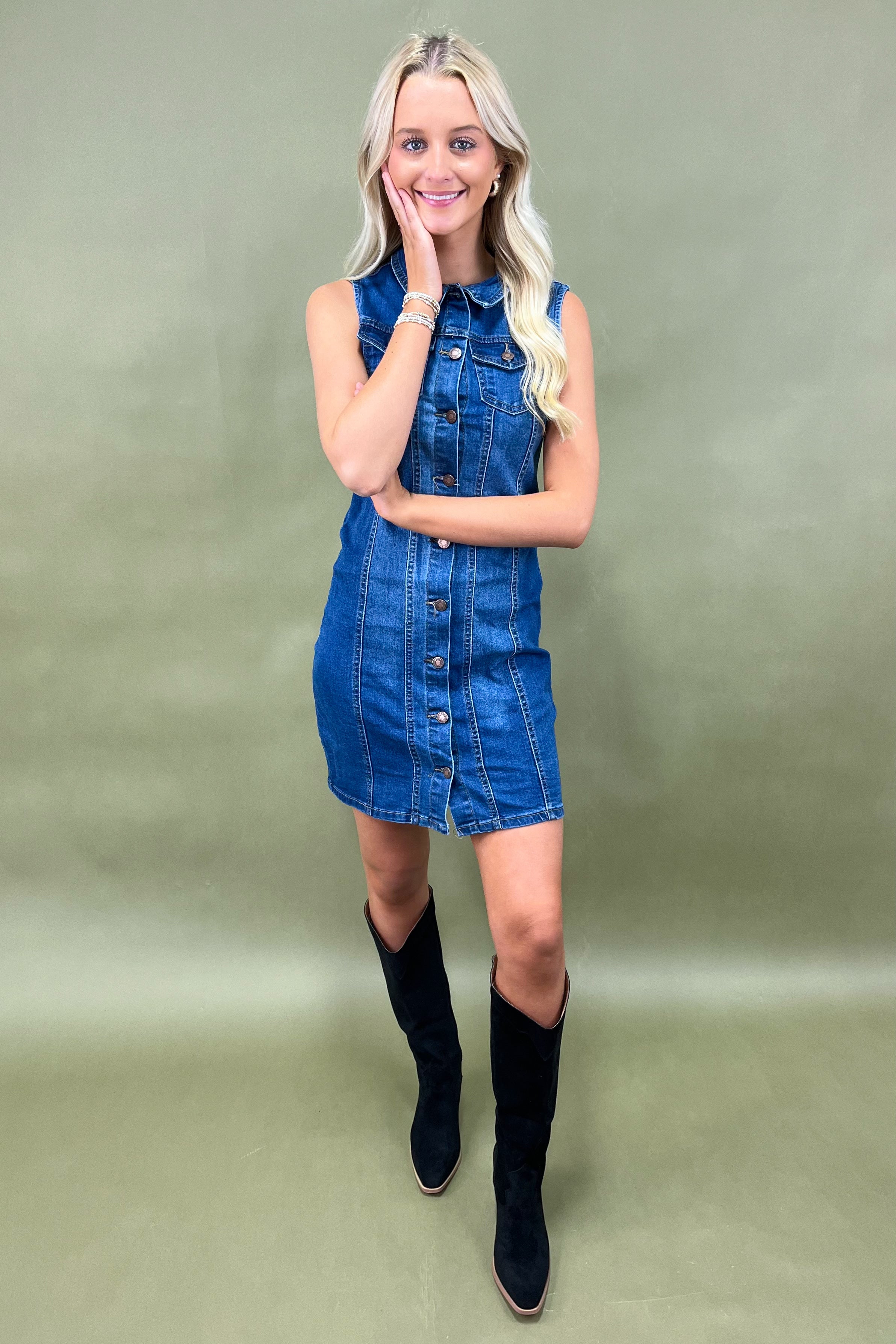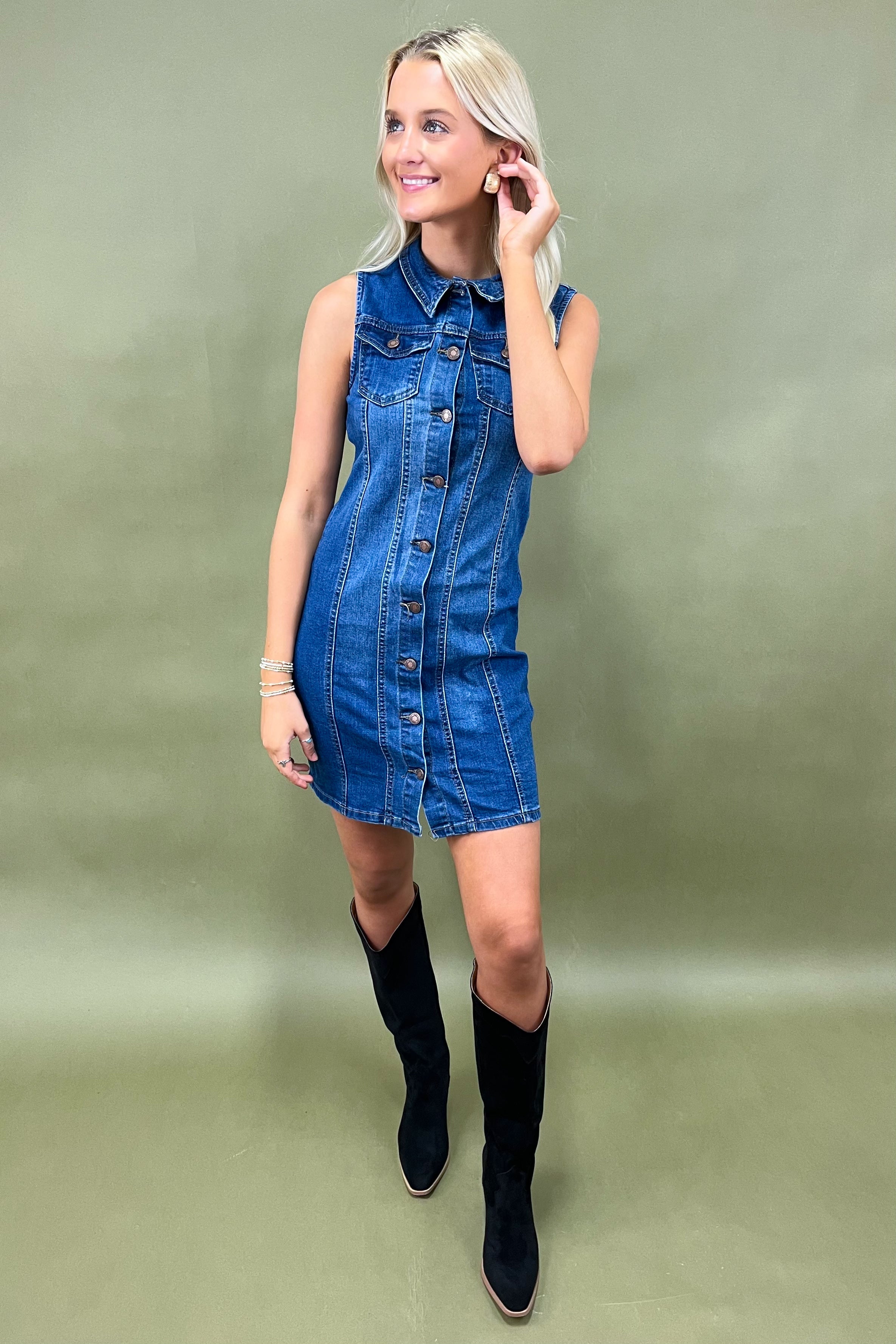 Think: the perfect mix of rodeo and runway. With her structured collar, silver snap buttons running all the way down, and bold seam detailing, she gives major vintage-western vibes but feels updated for today’s boutique babe. The sleeveless cut makes her a warm-weather favorite, and the curve-hugging fit ensures you look as confident as you feel.
