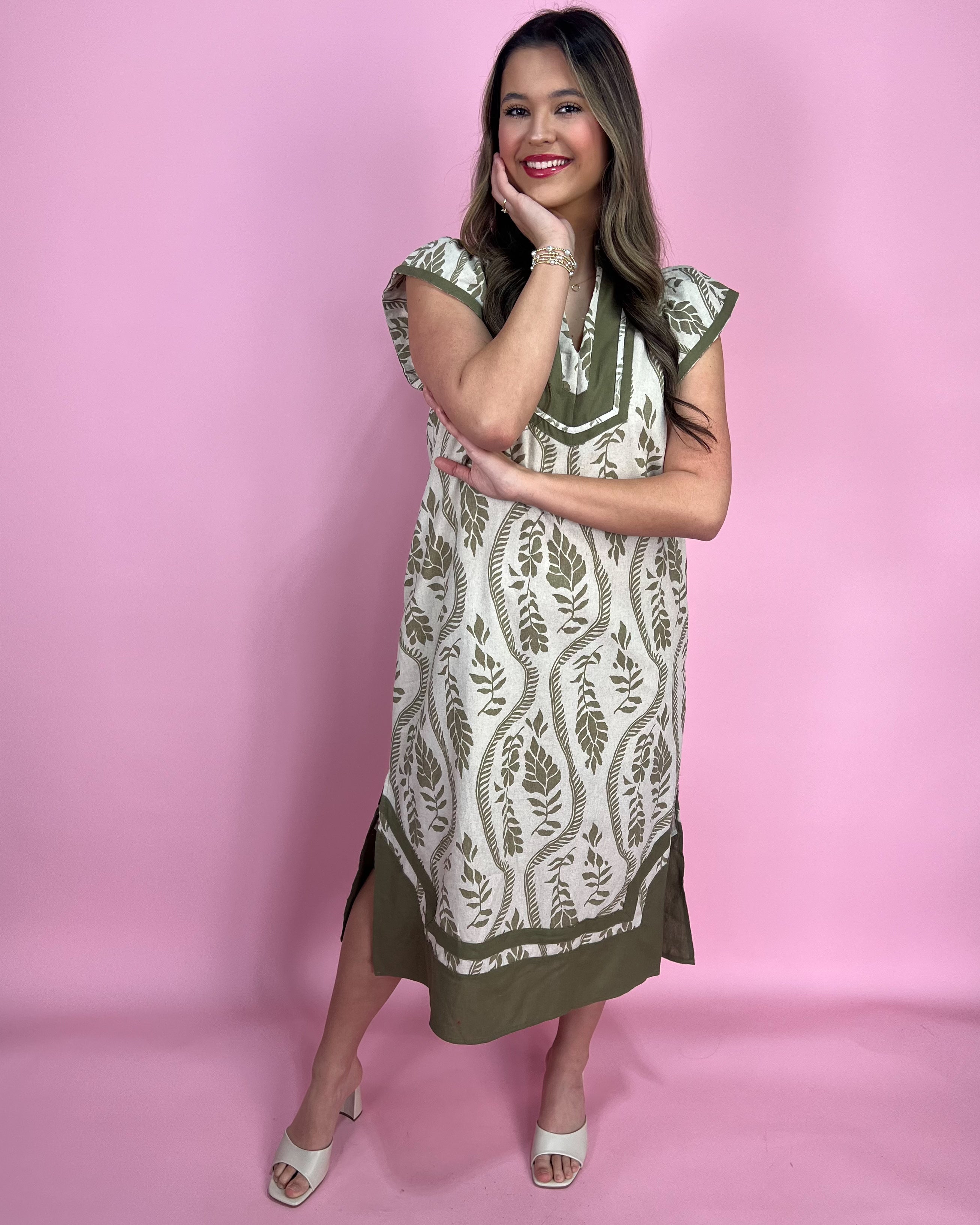 Okay but this dress is giving European vacation energy in the BEST way 😍✨ The olive + cream leafy print is so chic and timeless, and that linen-blend feel makes it perfect for warm sunny days when you still want to look put together 🤍🌞 It’s effortless, classy, and totally that “where did you get that?” kind of piece!