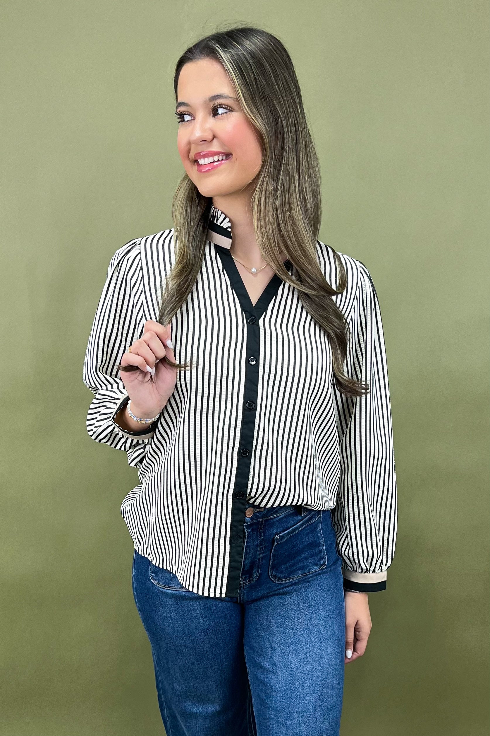 The vertical black-and-ivory stripe pattern elongates your frame while lending a crisp, tailored feel. The fabric, a soft yet structured cotton-poly blend, holds its shape beautifully — lightweight enough for layering, yet substantial enough to wear year-round. The contrasting black placket and collar trim, paired with a hint of taupe-beige accent, add designer-inspired depth to this already striking top.
