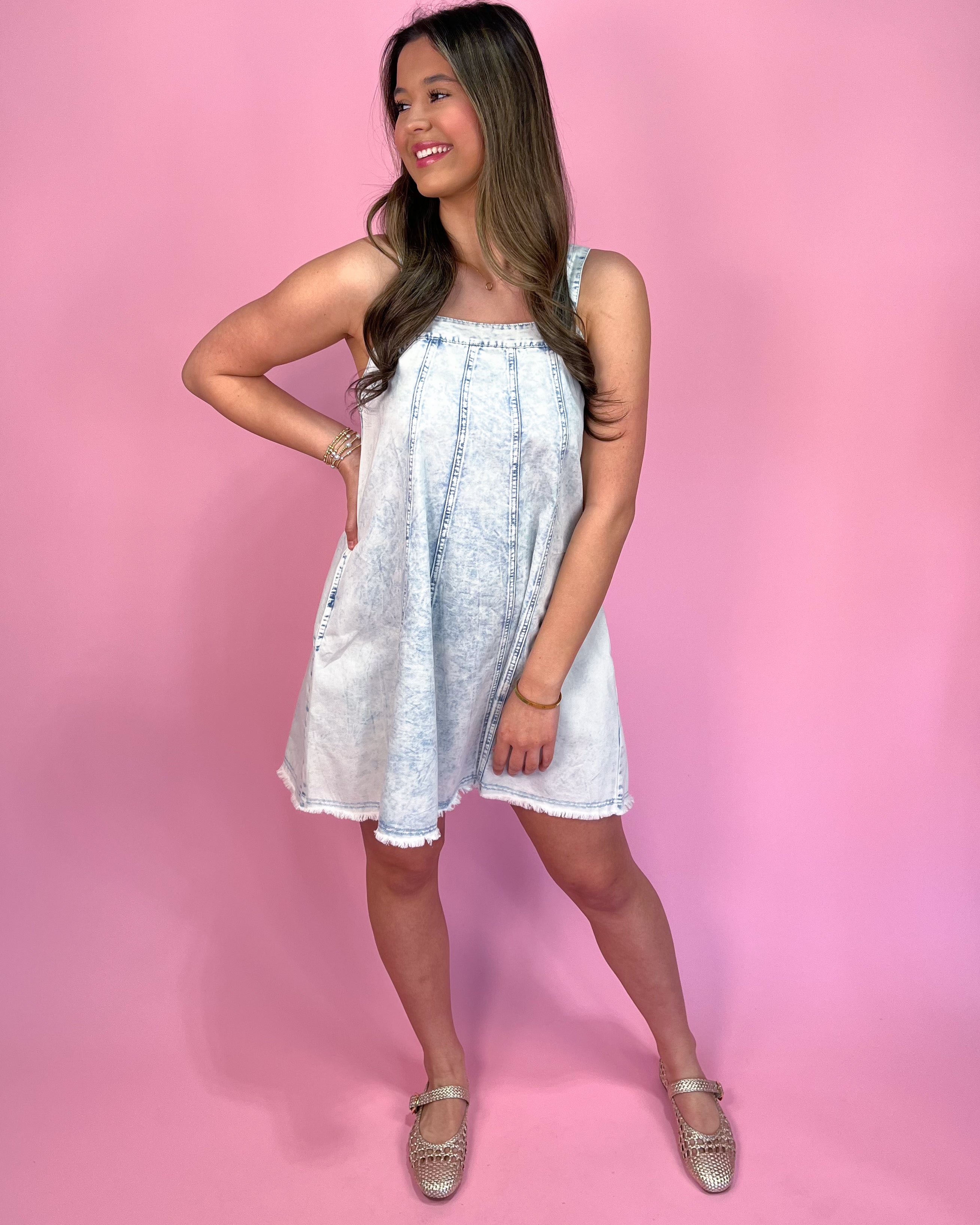 Featuring a soft, faded wash with a structured-but-comfy fit, this dress is made to stand out in the sweetest way. The adjustable tie straps add a fun feminine touch while keeping it easy to customize your perfect fit. 🎀💙