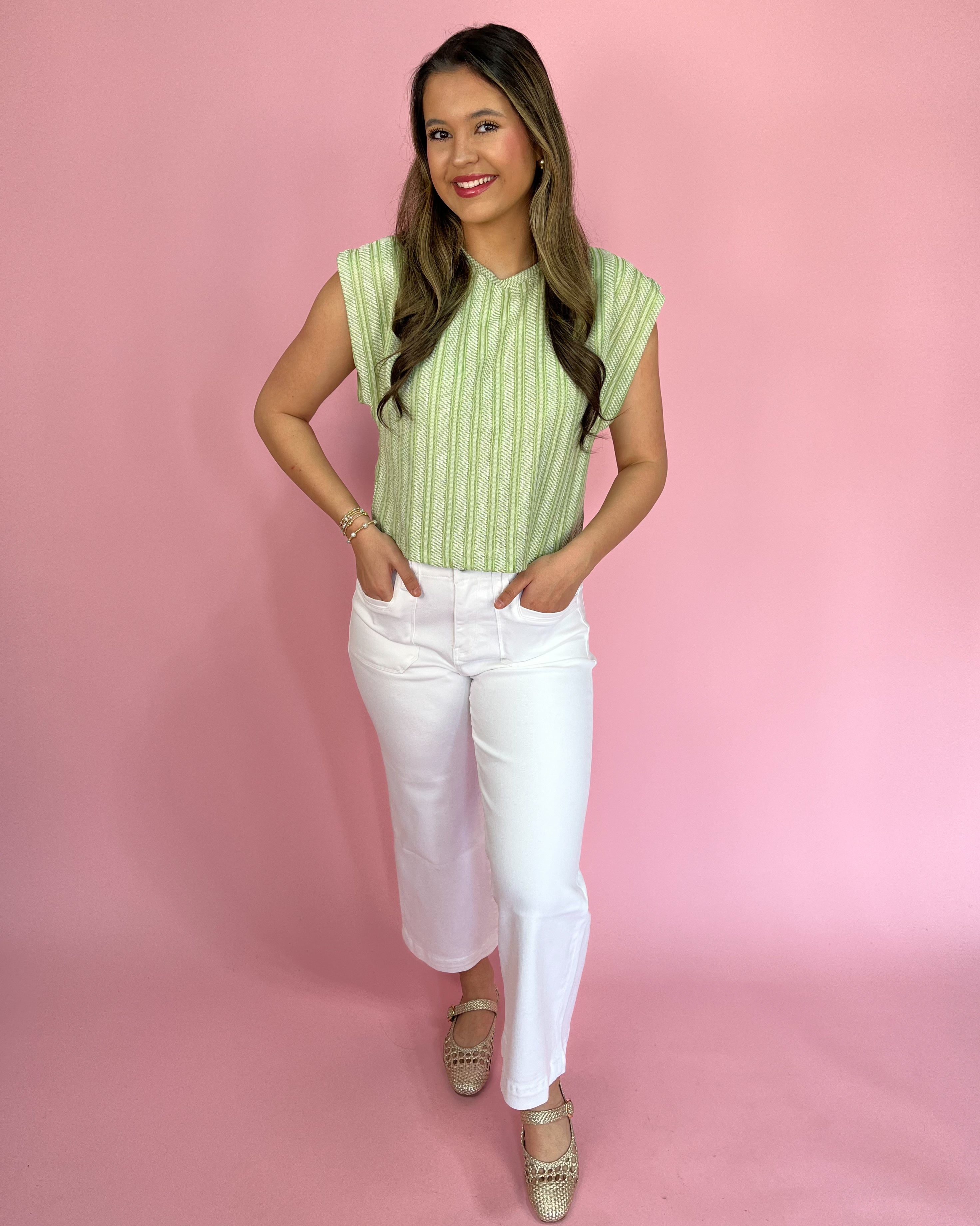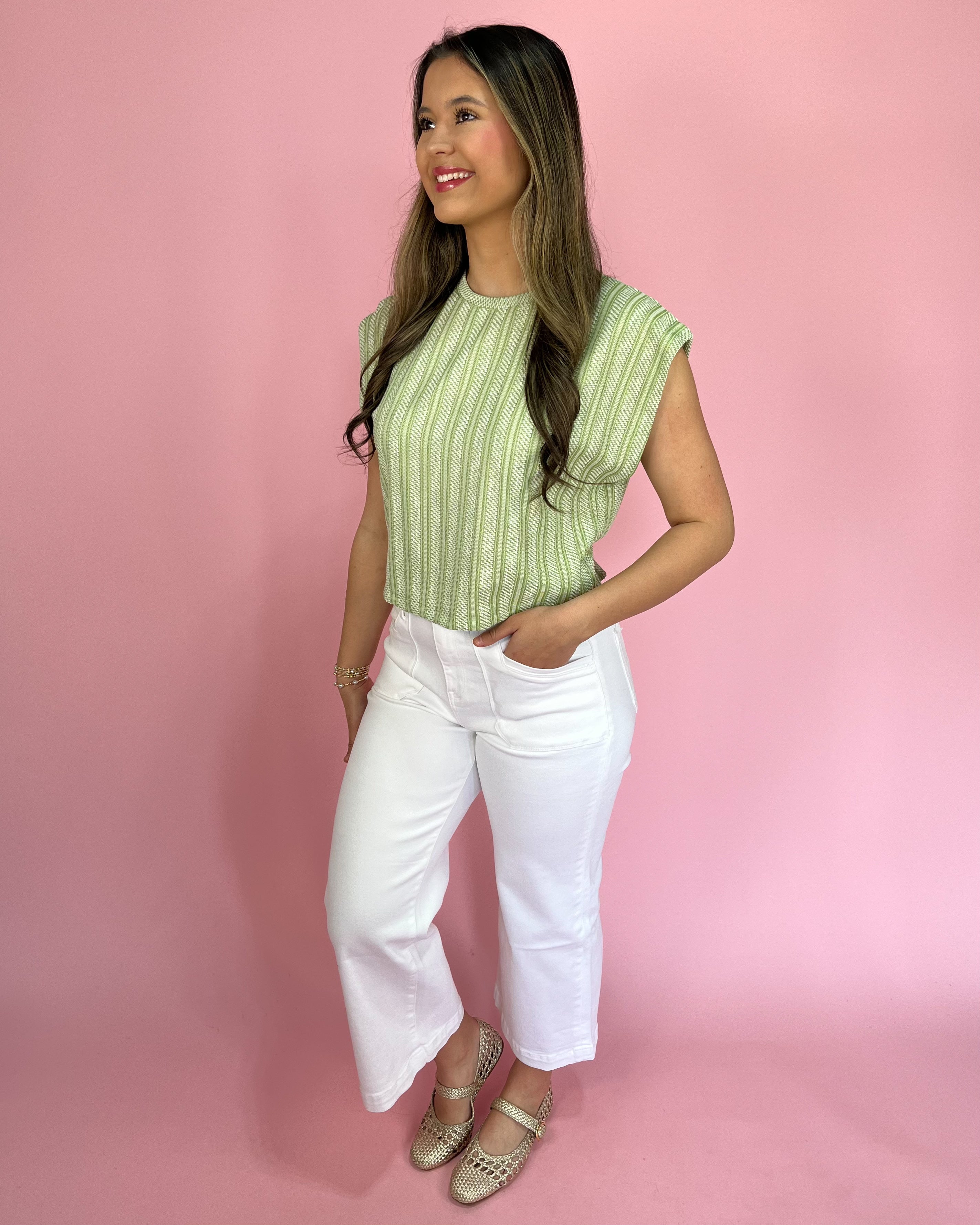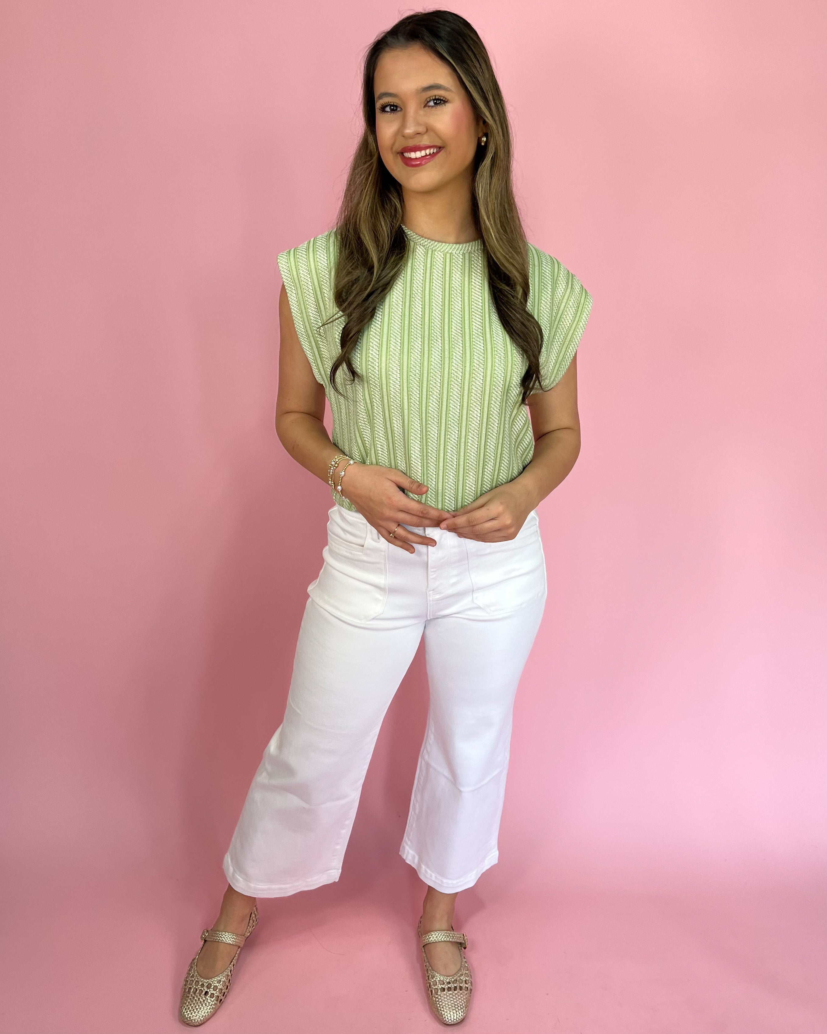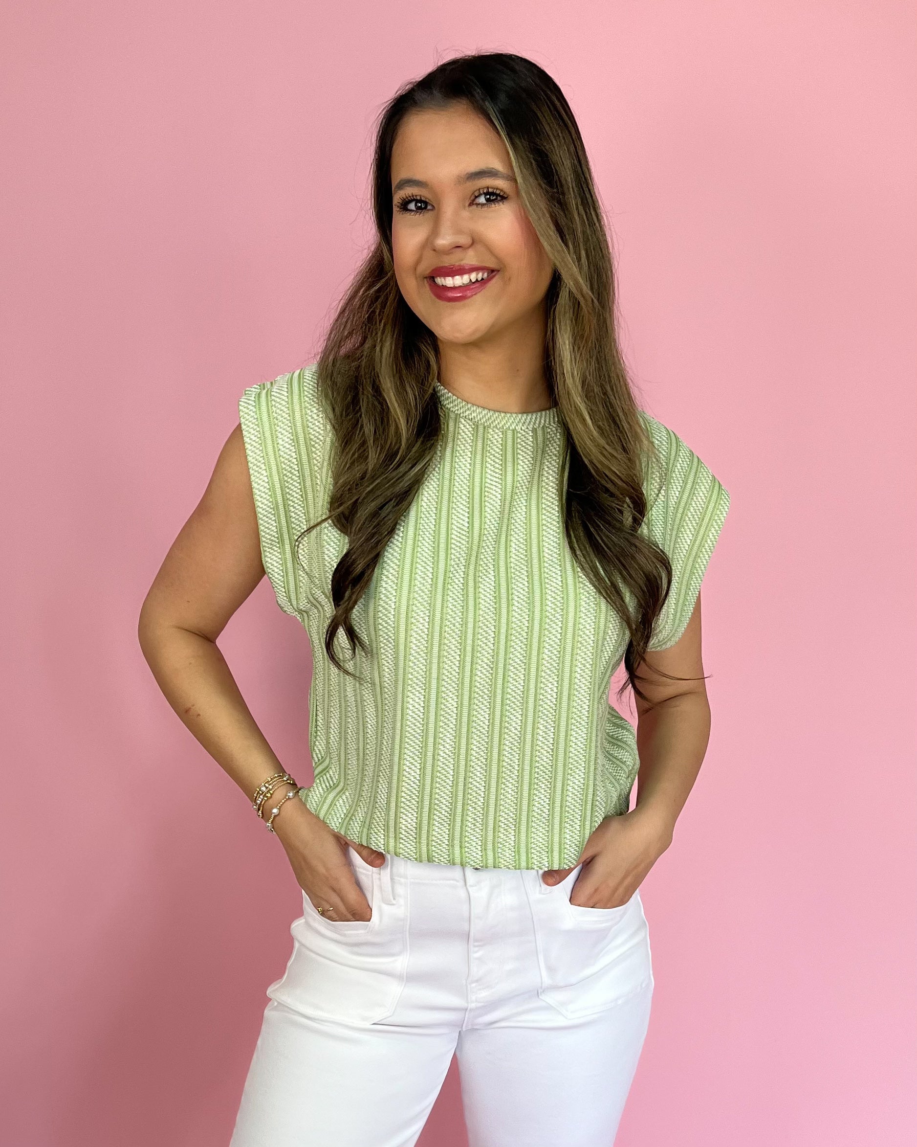 Soft texture meets everyday polish in this easy knit top you’ll keep reaching for. The subtle green-and-ivory woven pattern adds visual interest while staying neutral enough to pair with just about everything in your closet. Lightweight and breathable, it’s perfect for warm days or easy layering.