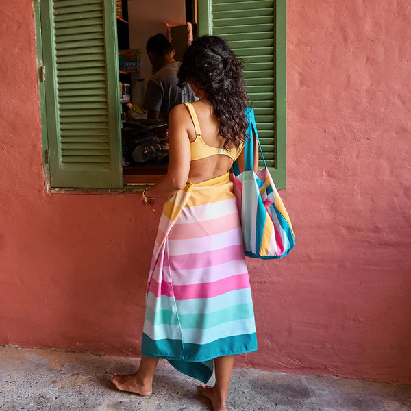 Made with signature DryQ™ fabric and woven from 100% recycled post-consumer plastic, this towel is ultra-absorbent, sand-free, and dries three times faster than cotton. It’s extra large for lounging comfort yet lightweight and compact enough to pack easily for every getaway. Each towel comes neatly folded in its own matching travel pouch, making it ready for every swim, sunbathe, and seaside adventure.