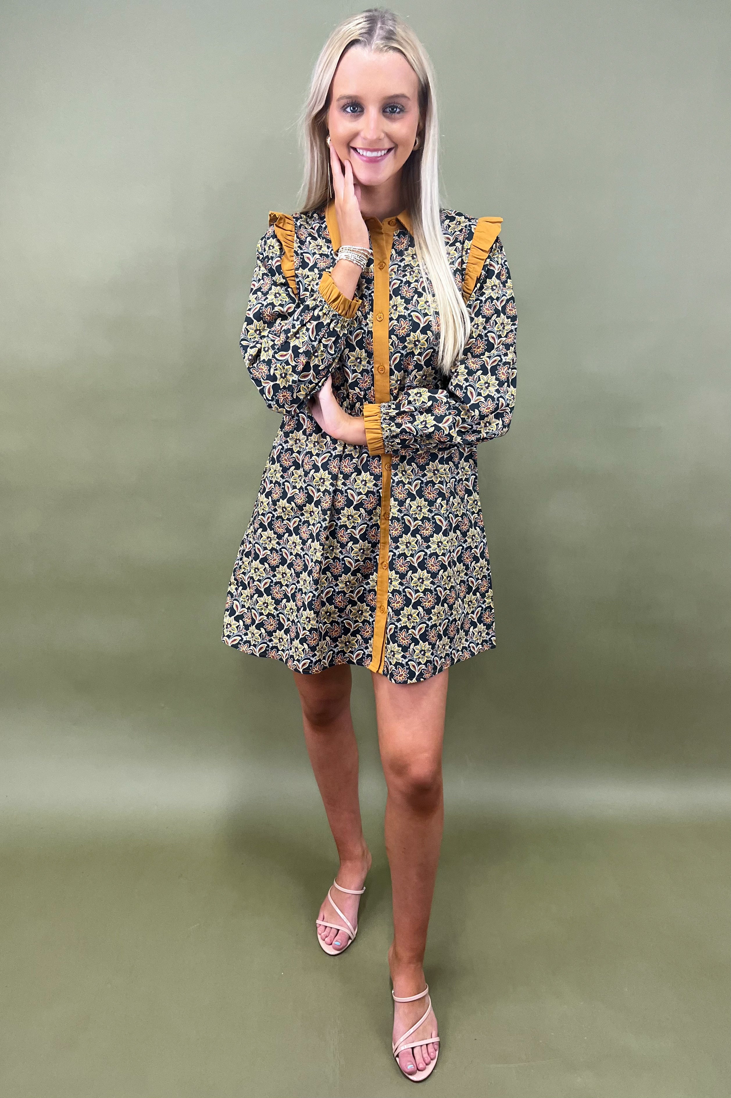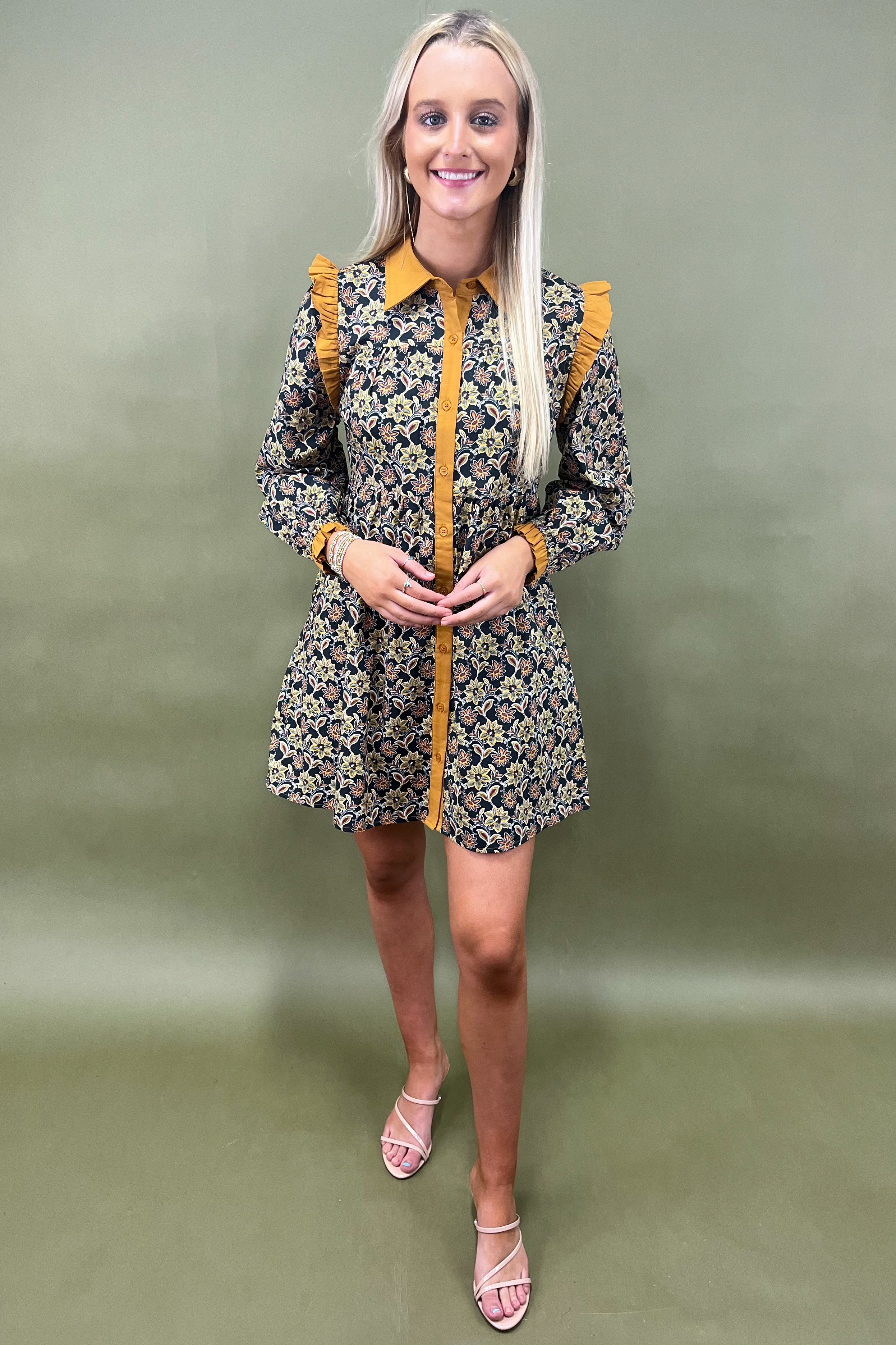 Let’s talk design details — because this dress is full of them. The mustard collar and matching trim create a striking contrast against the dark, floral background, pulling out every little petal and leaf in the print. Long sleeves with buttoned cuffs give you styling flexibility: keep them crisp and buttoned for a sharp look, or roll them up for effortless, weekend vibes. Ruffle accents on the shoulders add that playful, feminine touch that sets boutique fashion apart 💛.