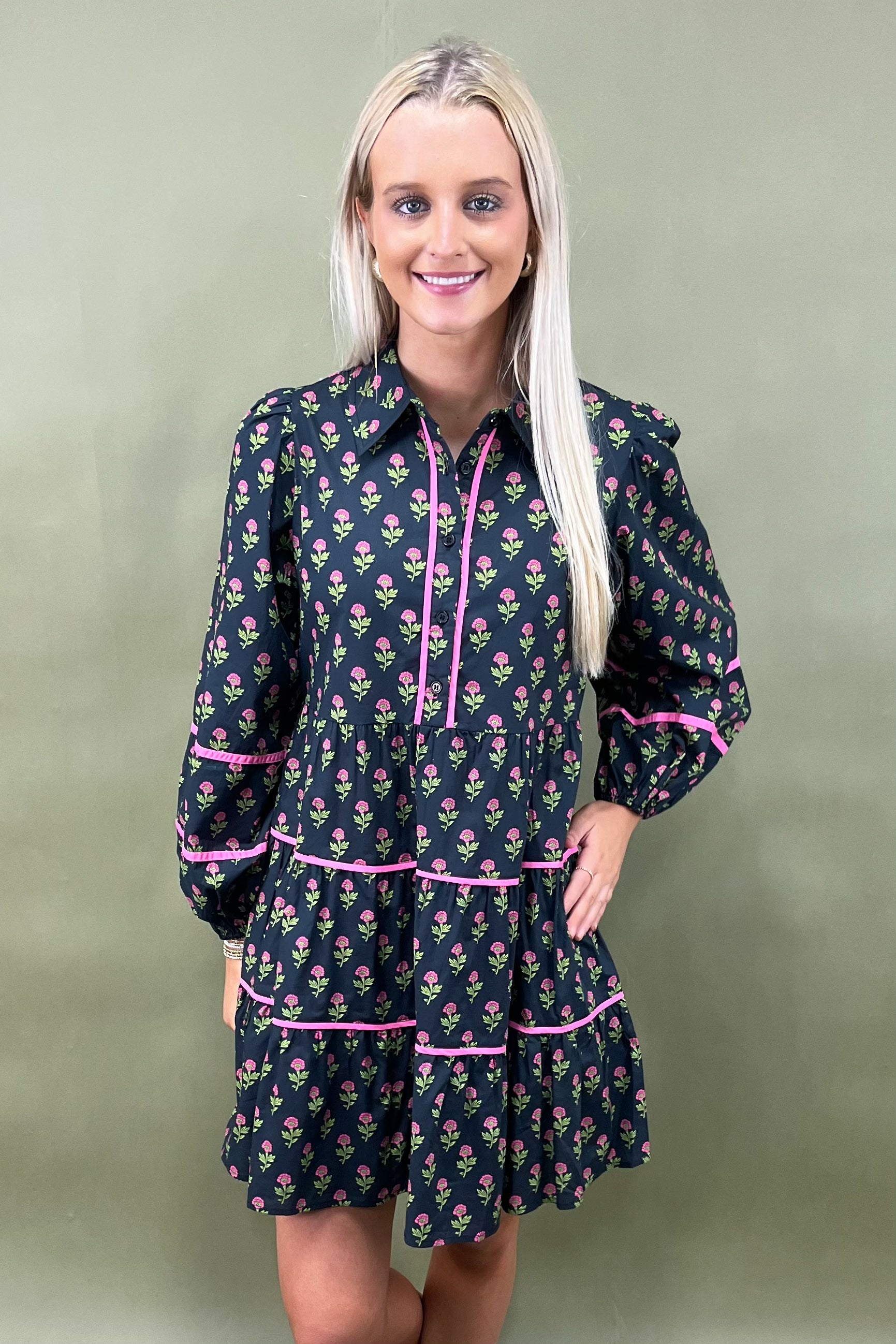 When playful charm meets timeless elegance—you get this beauty. The Midnight Bloom Collared Dress is an eye-catcher with its vibrant floral print of pink blossoms and fresh green leaves that pop against a bold black background. Add in those sweet pink piping details and you’ve got a dress that feels both vintage-inspired and modern chic 🌿💕.