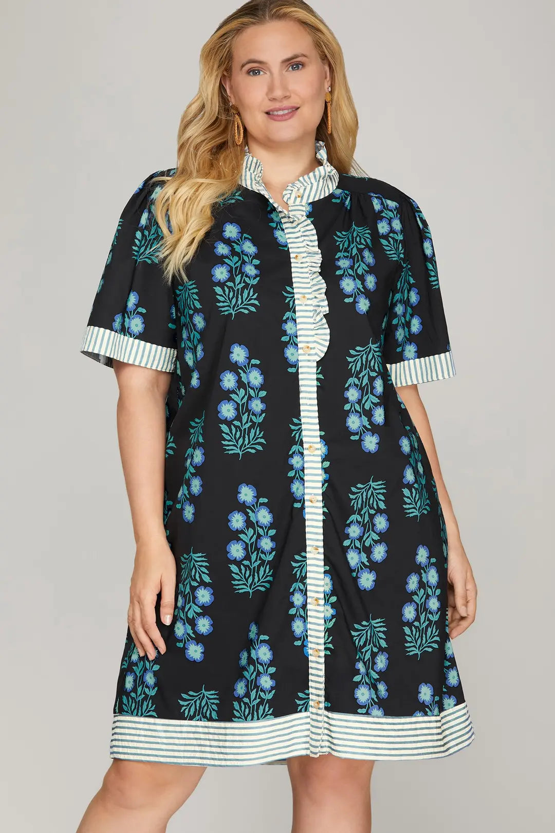 The PLUS Moonlit Floral Mini Dress is giving effortless elegance with a touch of whimsy 🌙💙. Designed with a rich black base and soft blue floral detailing, this dress feels romantic yet easygoing, perfect for days when you want to feel put together without trying too hard ✨🌸. The striped contrast trim adds a charming, elevated touch that makes this piece truly stand out.