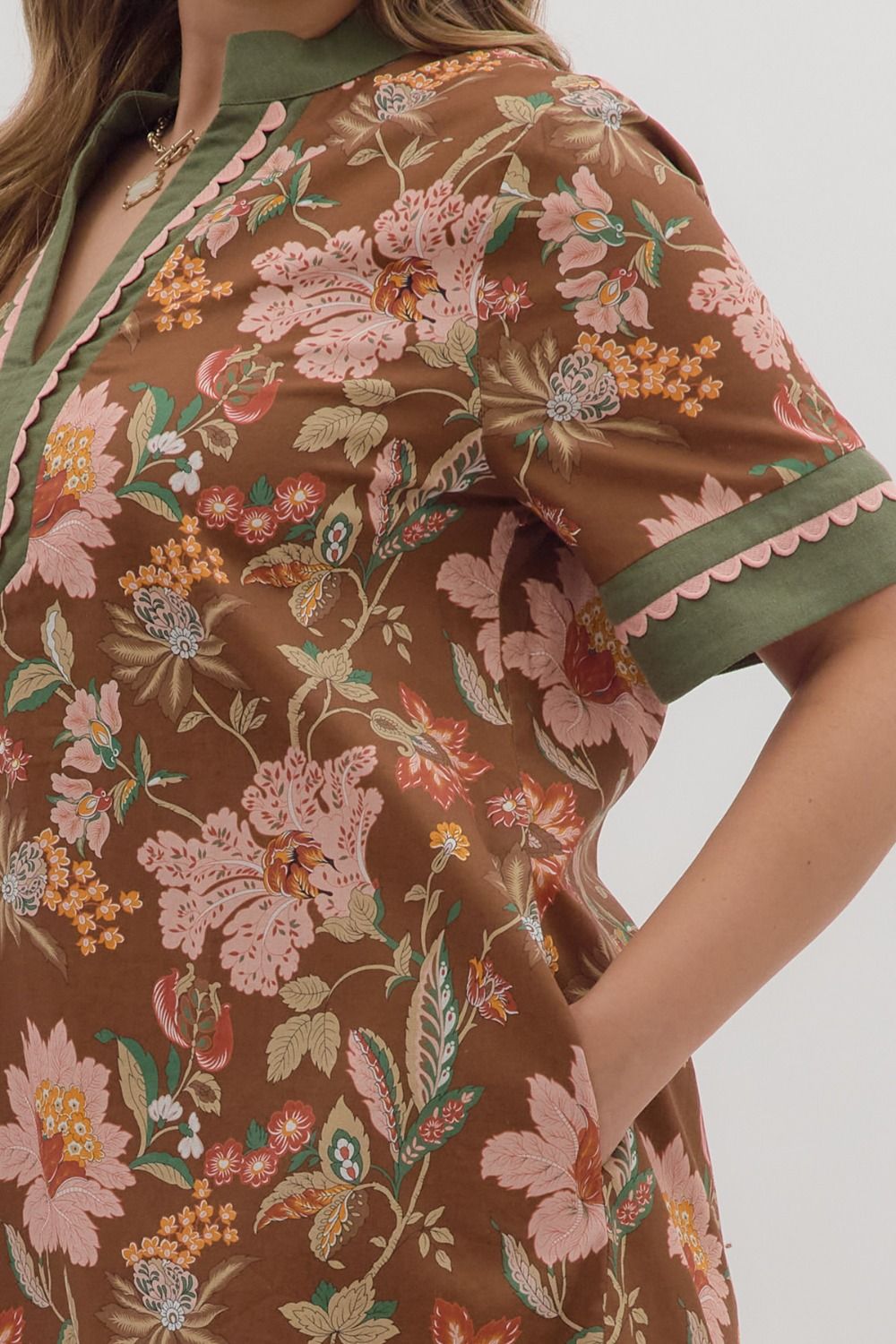 The neckline is framed with a contrasting deep green trim, accented by scalloped detailing for a whimsical, artisan-inspired touch. This detail not only draws the eye upward but also provides a structured yet playful finish that balances the bold florals. The same green trim is echoed along the hemline and sleeves, tying the entire design together for a cohesive, polished look.