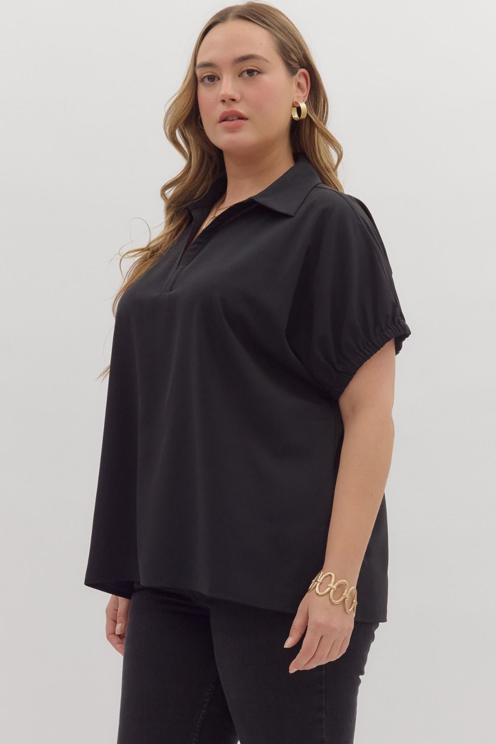 The PLUS Everyday Icon Collared Top features a relaxed fit that skims the body without clinging. The v-notch neckline flatters while the elasticized sleeves add shape and balance. The length makes it easy to wear untucked for flowy comfort or tucked in for a cleaner, more refined finish.