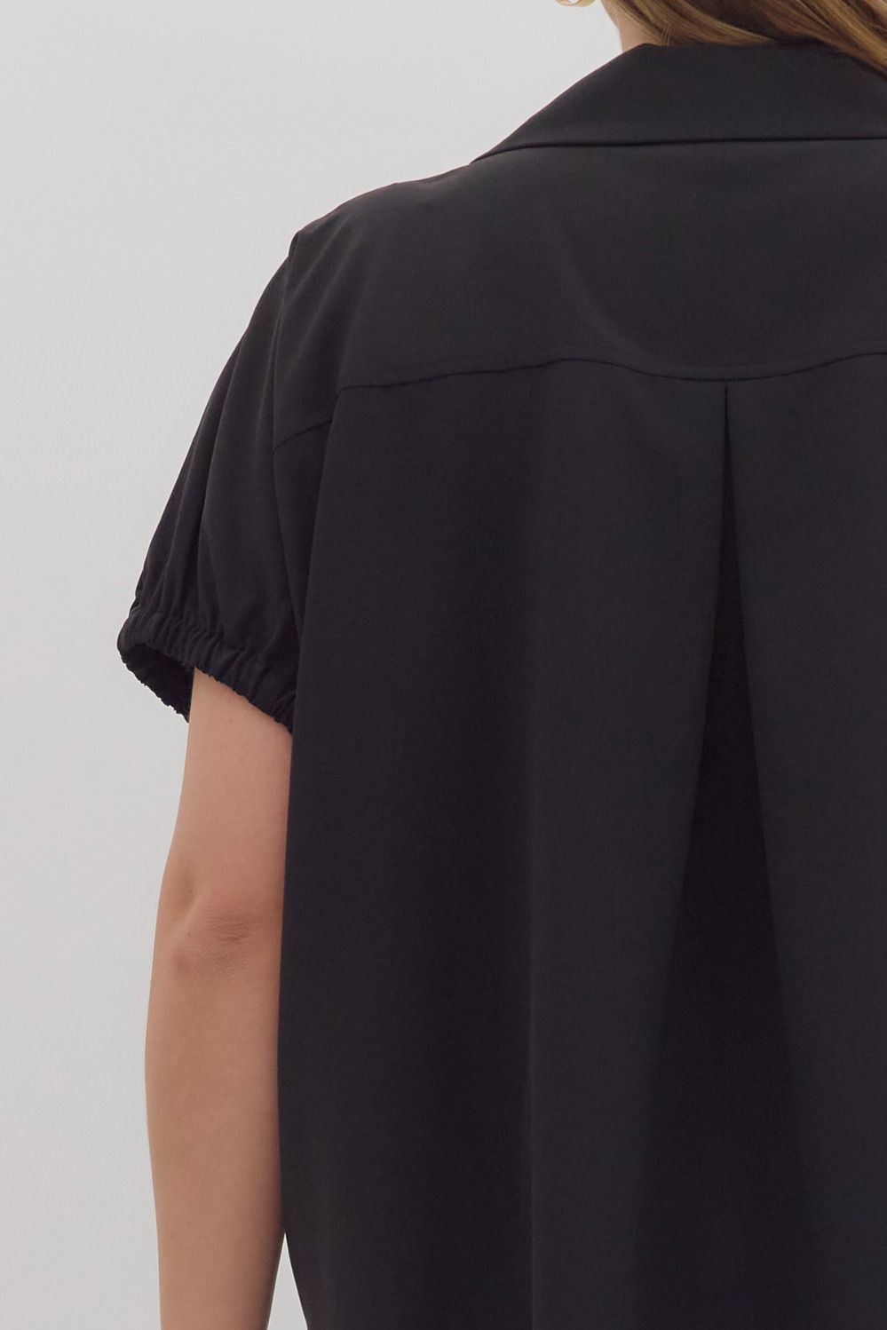 Made from 100% polyester, it’s lightweight, easy to care for, and drapes beautifully. The collared neckline adds structure while the v-notch front keeps it relaxed and breathable—like the perfect mix of business and brunch. Short sleeves with gathered elastic edges add a subtle feminine twist, giving the top shape without feeling fussy. It’s polished enough for the office, comfy enough for errands, and stylish enough for dinner plans. Basically, a triple threat.